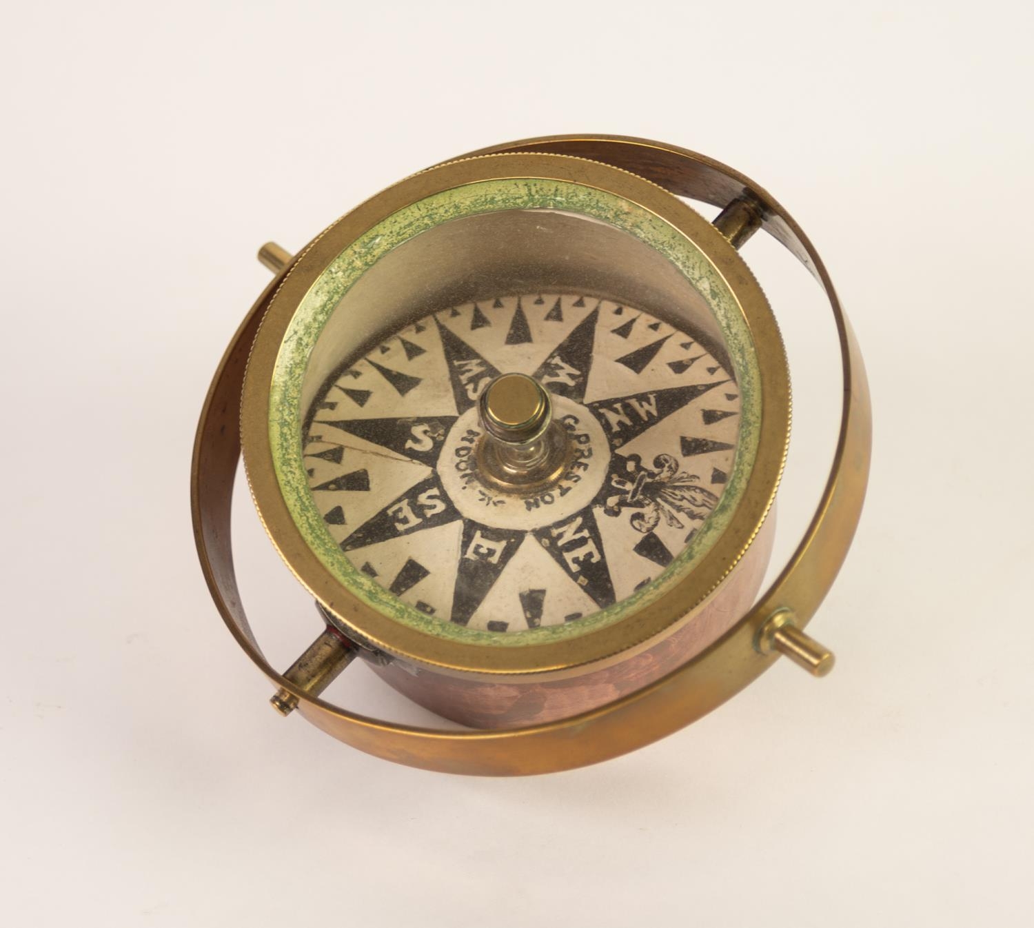 G. PRESTON, LONDON, BRASS AND COPPER COMPASS, 4in (10.1cm) diameter, on gimbal frame