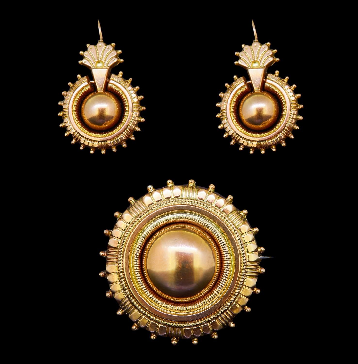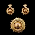 ANTIQUE VICTORIAN BROOCH AND EARRINGS SET, the brooch of round design, with a smooth bulging centre, decorated with balls to the outer surmount and a locket back. The earrings designed with a shell shaped top, suspending a half ball, with a movable surmount decorated with balls. Diam. brooch 3.3 cm. L. earrings 2.8 cm. 11.4 grams.