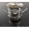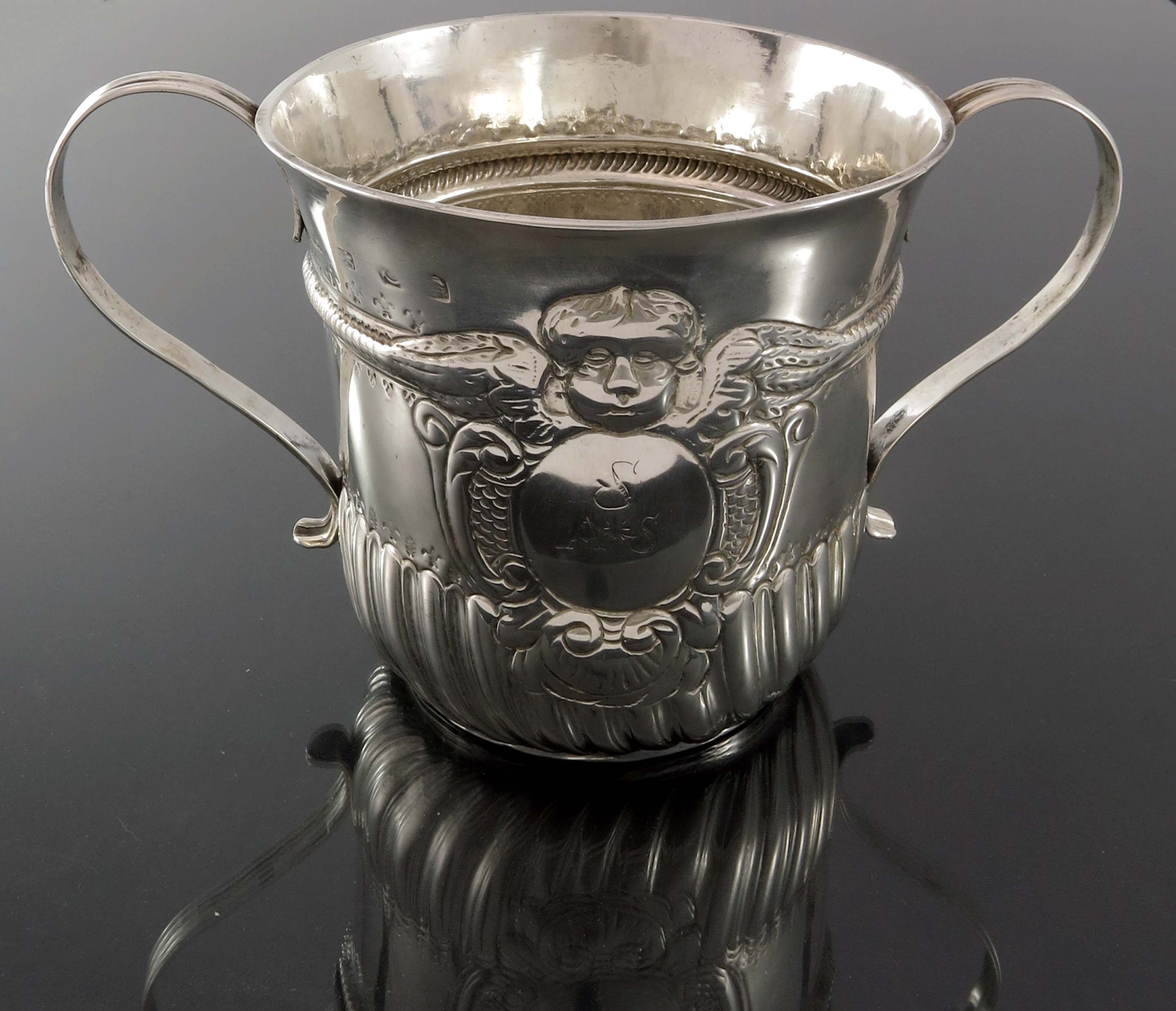 A George II silver porringer, William Darker, London 1731, twin handled, gadrooned to the lower third, below an embossed winged putto cartouche and ropetwist band, punched with fleur de lys and leaf motifs, fluted S scroll handles, 12.5cm high, 10.95ozt