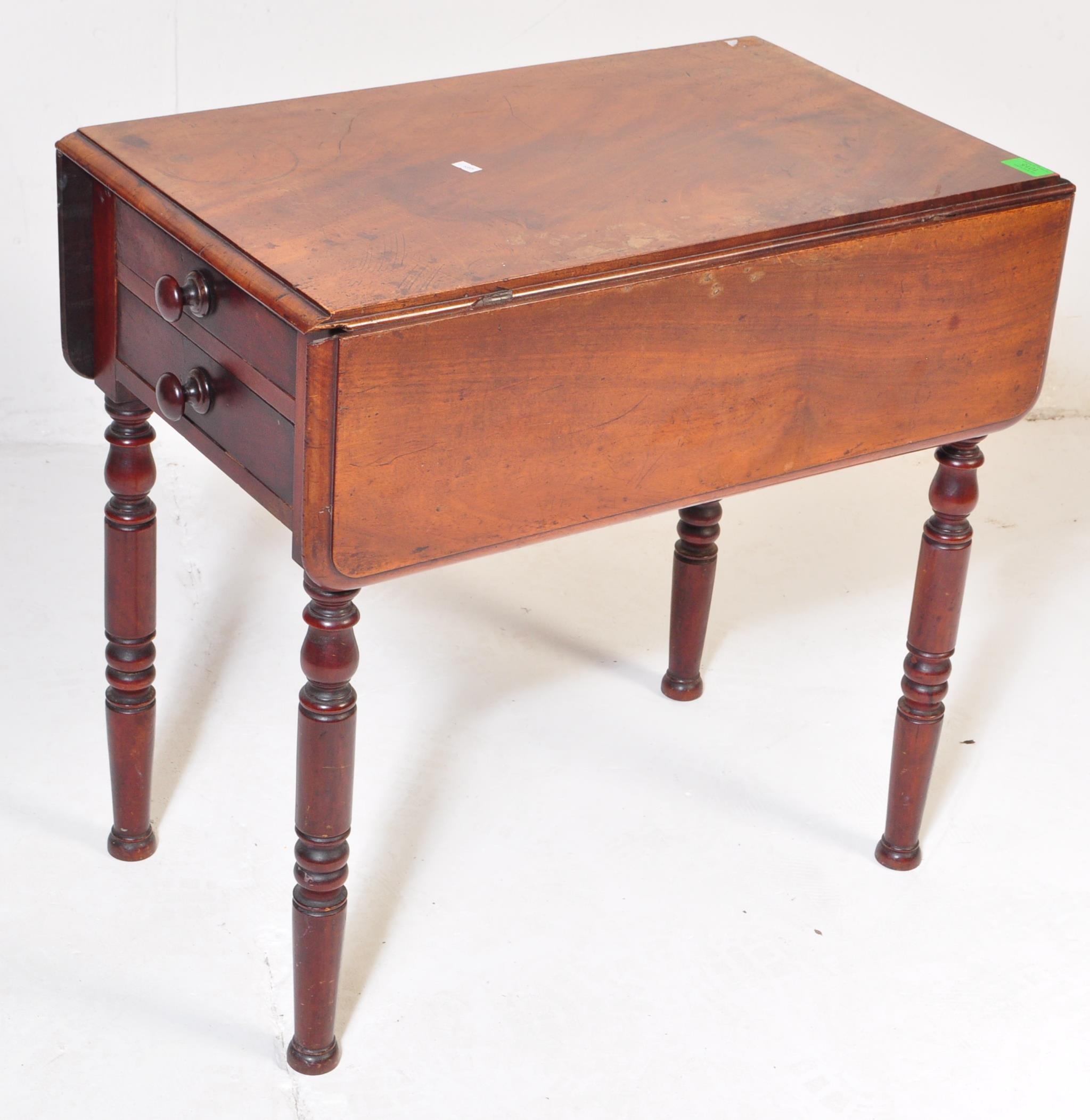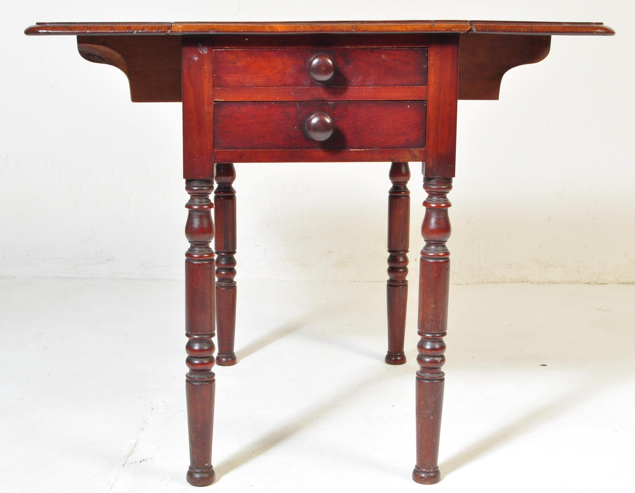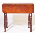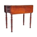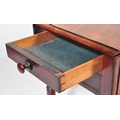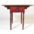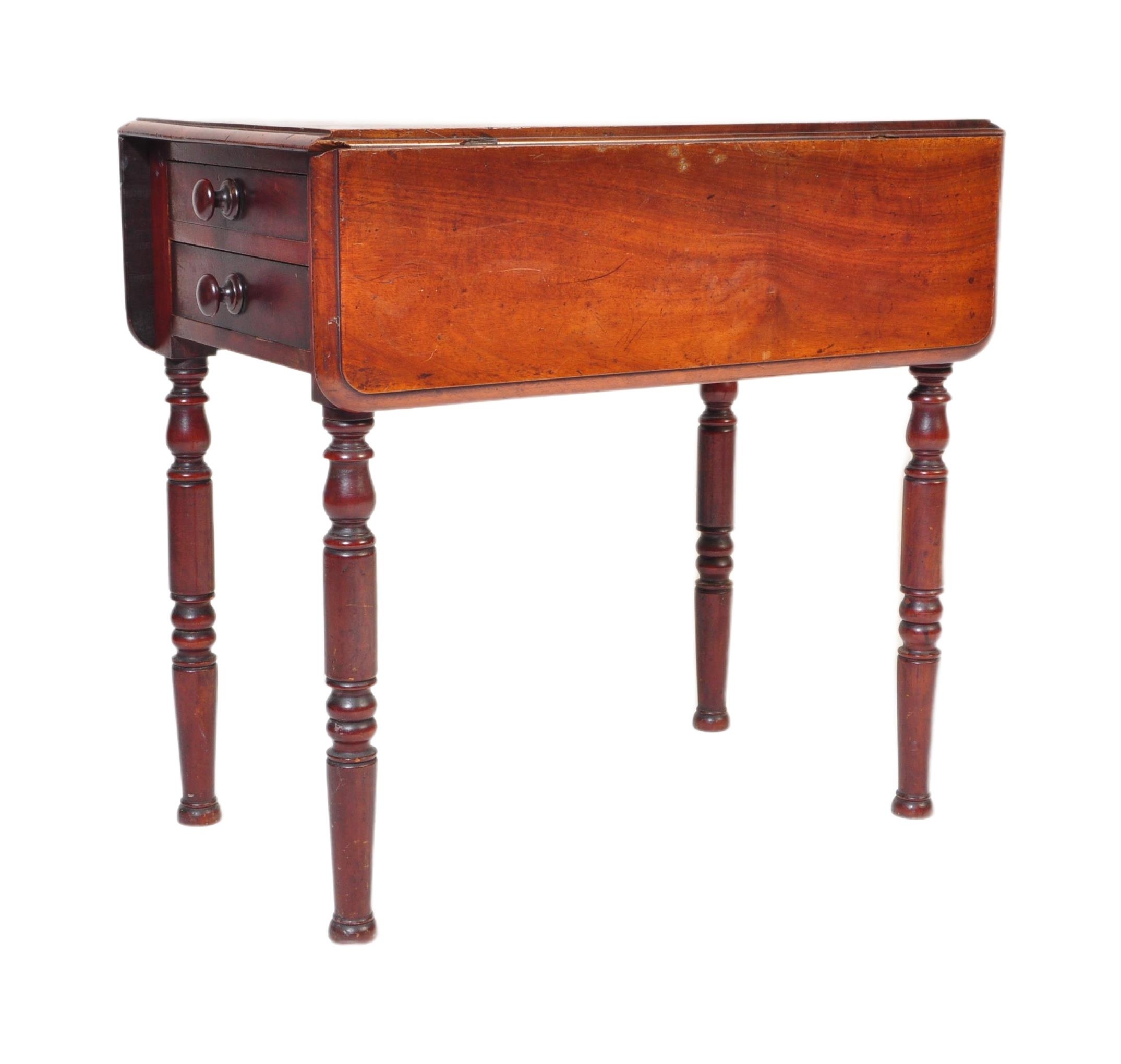 A 19th century George III mahogany ladies drop leaf work table. Raised on turned legs with fitted frieze having twin drawers to one end with knob handles. Drop leaves to either side raised on fly supports