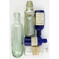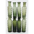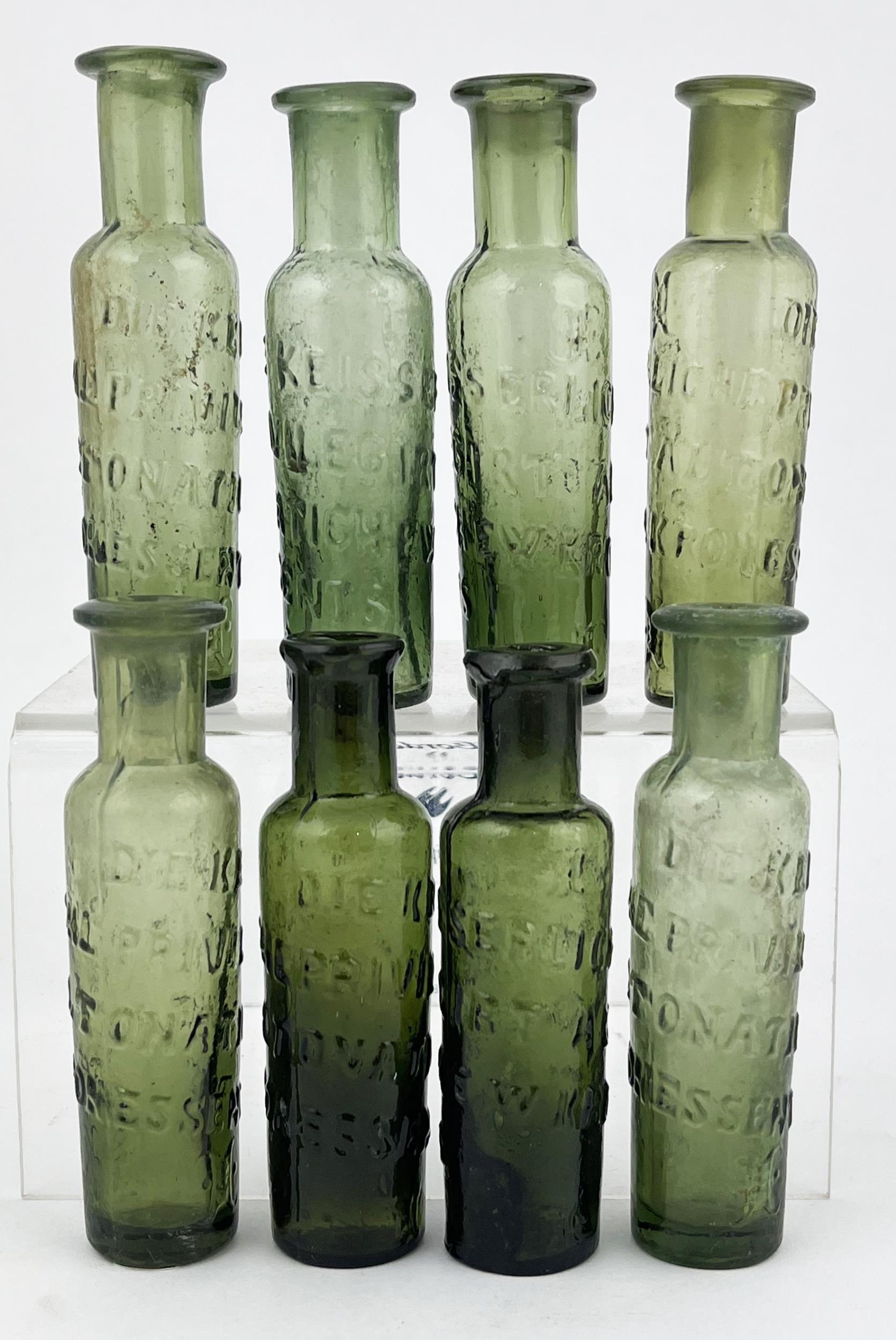 GERMAN CURE BOTTLES GROUP. Tallest 3.75ins. Embossed in spiral direction, various coloured green glass. Minor damage. (8)