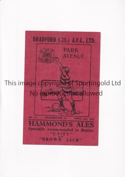 BRADFORD PARK AVENUE V PRESTON NORTH END 1945 Red issue programme for the match at Bradford 2/4/45, horizontal fold and slightly creased. Generally good