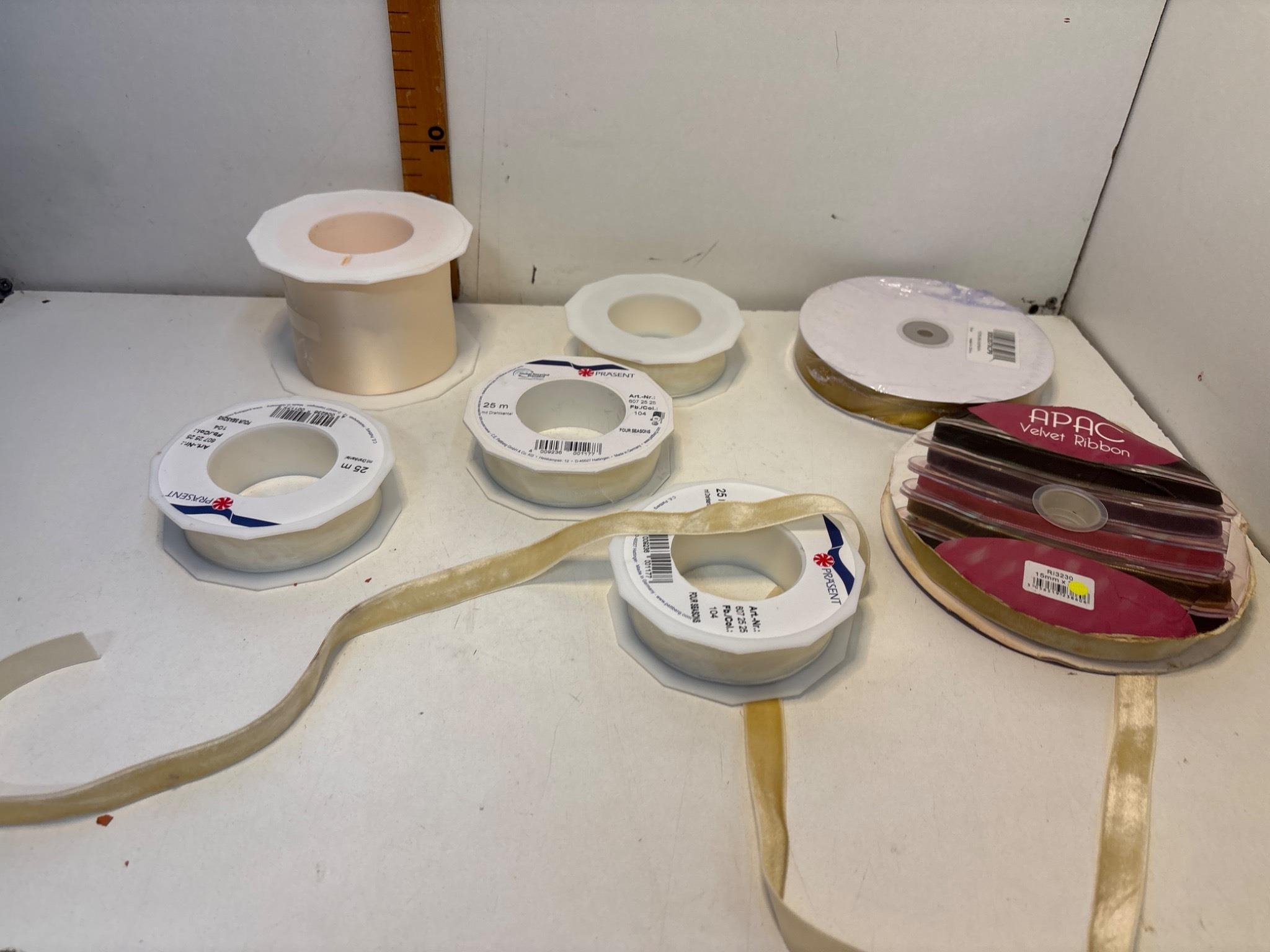 Ribbon rolls in various sizes, materials, and colors. Includes single and multi-color spools, some partially used. Ideal for crafting or gift wrapping projects.