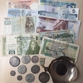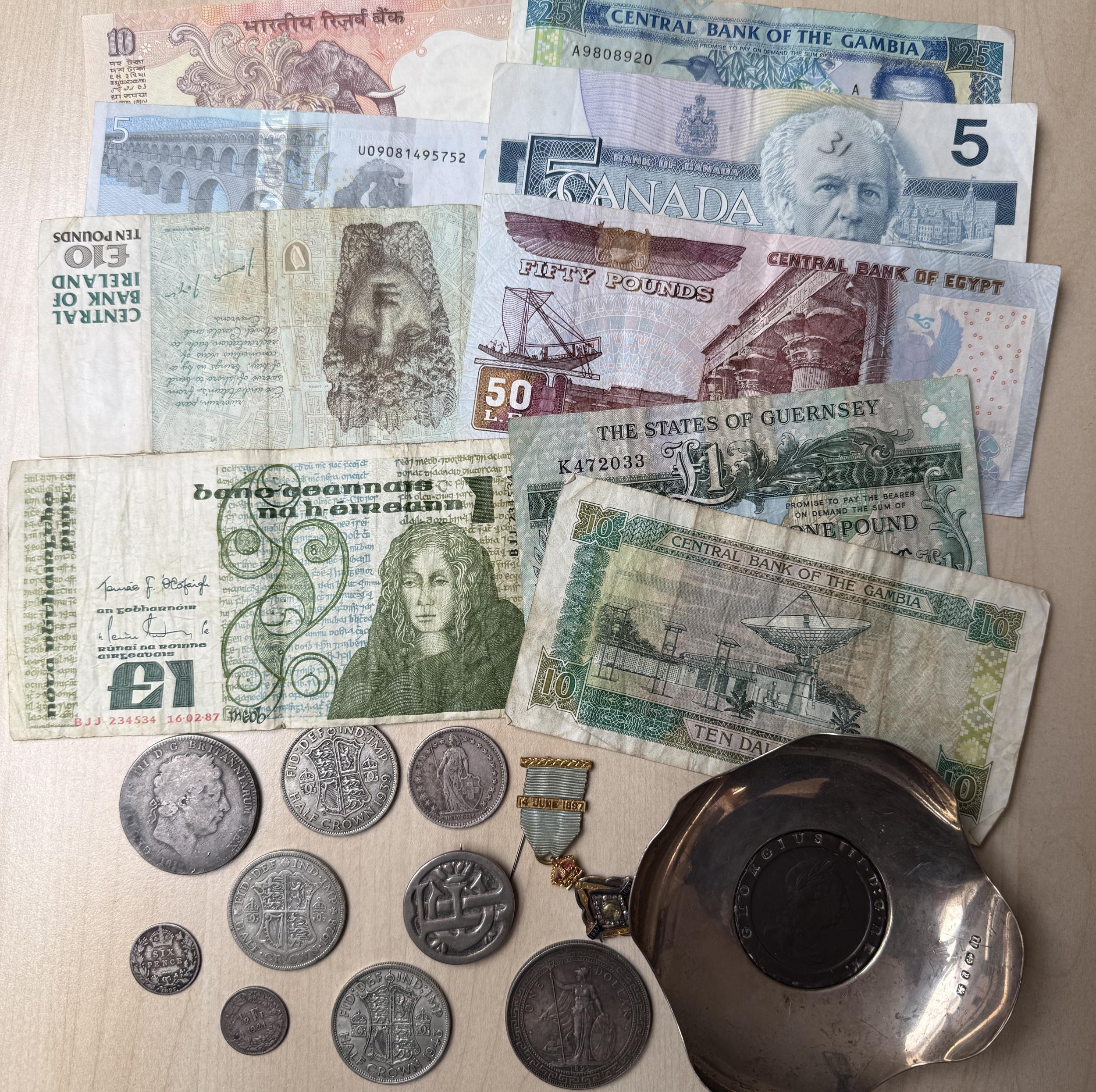 A collection of mainly 20th Century circulated coins and banknotes in shoebox, strength in Egypt and Eire banknotes and UK 19th Century coins, mixed condition