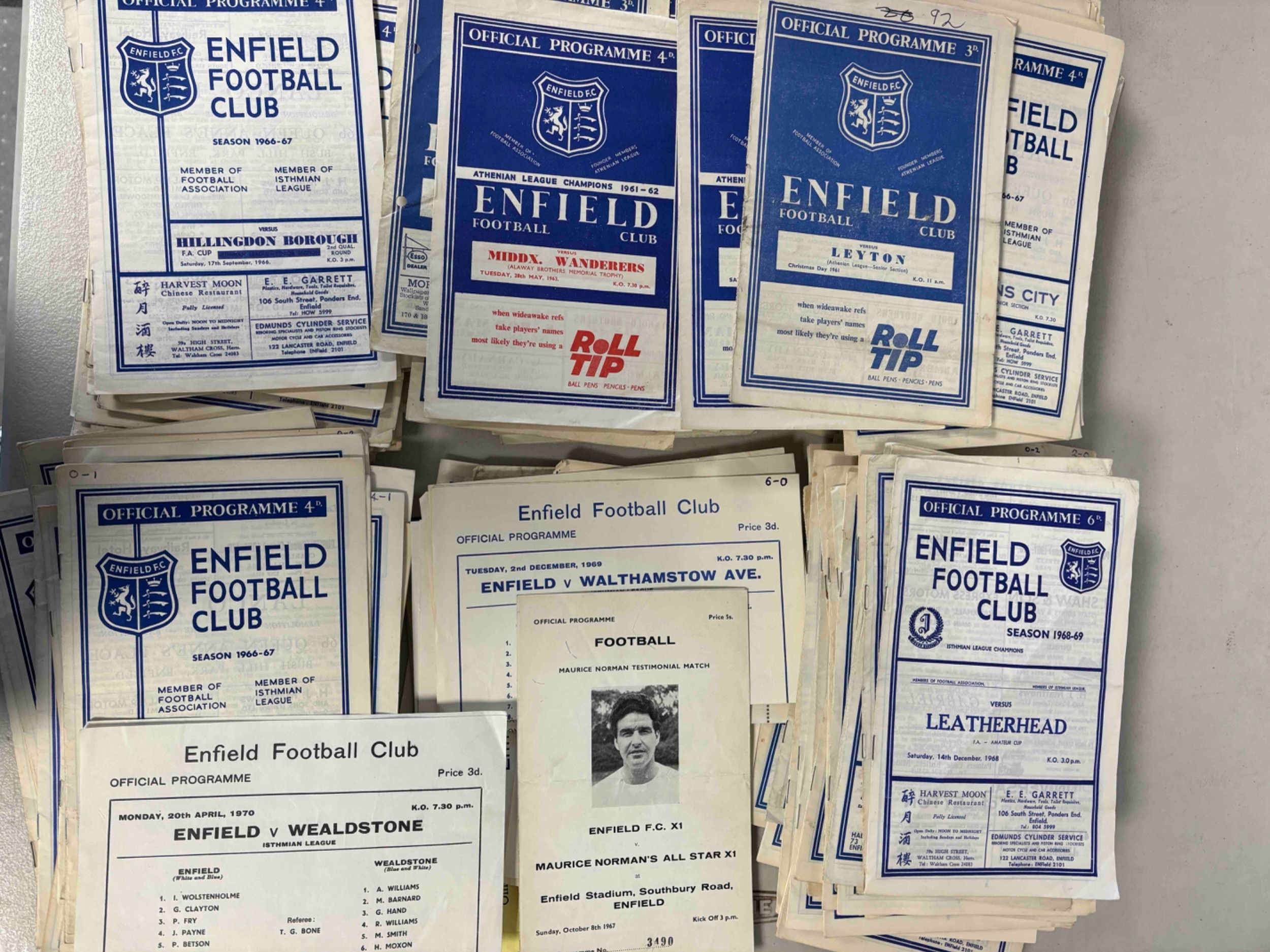 Enfield 1960s Non League programmes, inc S/S, frendlies and Cups, some duplication, usual faults (300+)
