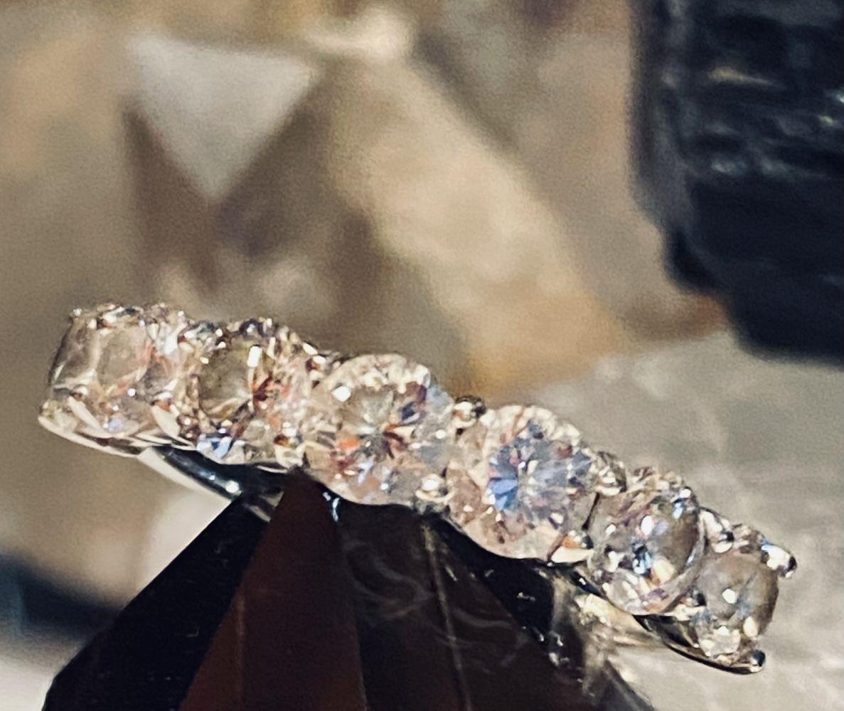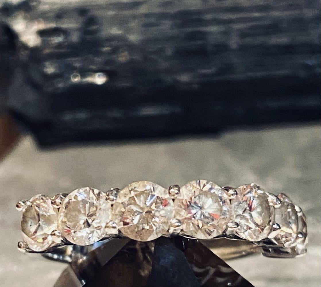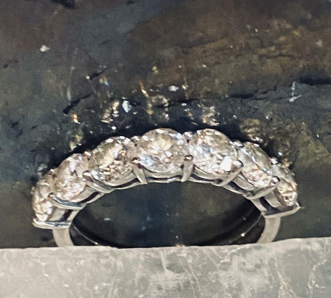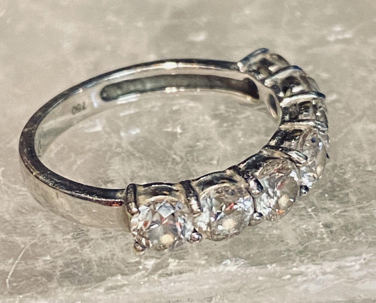AN 18CT WHITE GOLD 7 STONE DIAMOND RING, the diamonds in a claw setting. Total weight 2.20cts, with colour G & clarity of VS1. Ring size M.