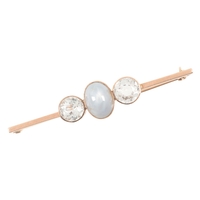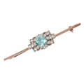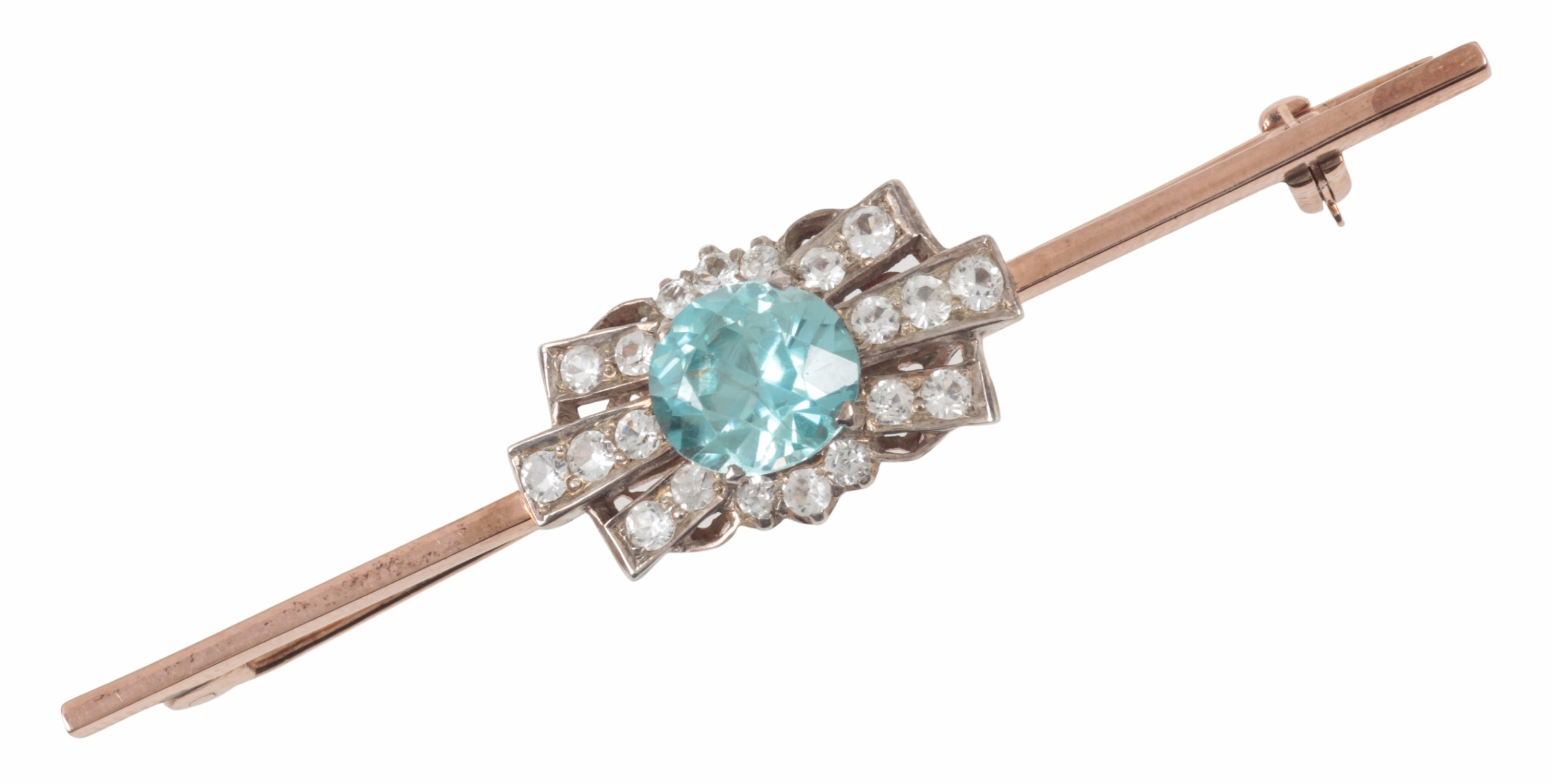 A BLUE ZIRCON WHITE SAPPHIRE BAR BROOCHthe round mixed cut zircon set with radiating set white sapphires, c. 65mm long, unmarked, gilded, c. 5.8 grams