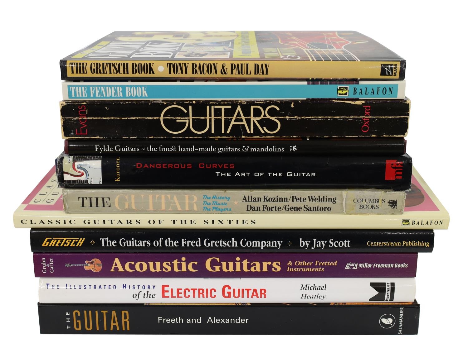 Twelve various guitar reference books to include Fylde Guitars, Dangerous Curves - The Art of Guitar, Gretsch Guitars, The Fender Book, The Gretsch Book and others