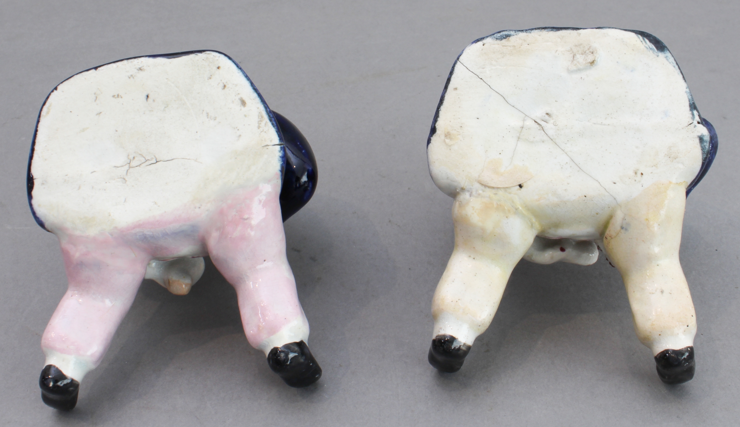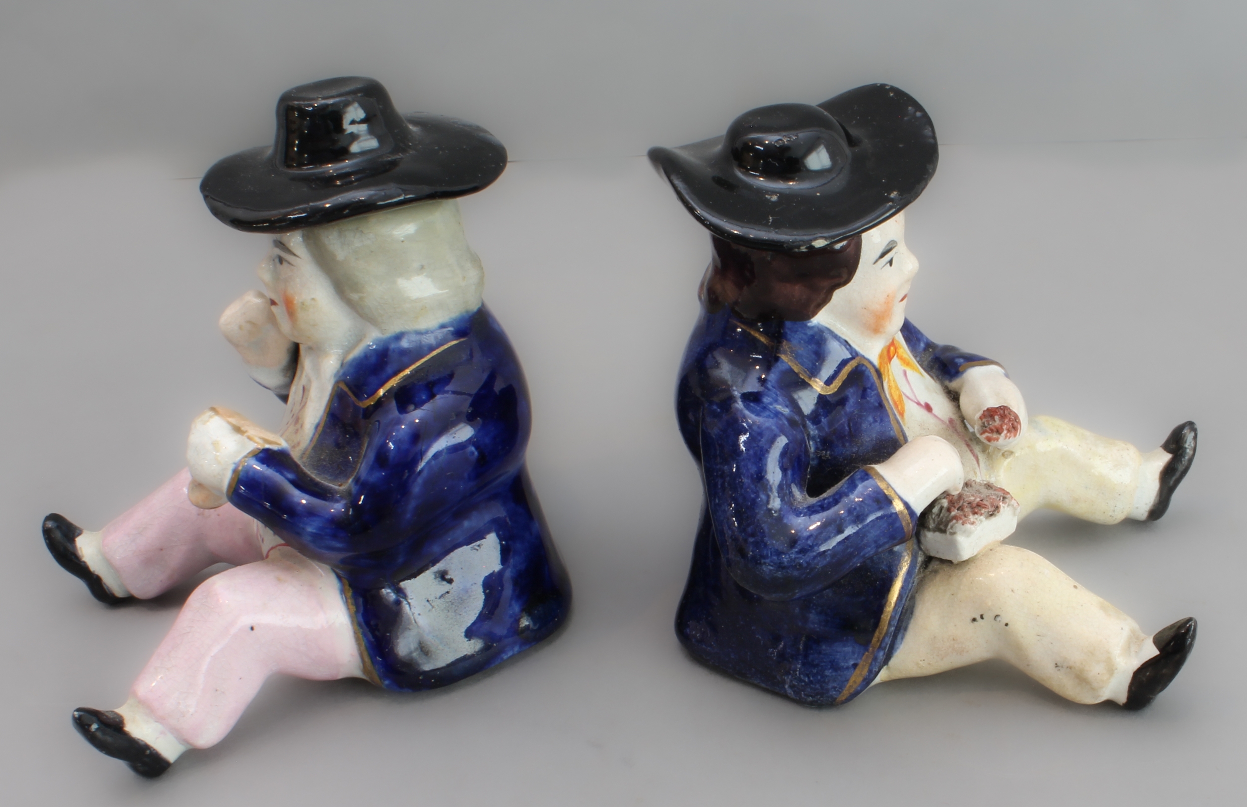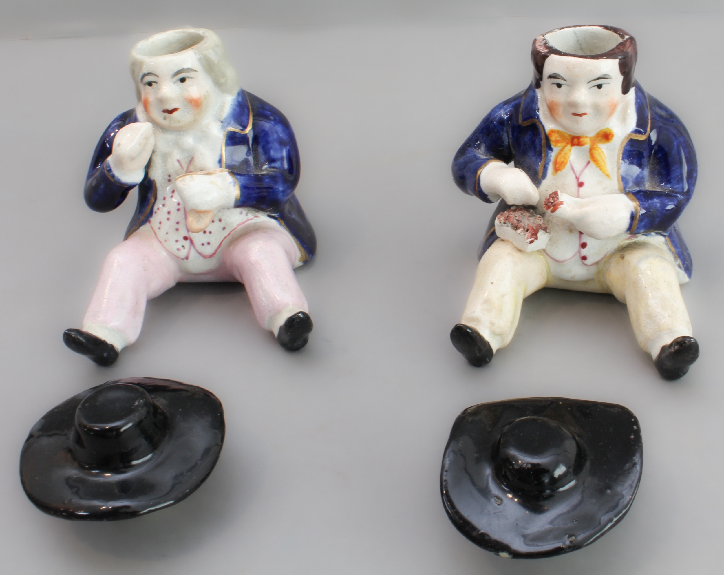 A pair of 19th century seated Staffordshire figures (as pots with removeable hats, minor damage) (8.5cm high) (2)