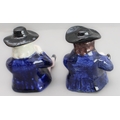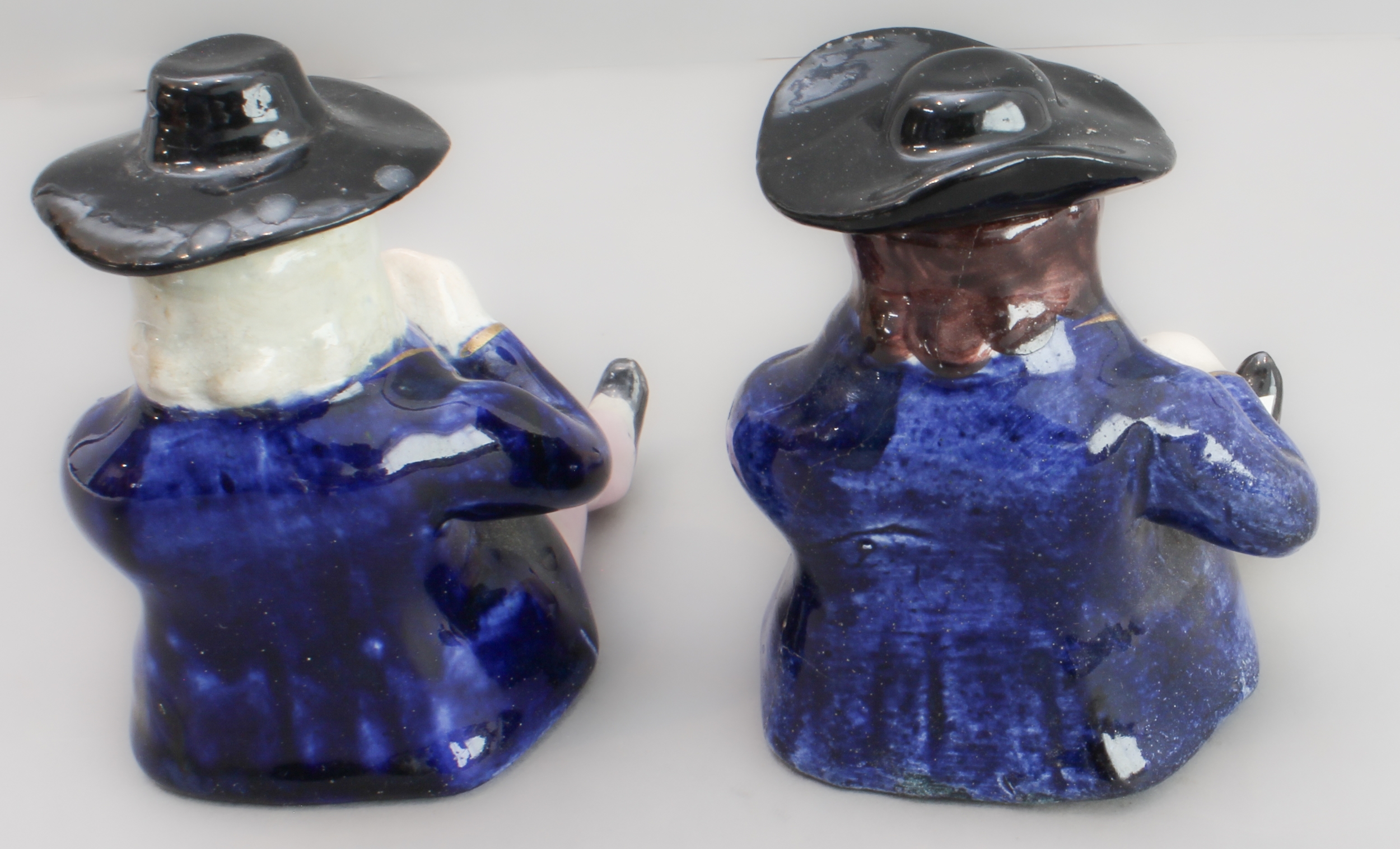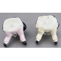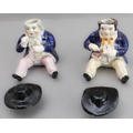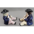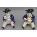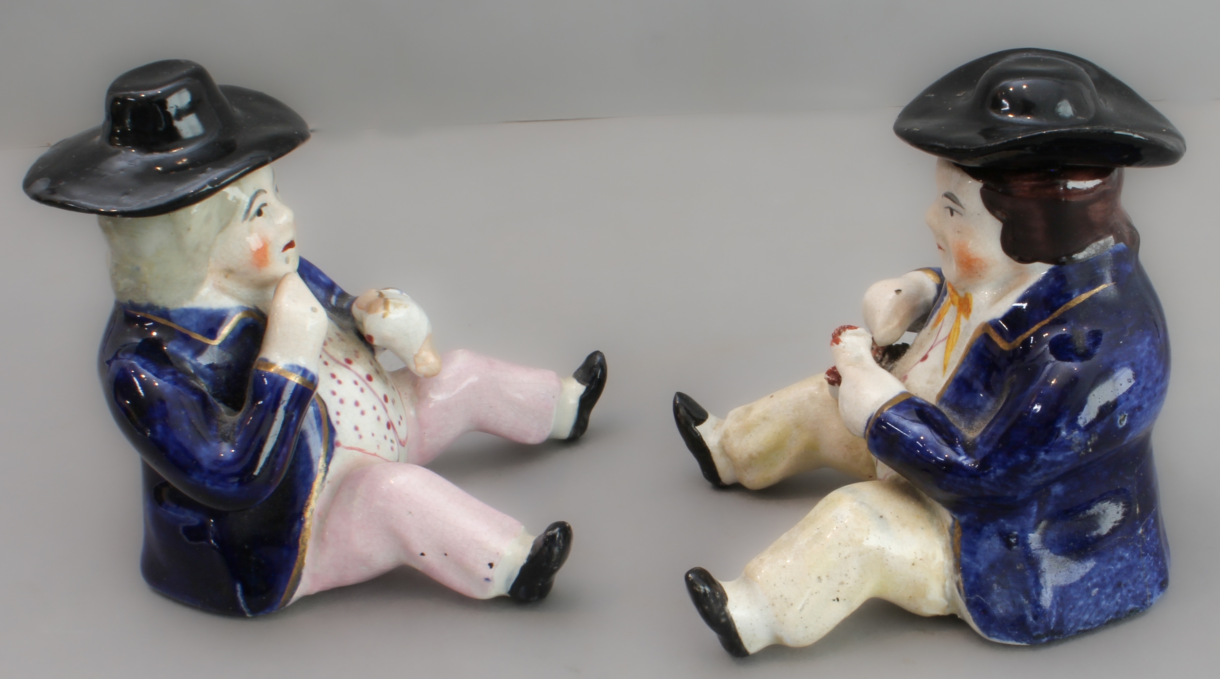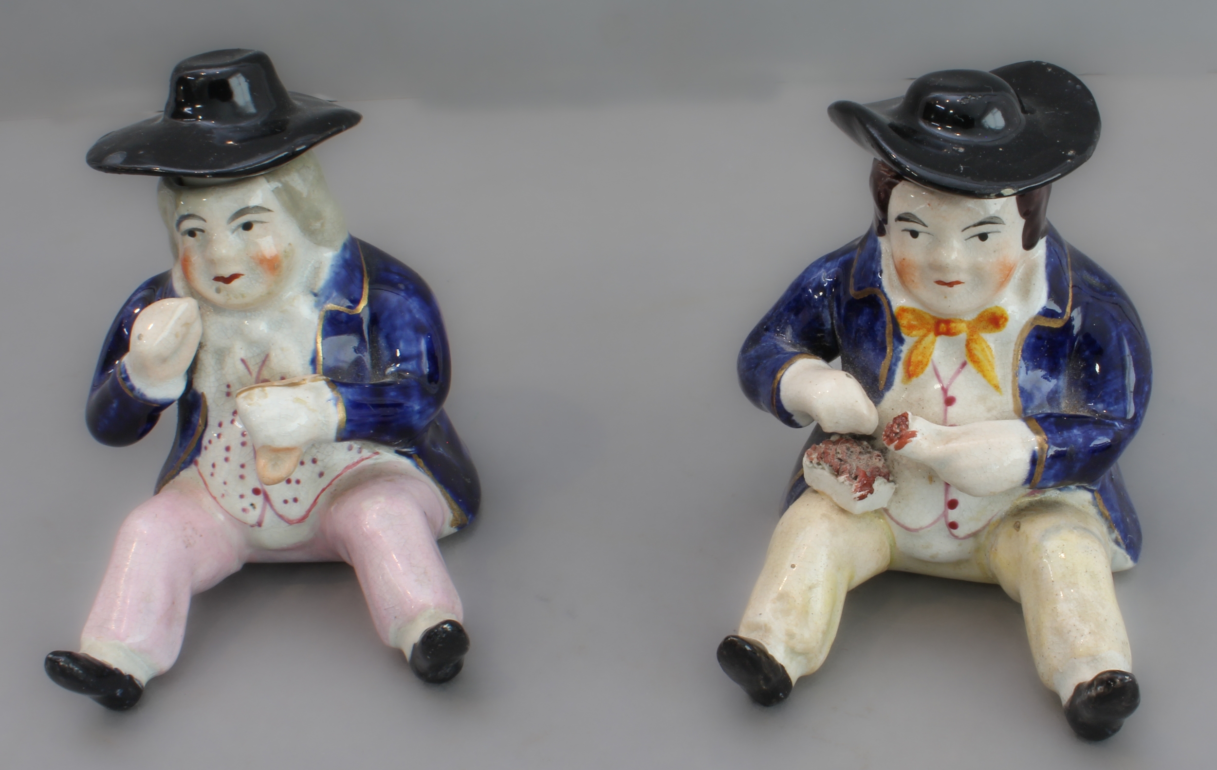 A pair of 19th century seated Staffordshire figures (as pots with removeable hats, minor damage) (8.5cm high) (2)