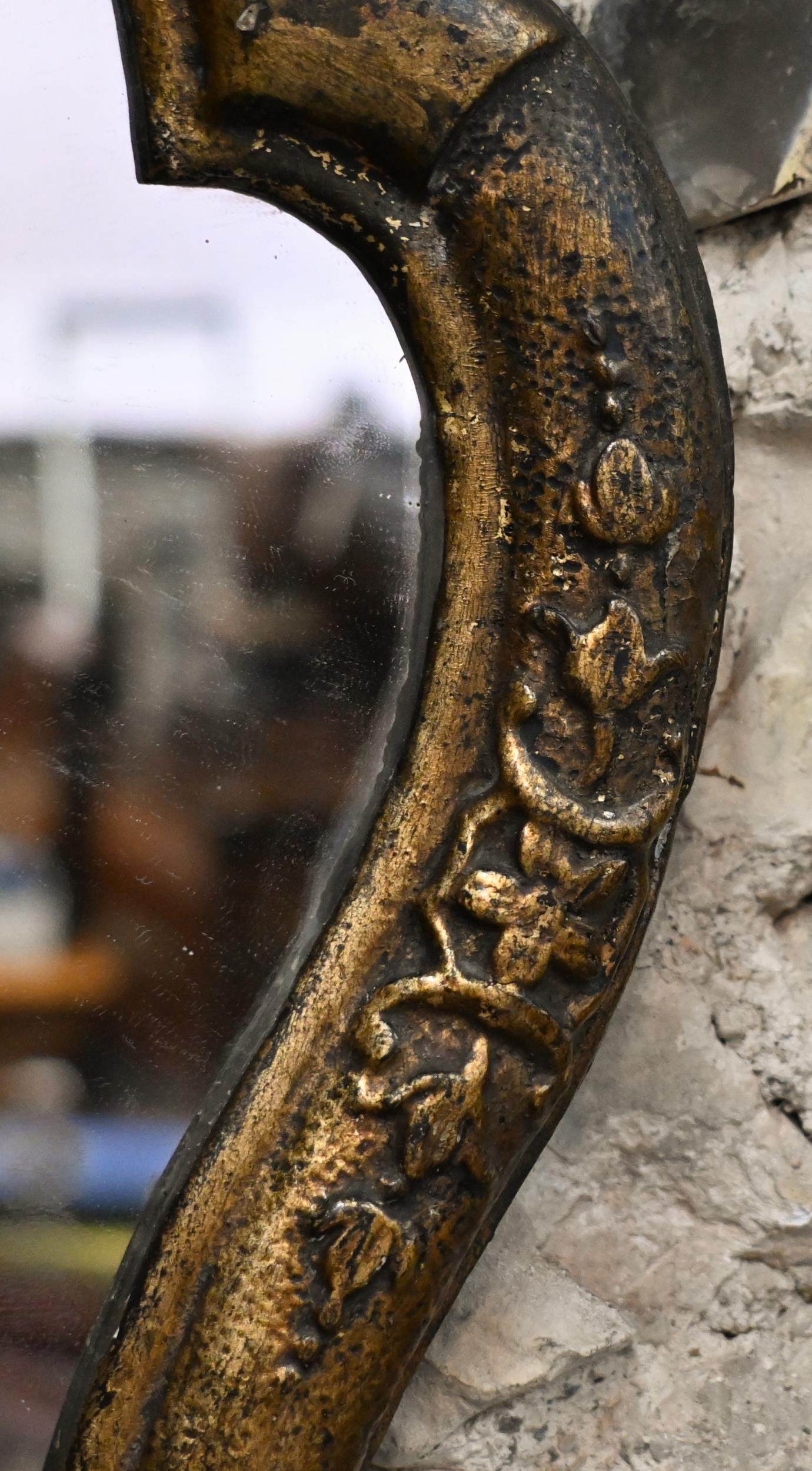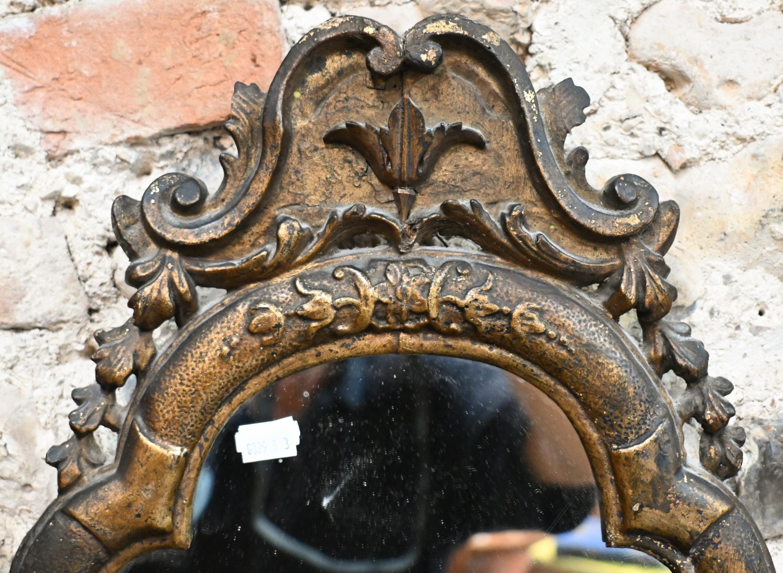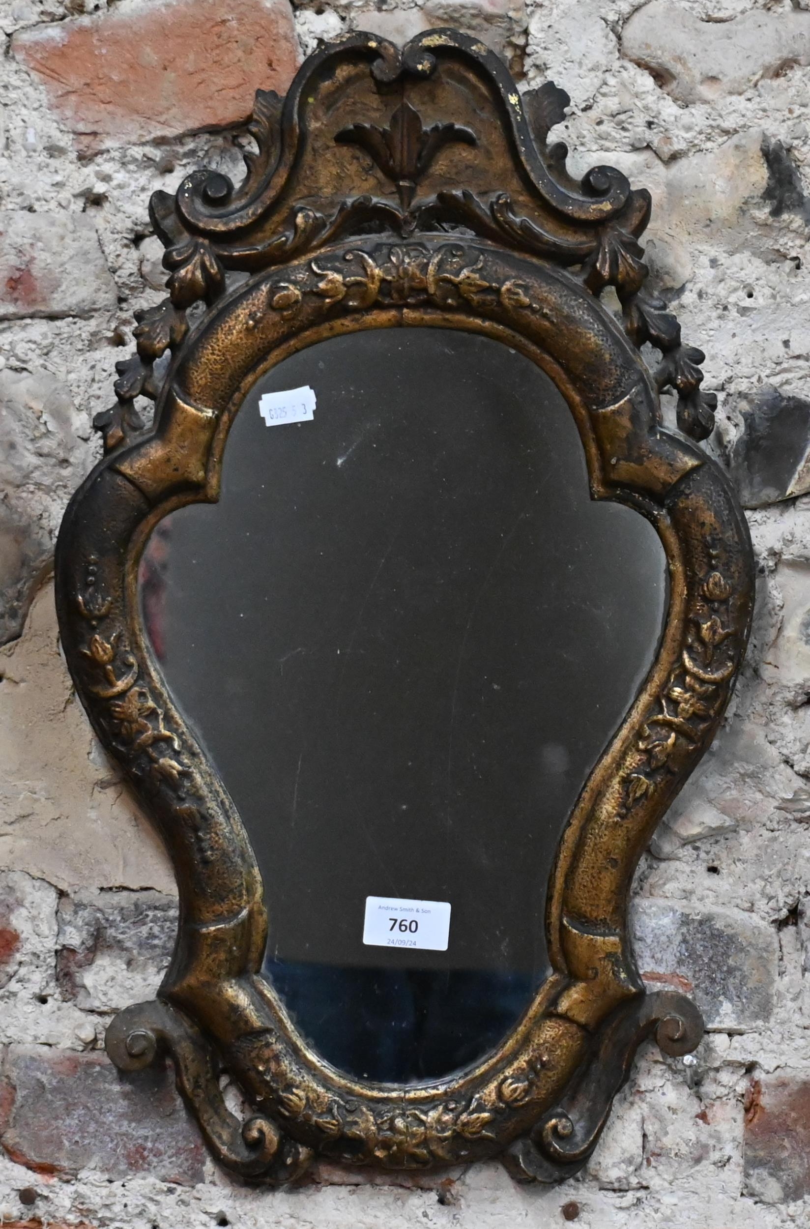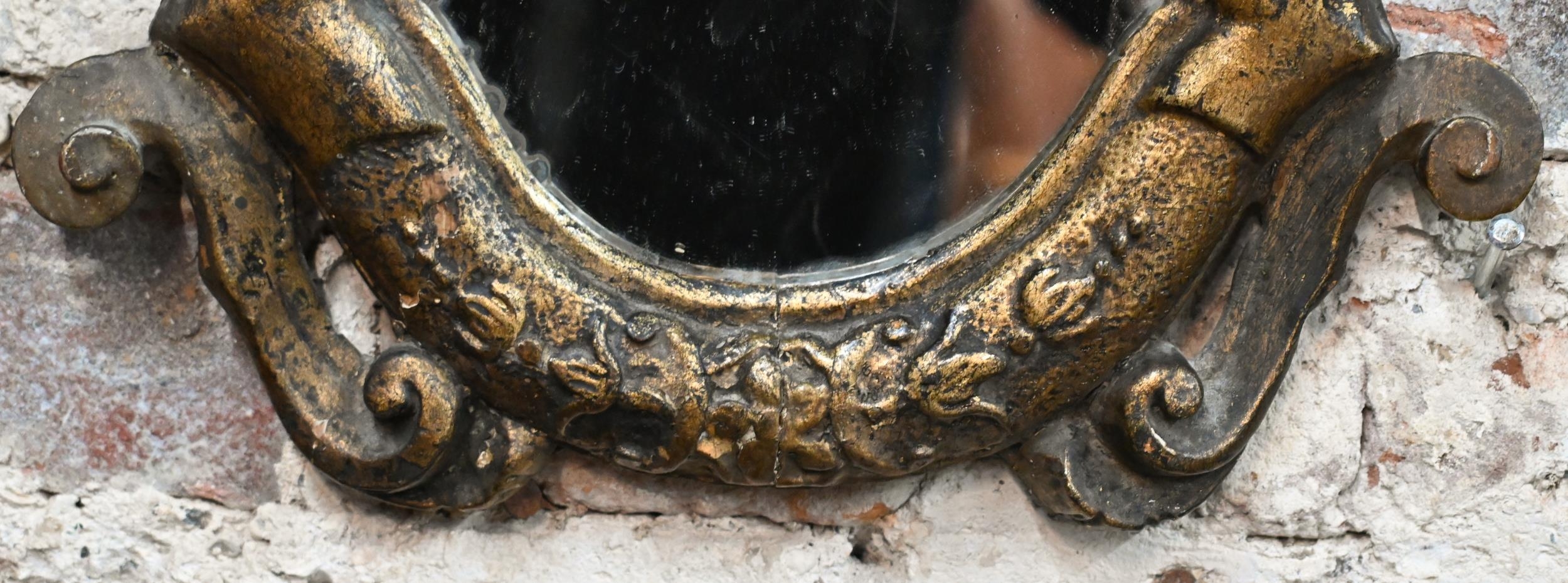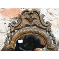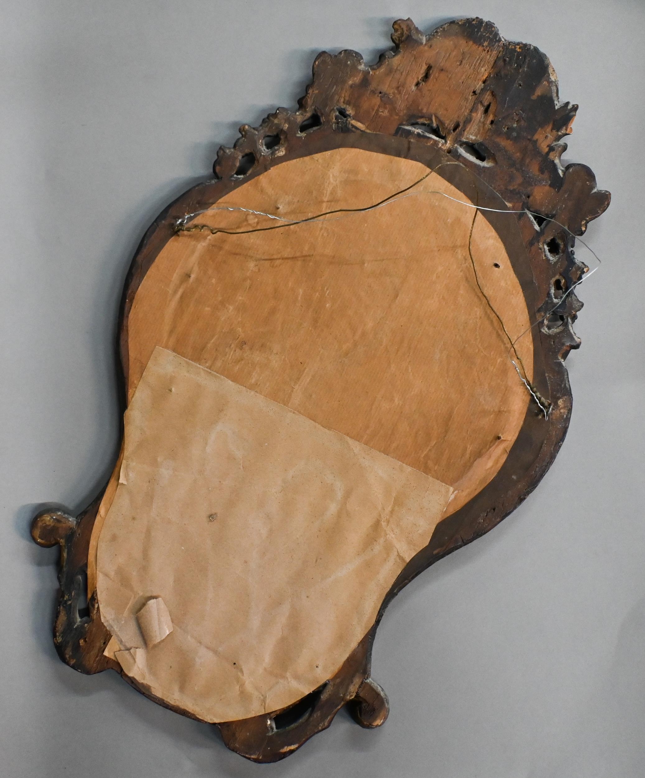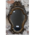 An antique carved giltwood framed cartel form mirror, 52 cm x 32 cm h