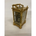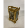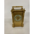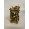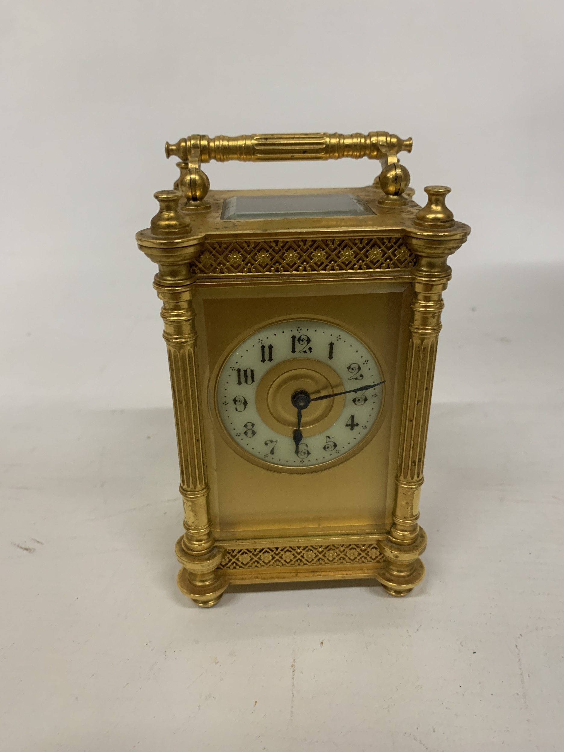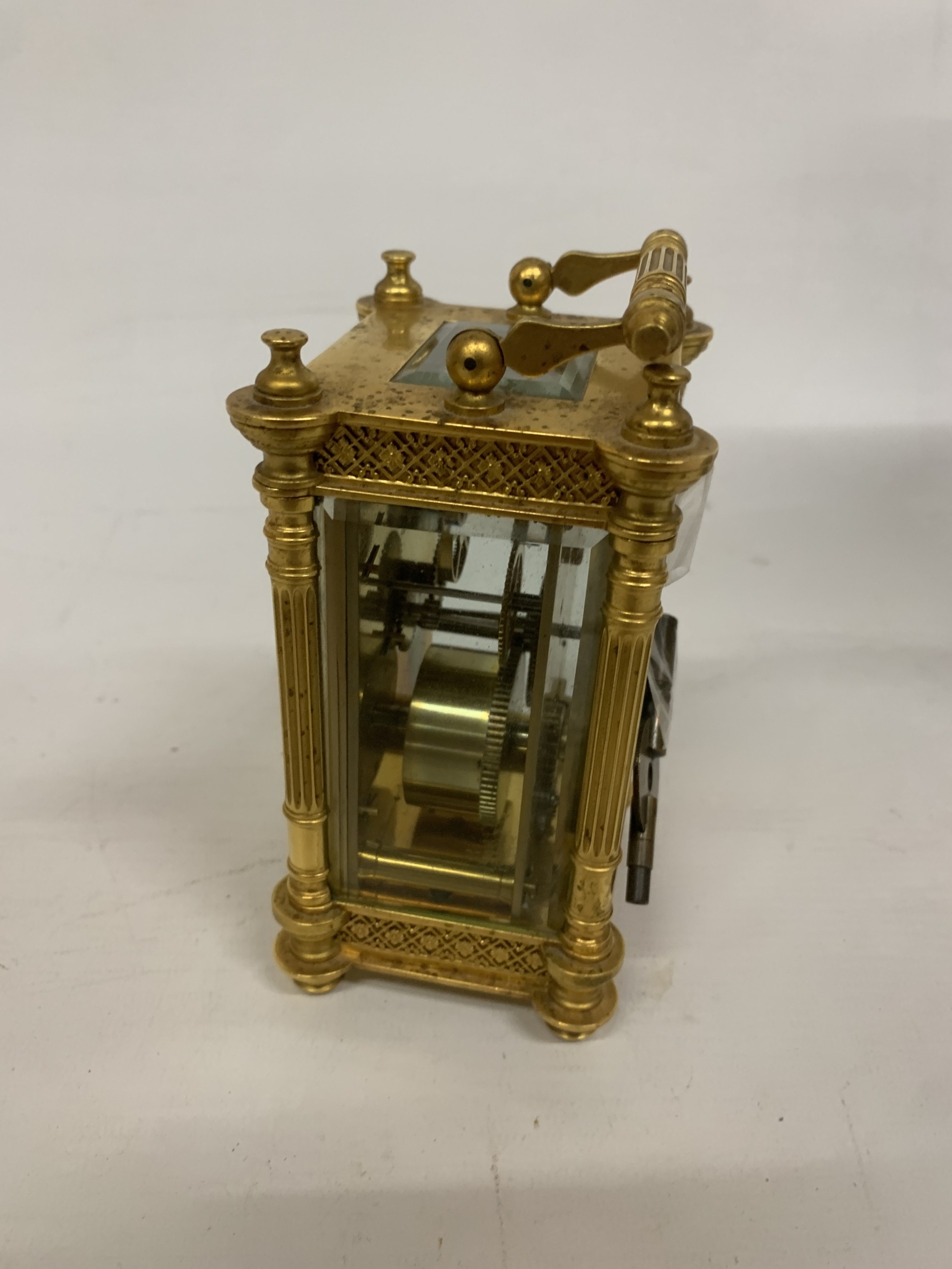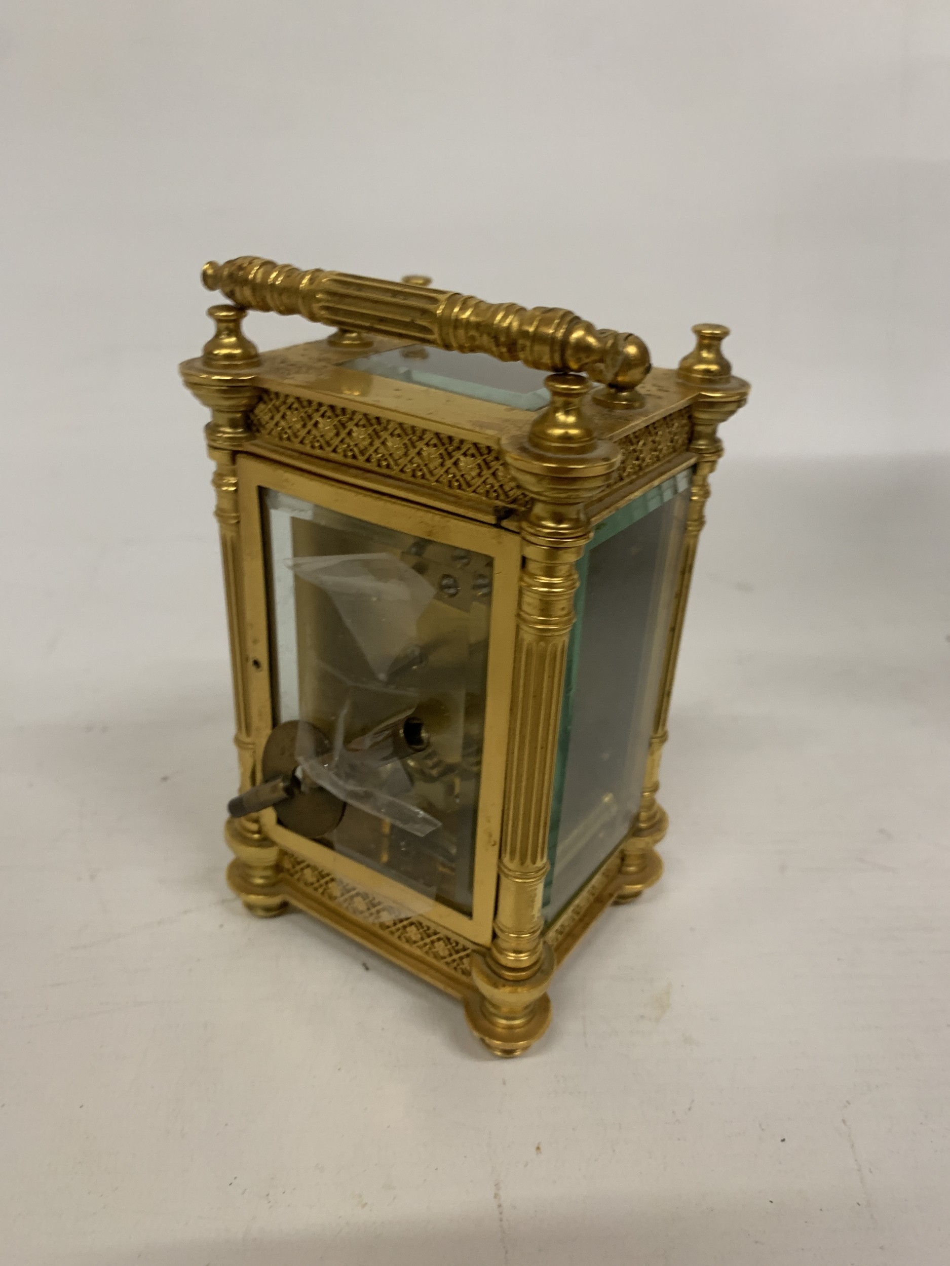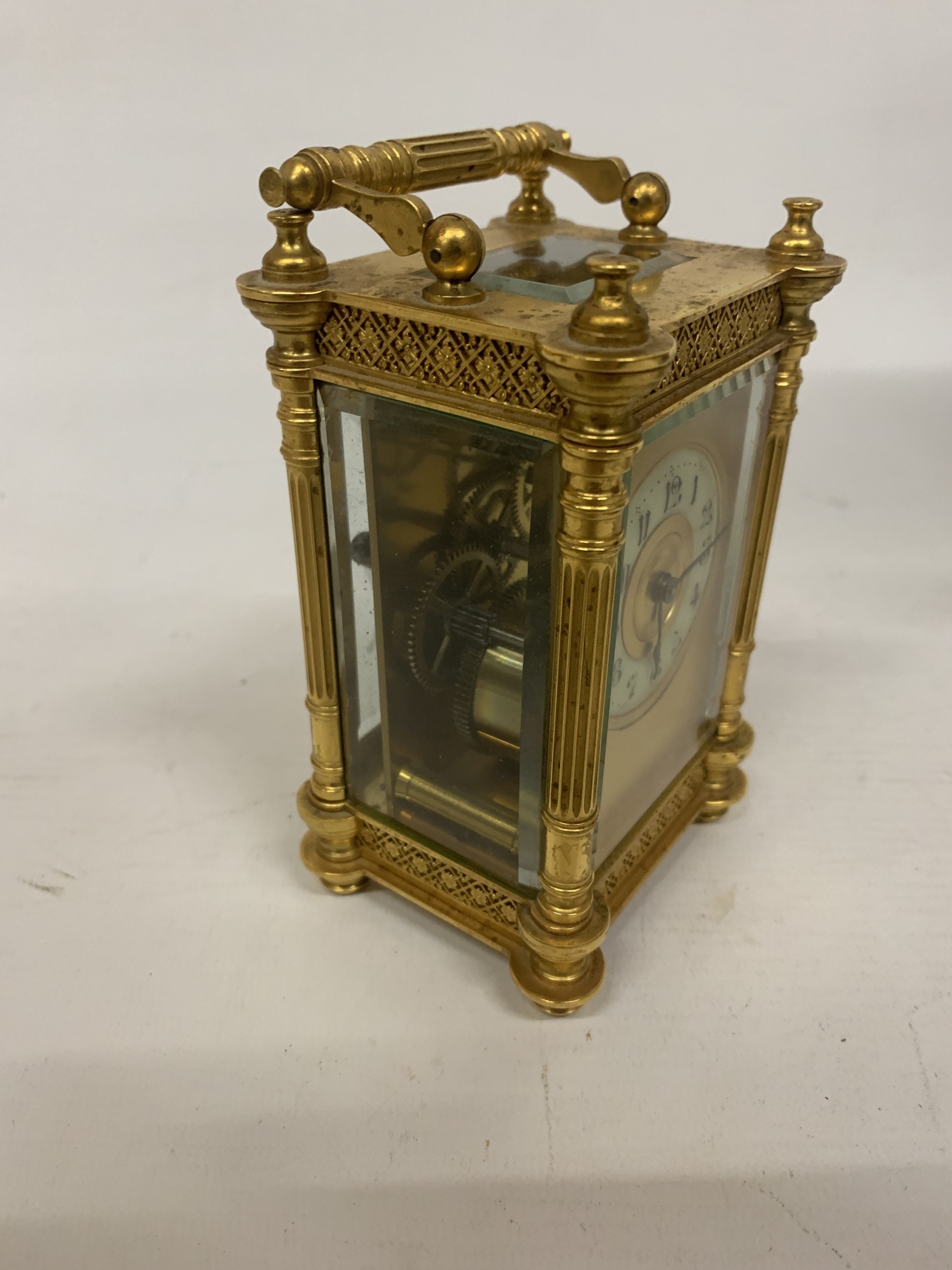 A FRENCH GILT BRASS CARRIAGE CLOCK WITH REEDED COLUMNS, ORNATE GILT FRETWORK PANELS, ENAMEL CHAPTER RING AND 8 DAY MOVEMENT