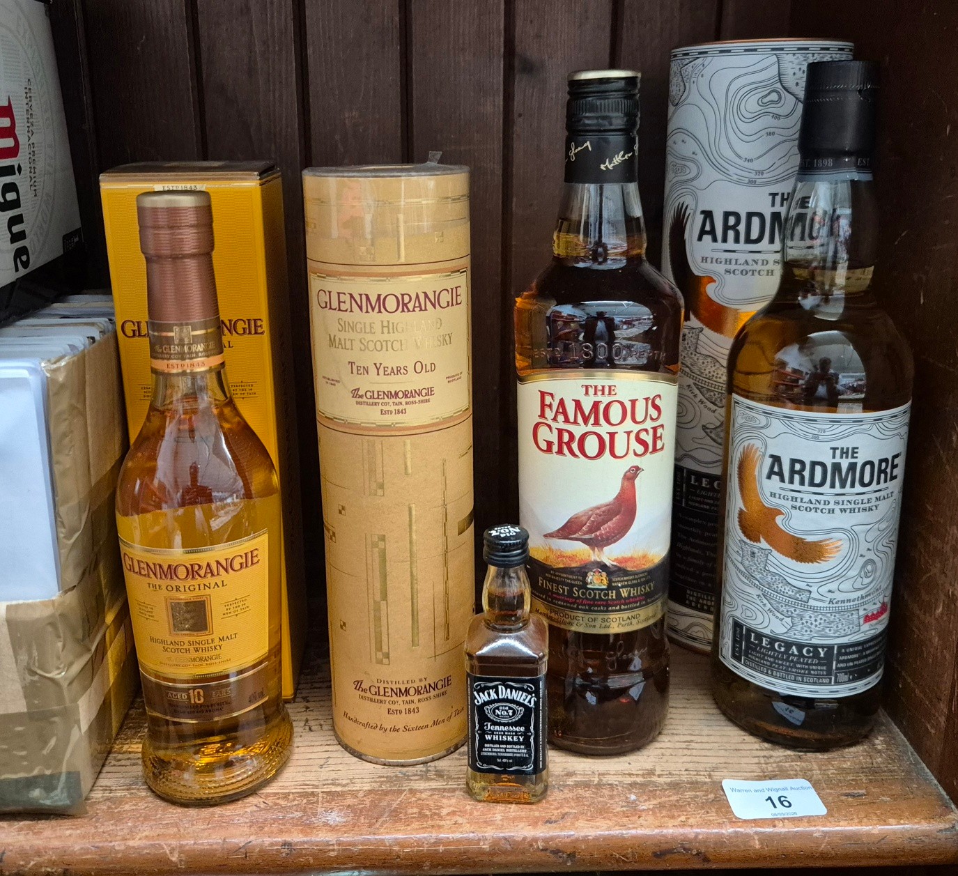 Five bottles of assorted whisky and a miniature Jack Daniels