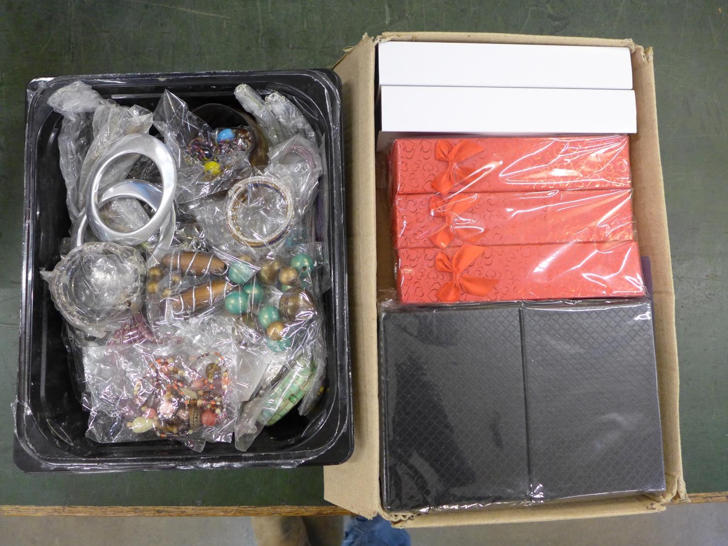 A tub of new costume jewellery and a pack of fourteen jewellery boxes
