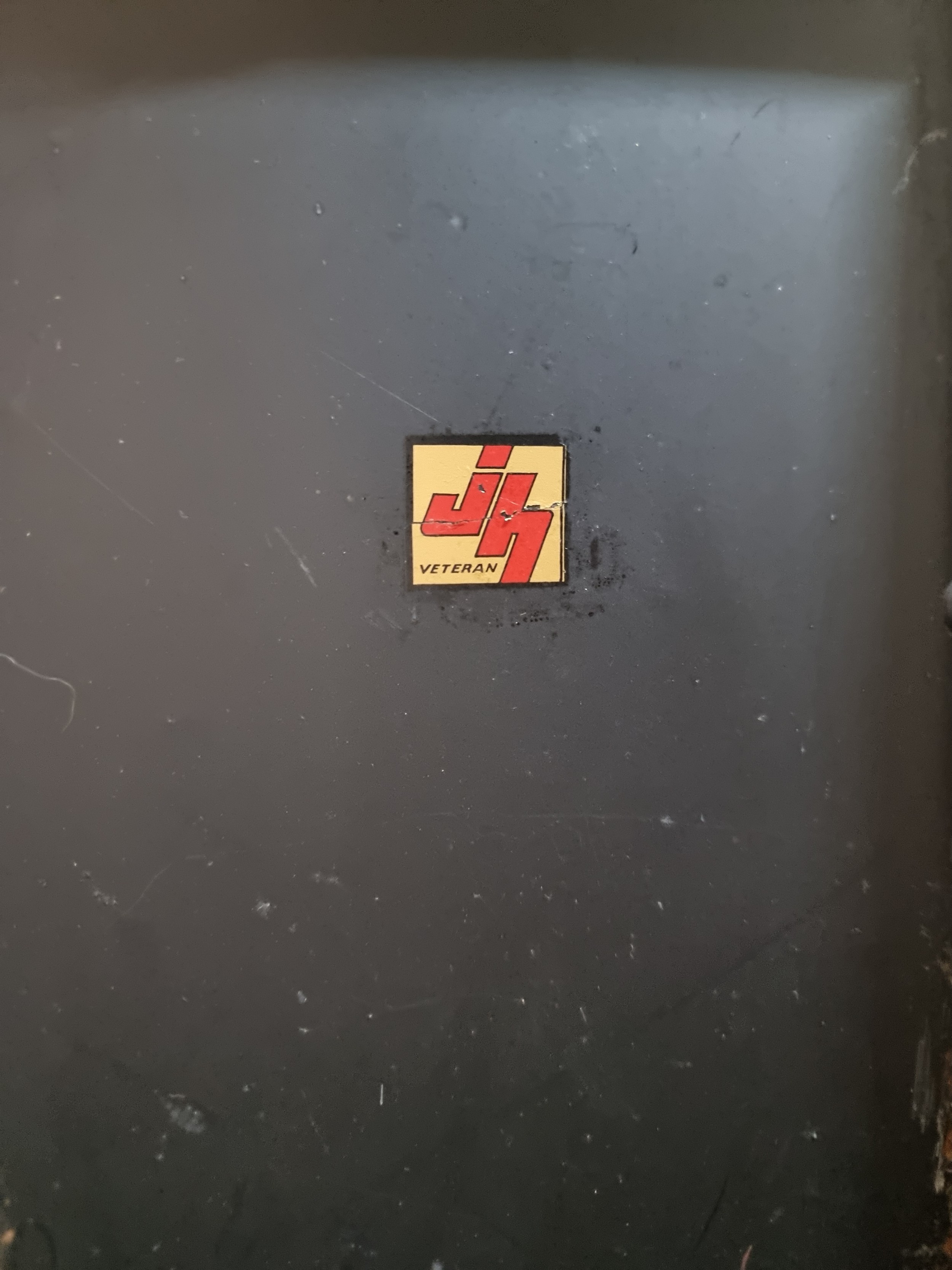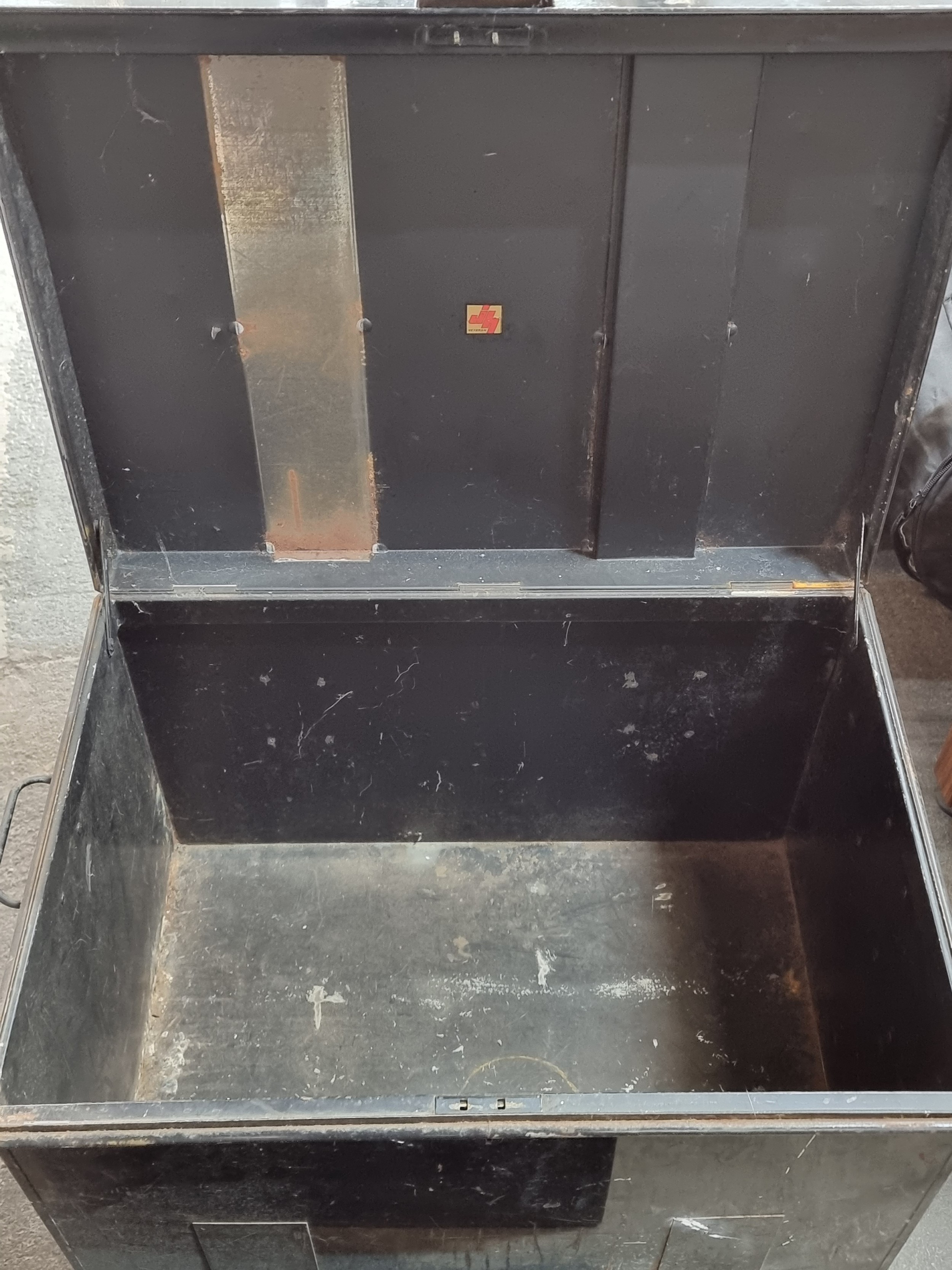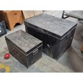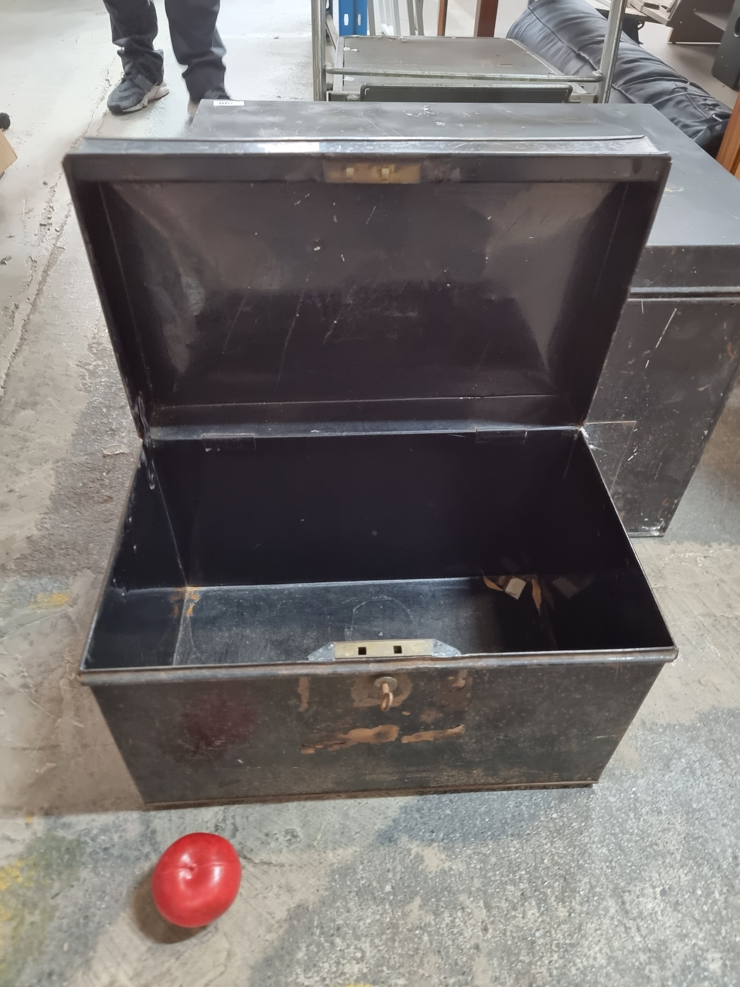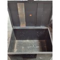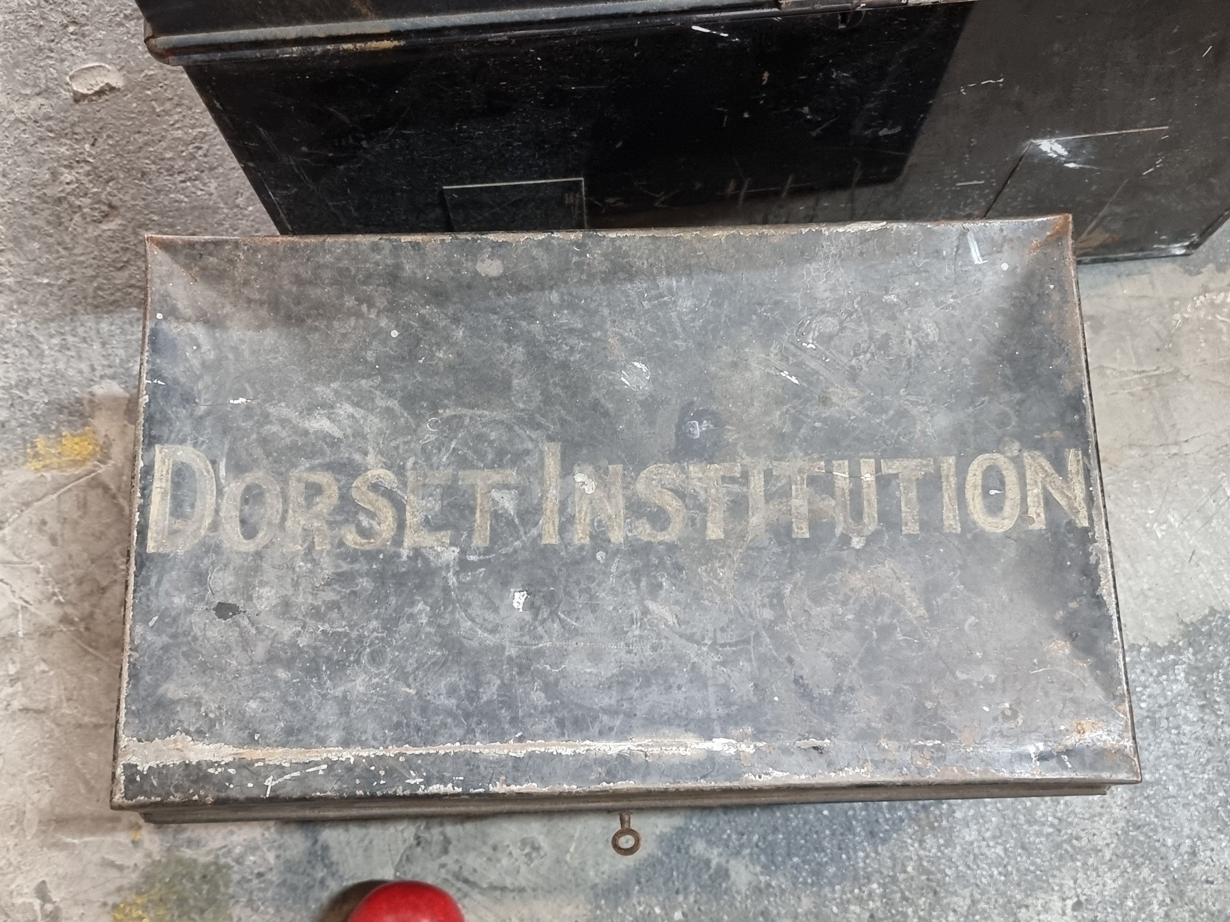 Two fabulous metal trunks including a large vintage example by JH Veteran with a hinged lid, ample storage and carry handles. Along with an antique example reading 'Dorset Institution' on lid. With original key included.