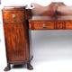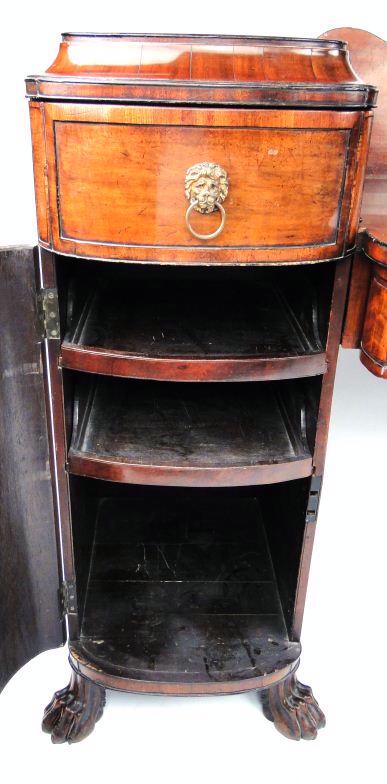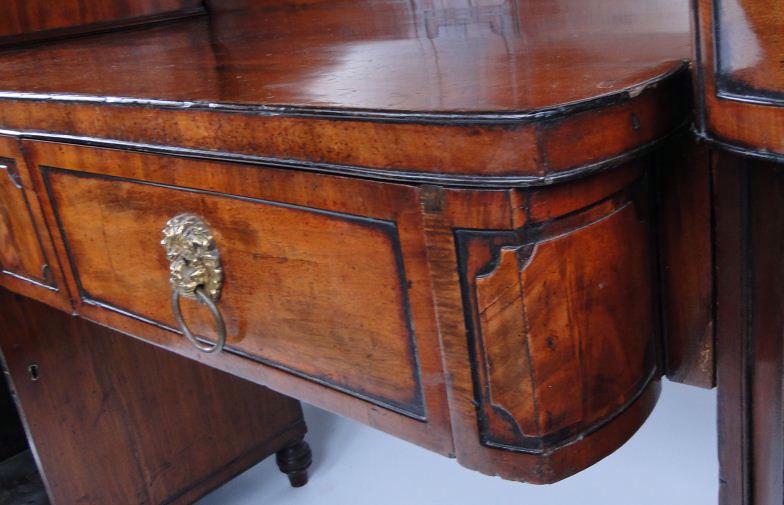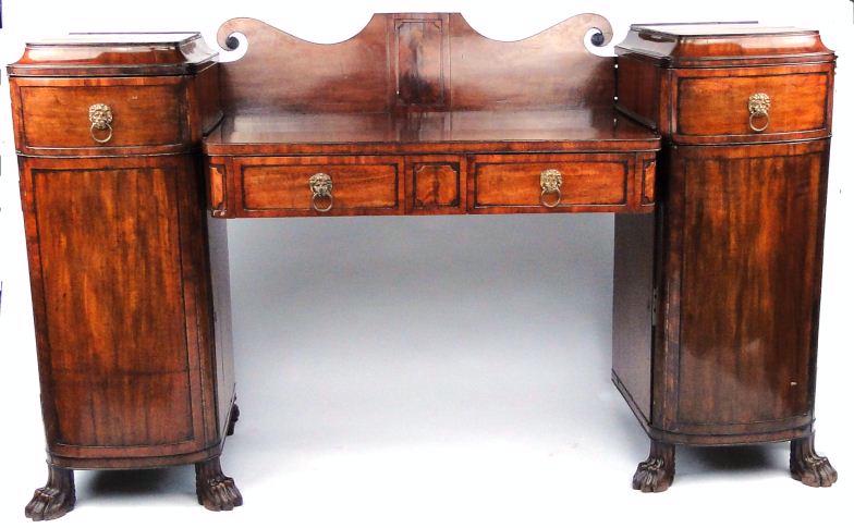 19th Century Mahogany twin pedestal sideboard, the central two drawers with swan neck cornice, flanked by pedestals fitted with a door enclosing shelf space and a deep drawer and raised on lion paw feet, 118cm high x 194cm wide x 60cm deep