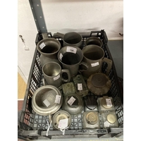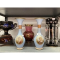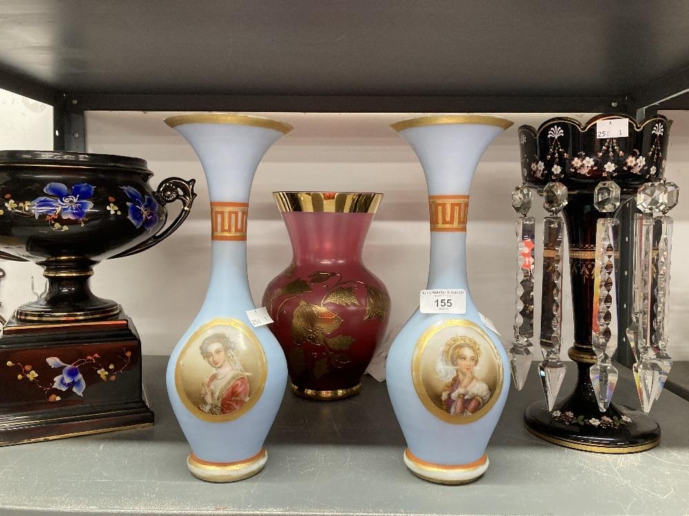 Ceramics & Glassware: Late 19th and early 20th cent. Black ground luster with floral decoration, black pedestal vase, red glass bulbous vase with gold floral decoration and a pair of blue glass Roman style vases.