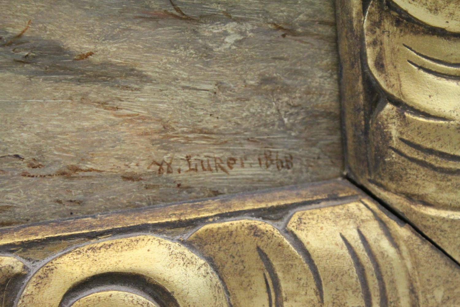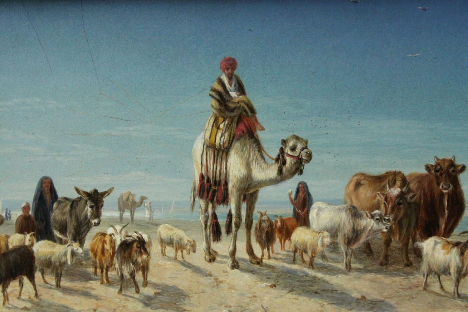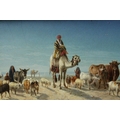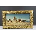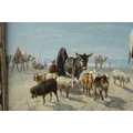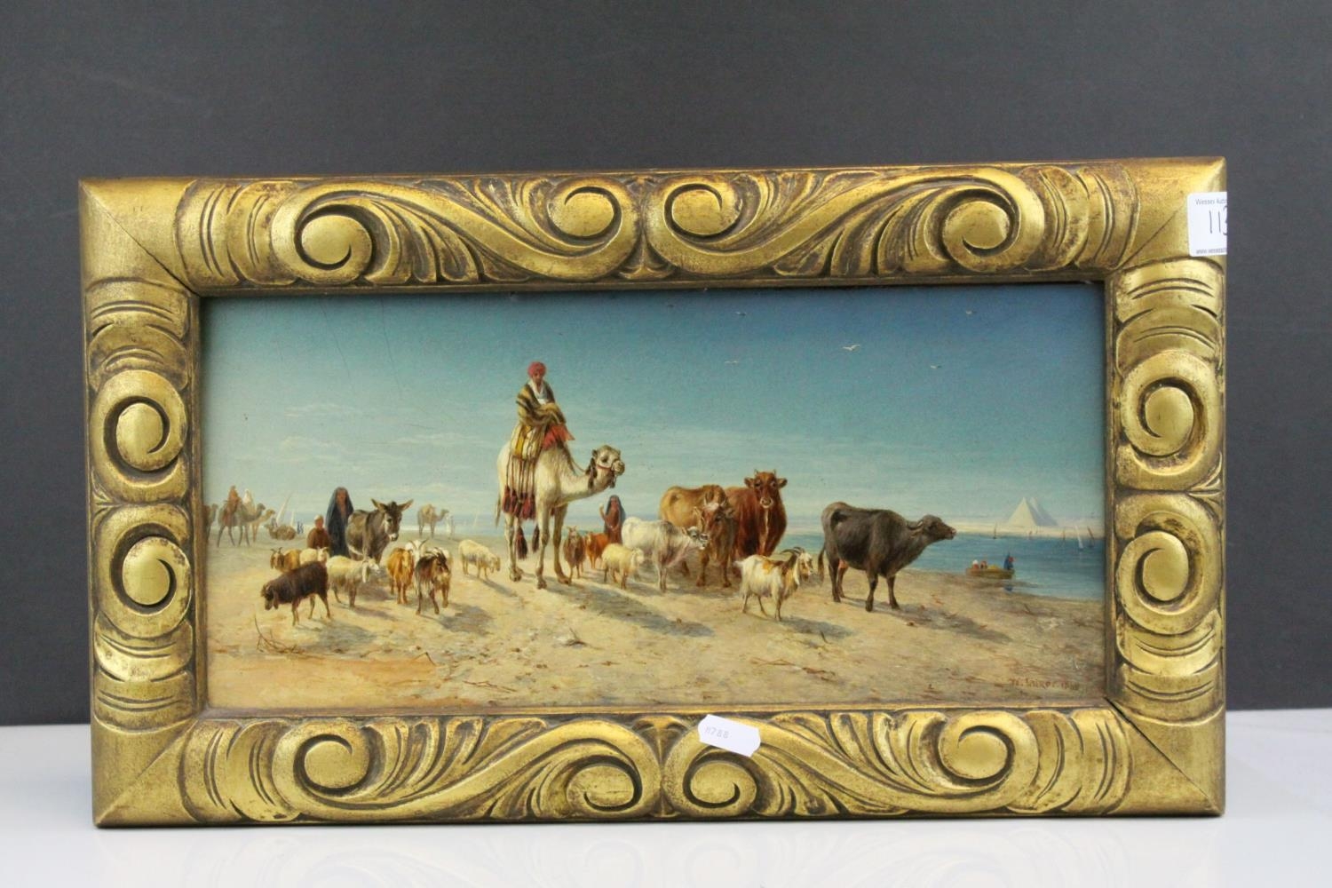 William Luker Snr (1828 - 1905 ), 19th century Oil Painting on Board depicting an Arab Man on a Camel with animals and Pyramids in the background, signed lower right and dated 1868, 17cms x 37cms, gilt framed