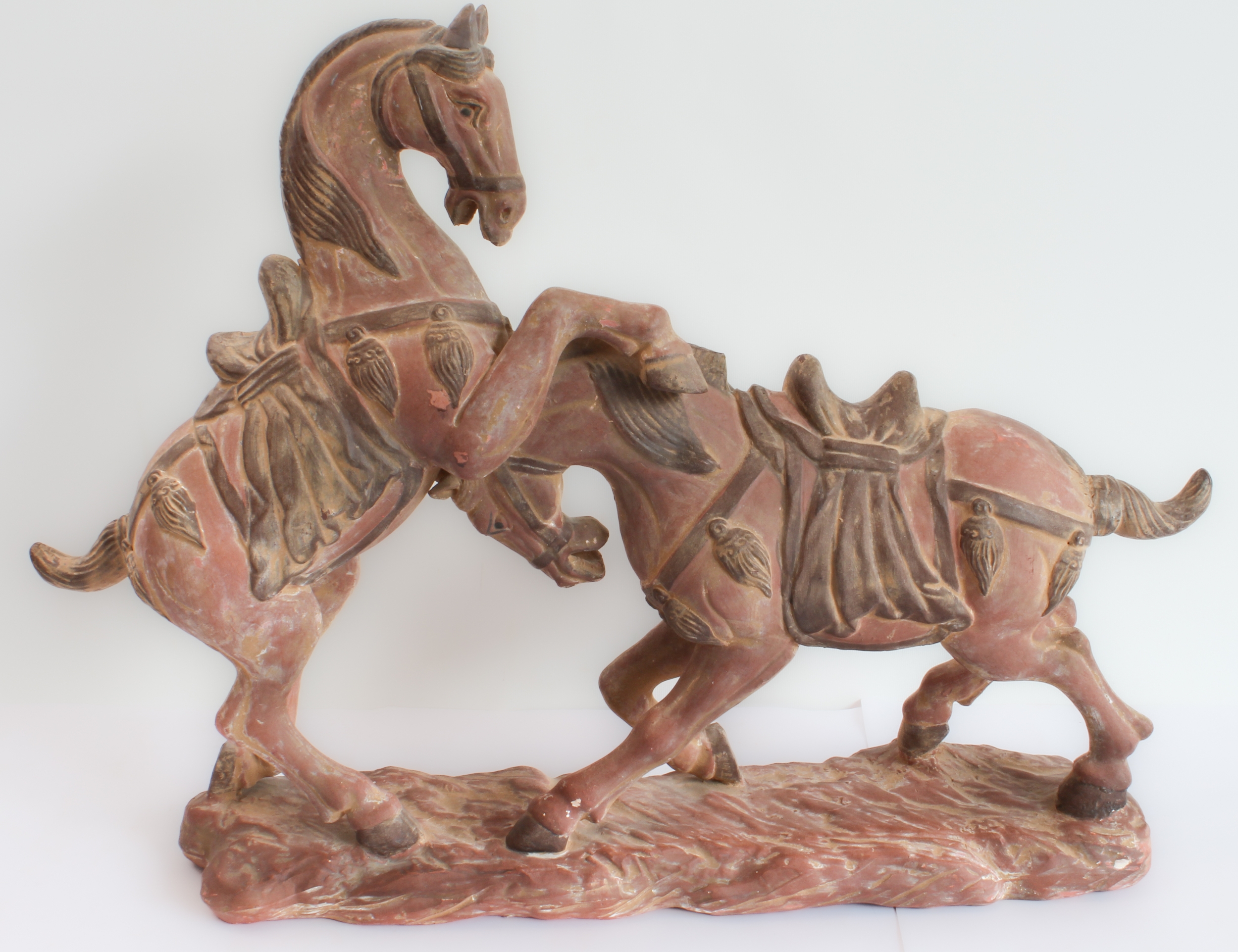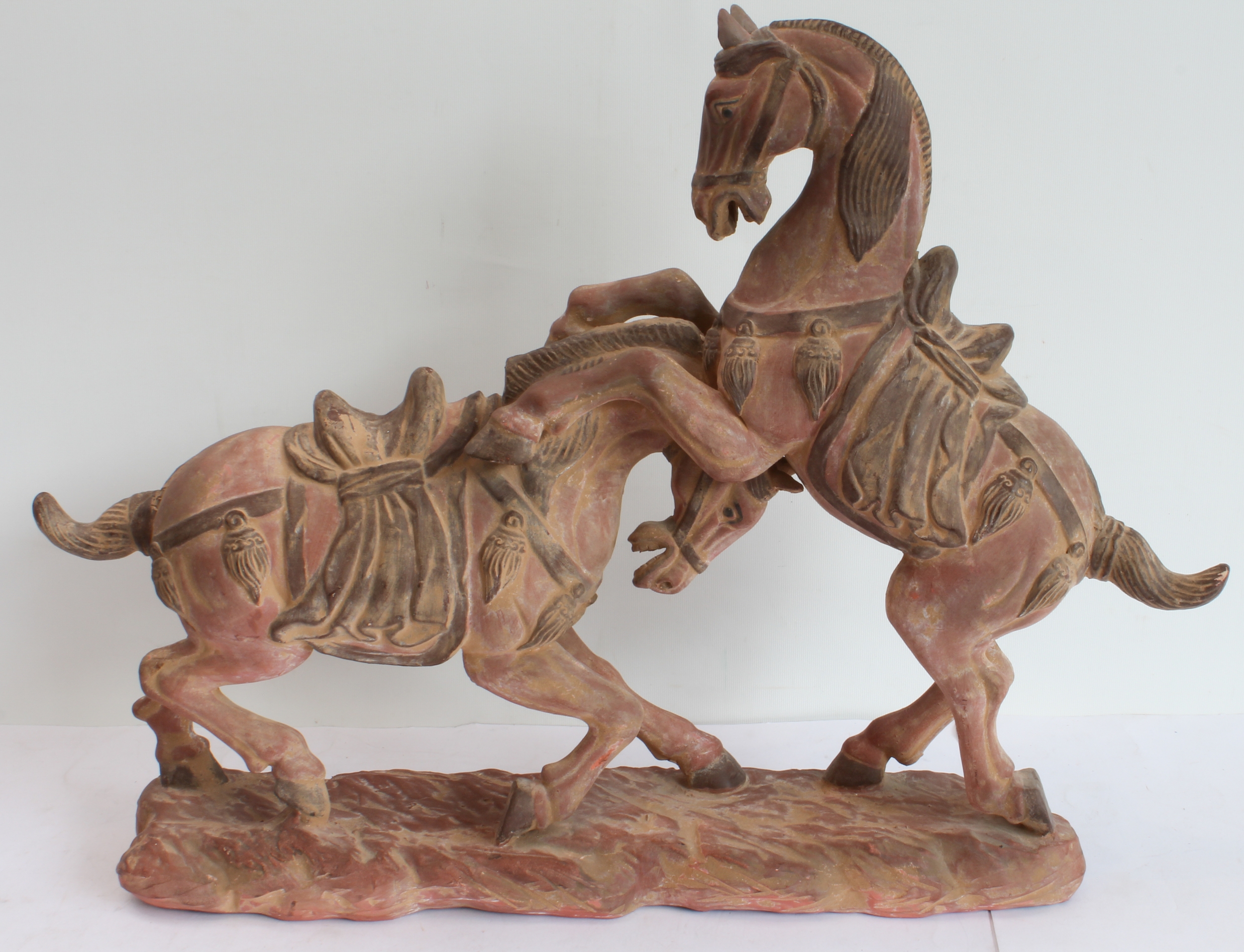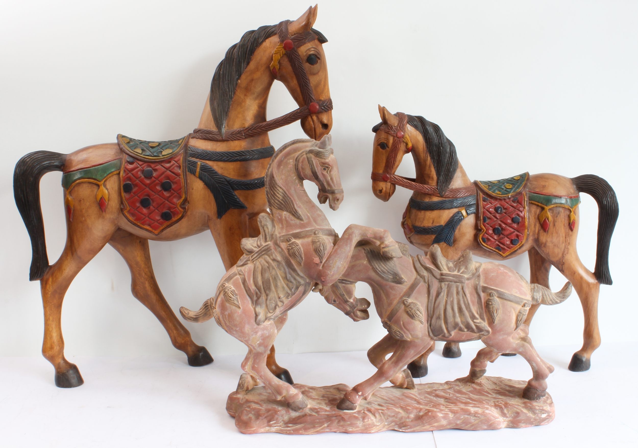 Two hand-carved painted wooden ornamental horses (the larger 61 x 51.5 cm) and a terracotta model of two horses fighting (59 x 43.5 cm)