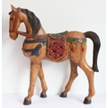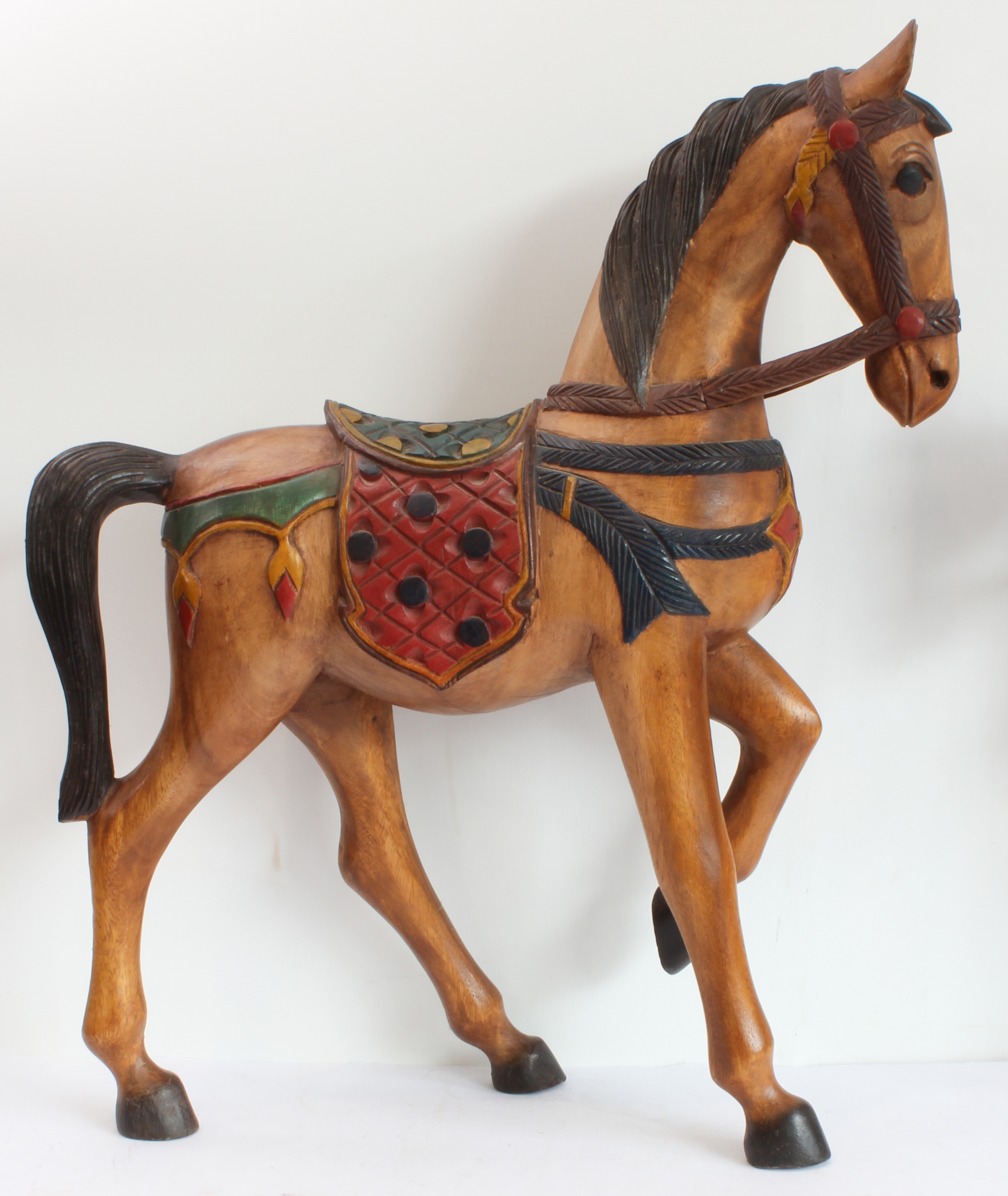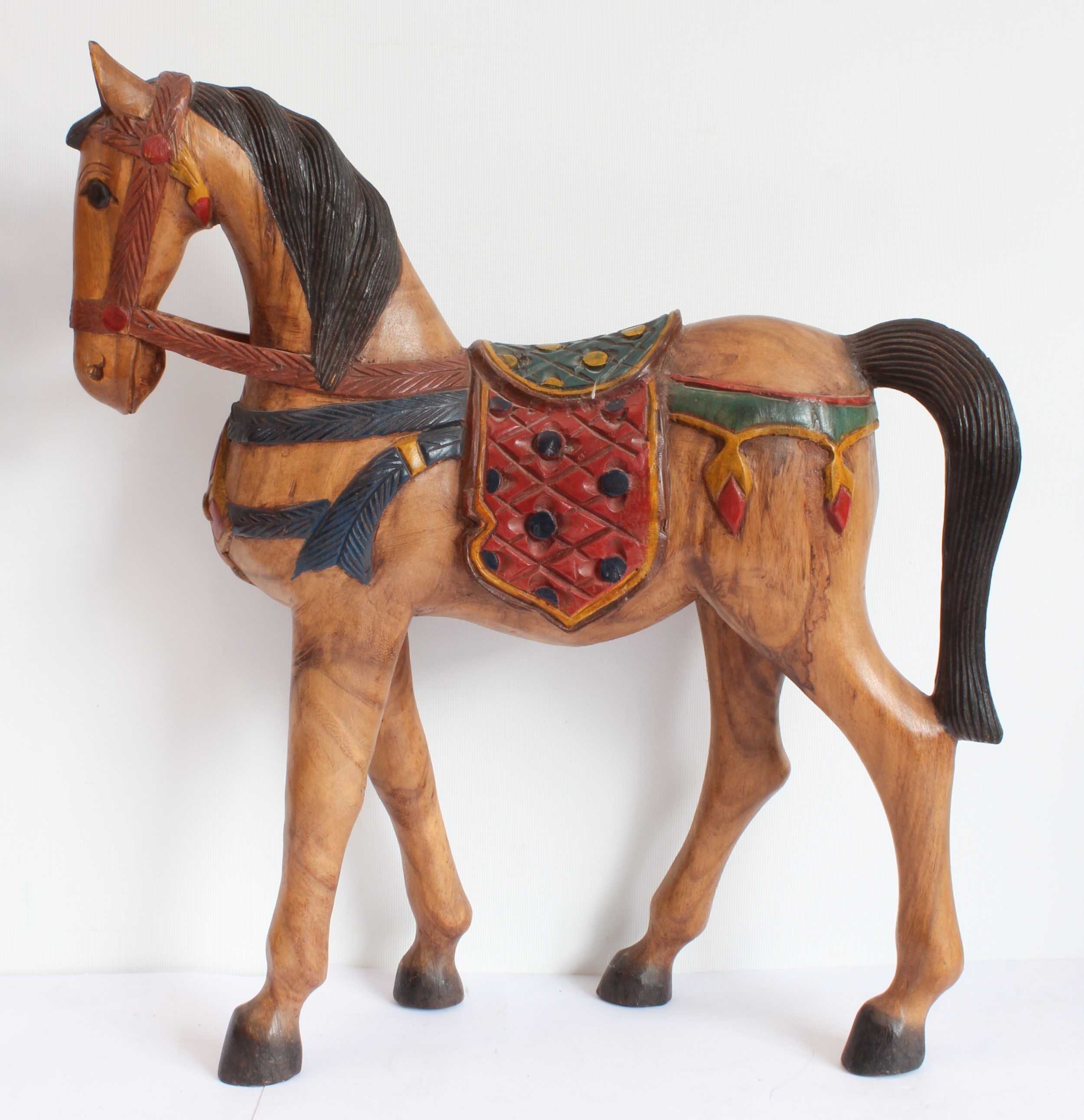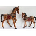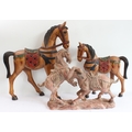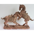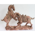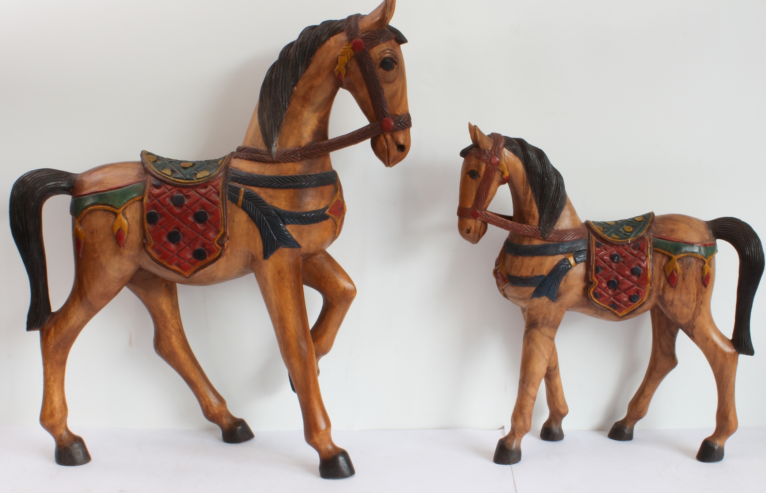 Two hand-carved painted wooden ornamental horses (the larger 61 x 51.5 cm) and a terracotta model of two horses fighting (59 x 43.5 cm)