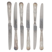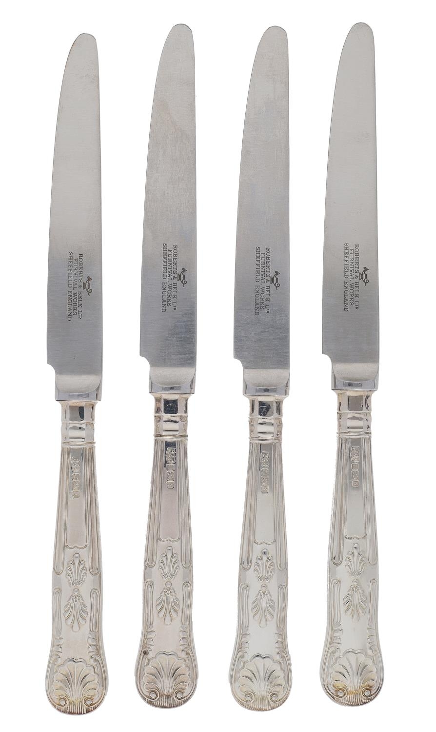 Four Roberts & Belk Kings pattern knives, with steel blades, the handles hallmarked Sheffield 1991, 9" long