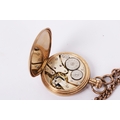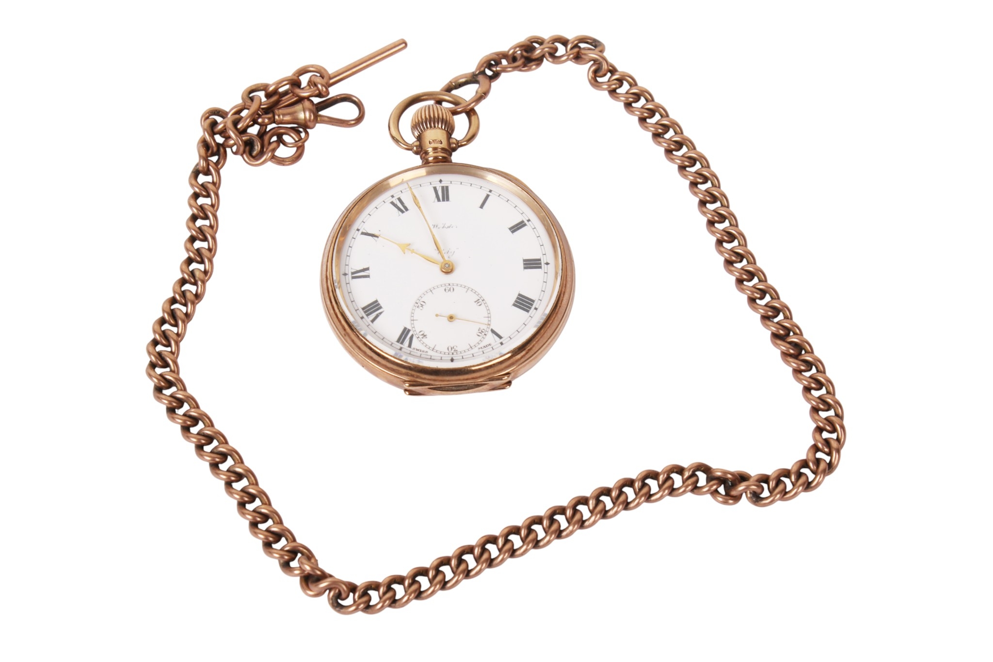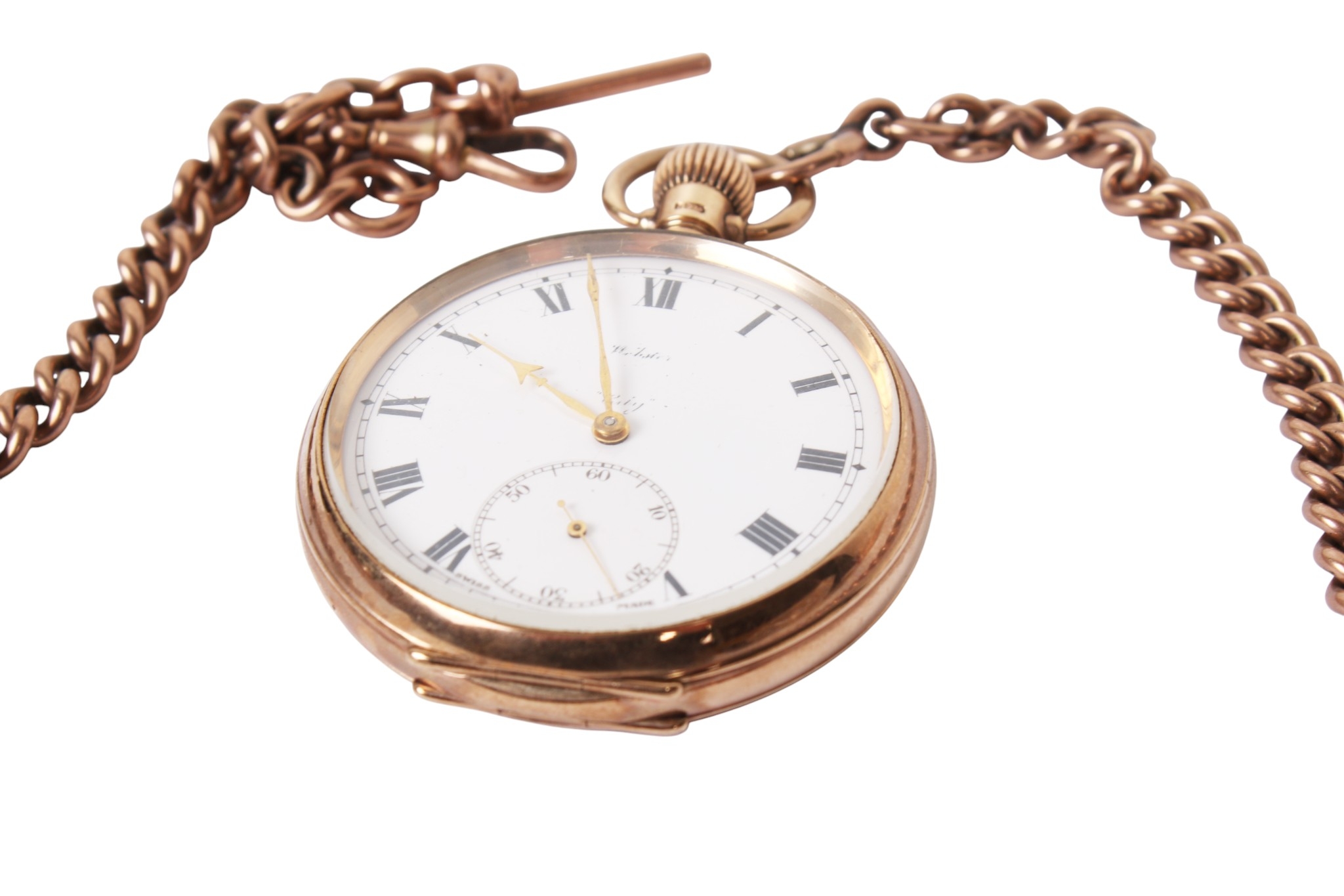 A 9ct gold vintage Webster's City pocket watch and Albert chain. With black Roman numerals and secondary dial to the white white enamel, maker's name rubbed, hallmarked to pendant, loop, inside back case and dust case, case diameter 4.8cm, on a 9ct gold Albert chain, each link and t-bar hallmarked, L39cm, weight of chain 52g, total gross weight 143.9g.