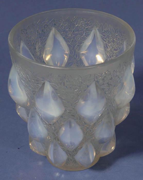 Lalique iridescent green vaseline rampillon patterned glass vase marked R Lalique, France (H12cm, D11cm approx) -