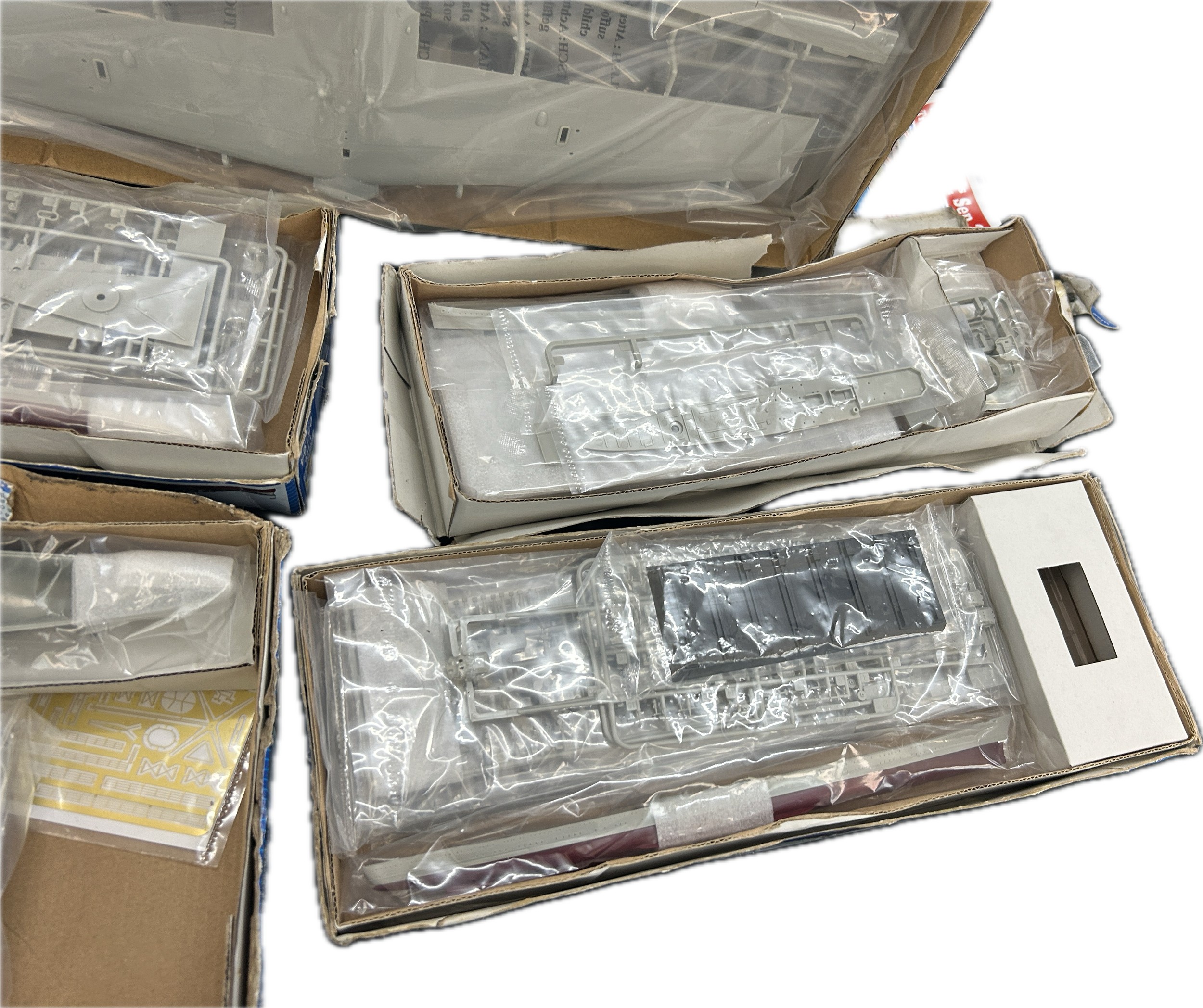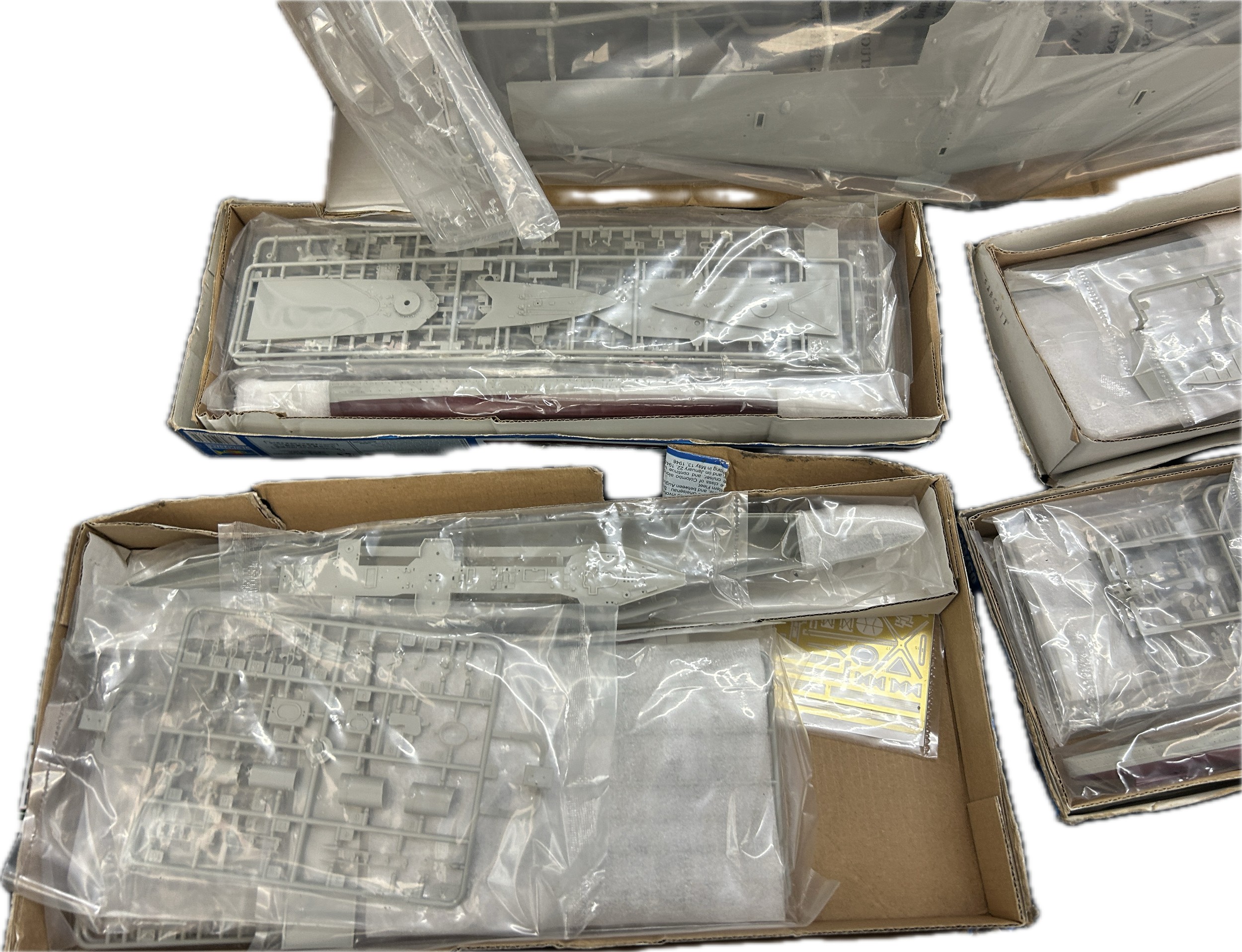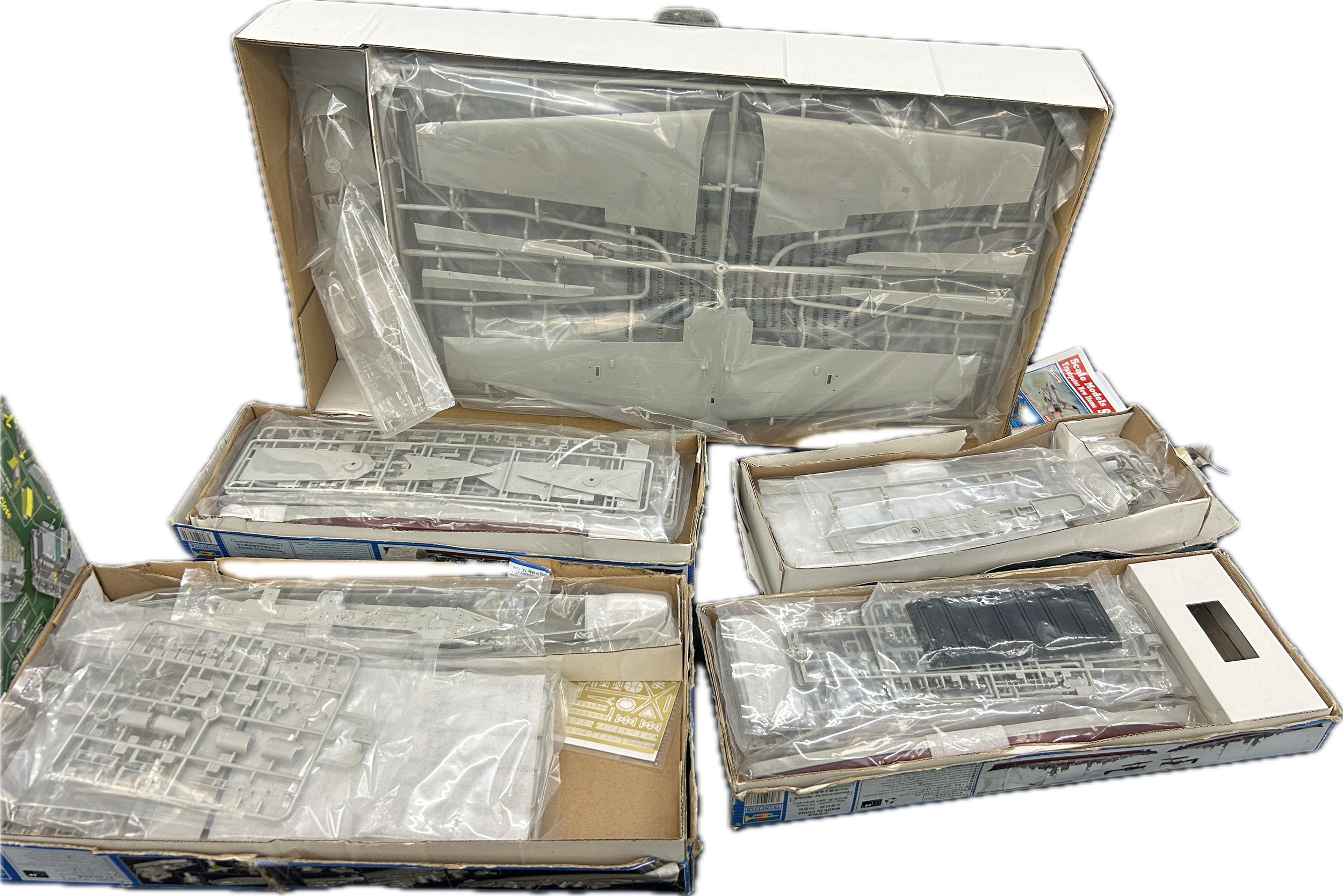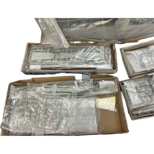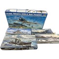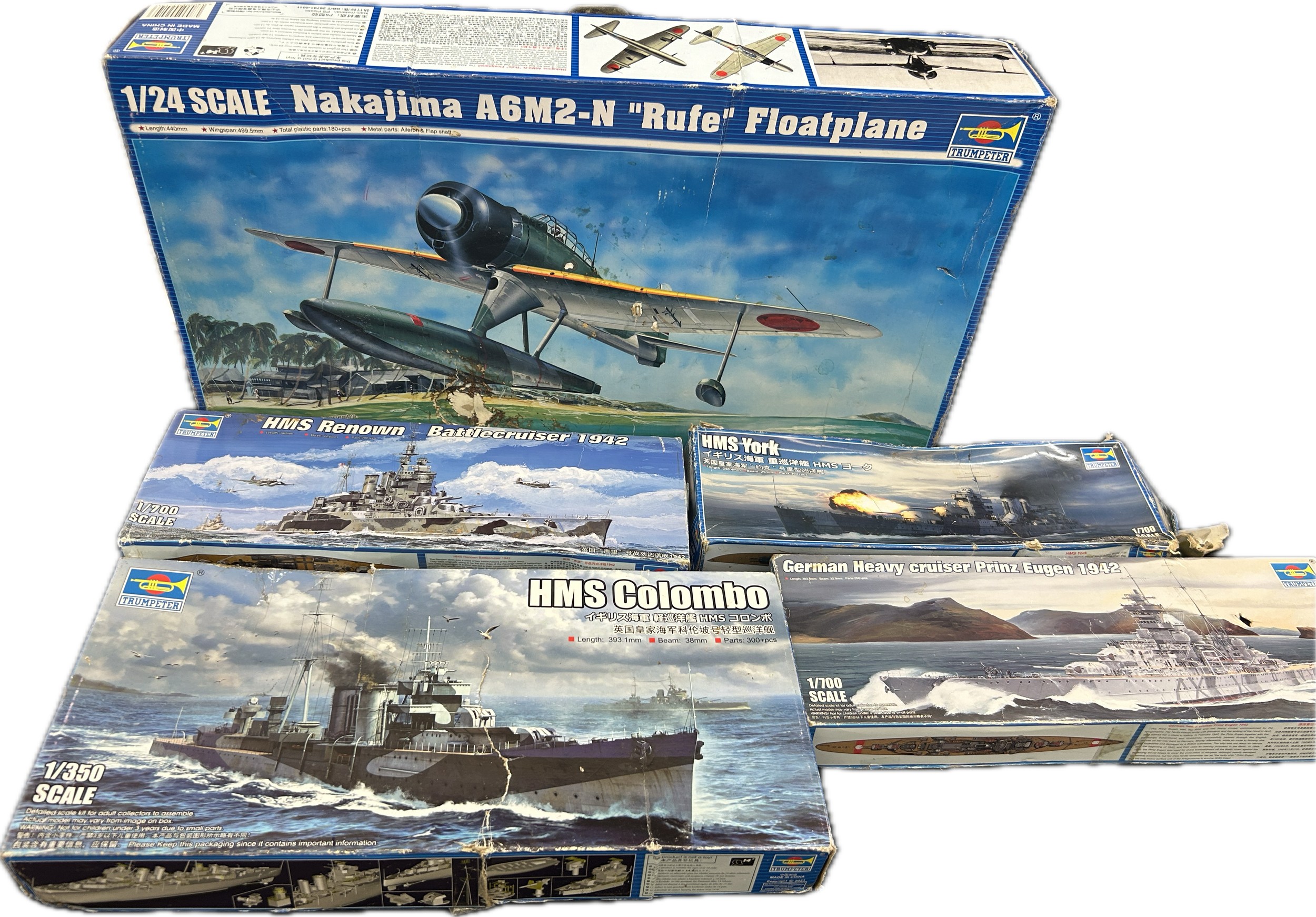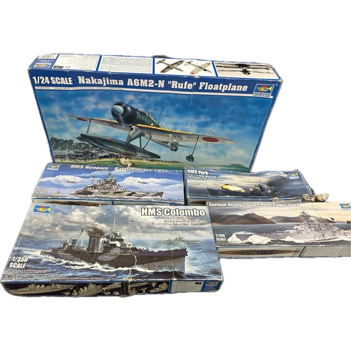 Selection of 5 boxed Trumpeter ship and aircraft model kits to include HMS York, German Heavy Cruiser, HMS Colombo, HMS Renown, Nakajima A6M2-N Rufe Floatplane, all boxes has sustained damp damage, contents complete