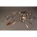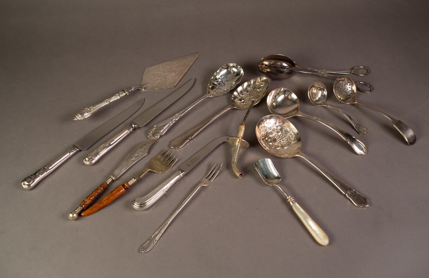 FIFTEEN PIECES OF ELECTROPLATED AND STAINLESS STEEL SERVING CUTLERY, including a MOTHER OF PEARL HANDLED STILTON SCOOP, CAKE KNIFE, SIFTER SPOON, BERRY SPOON, etc, and a SILVER PLATED WINE POURER, (16)