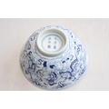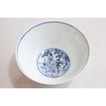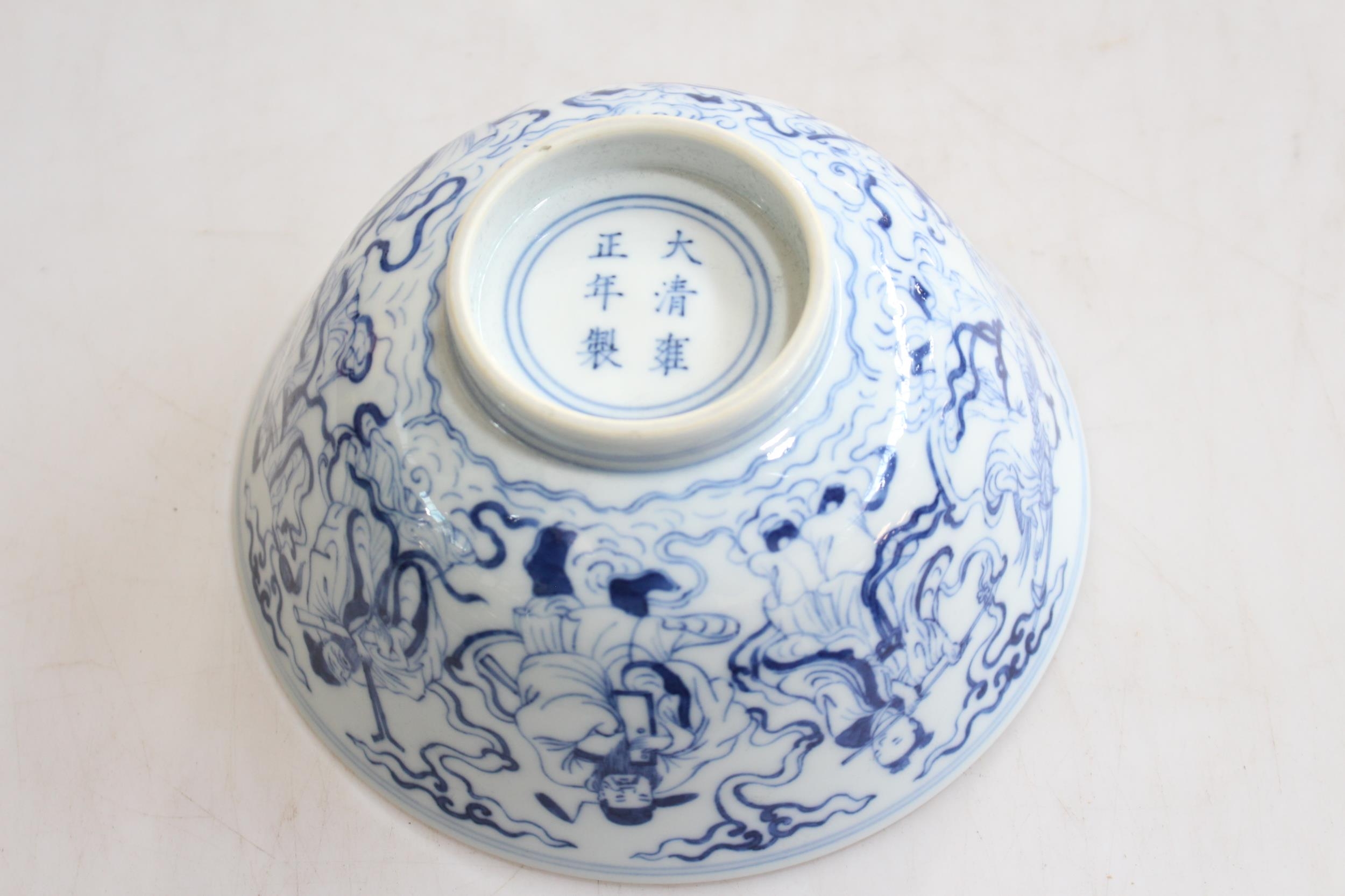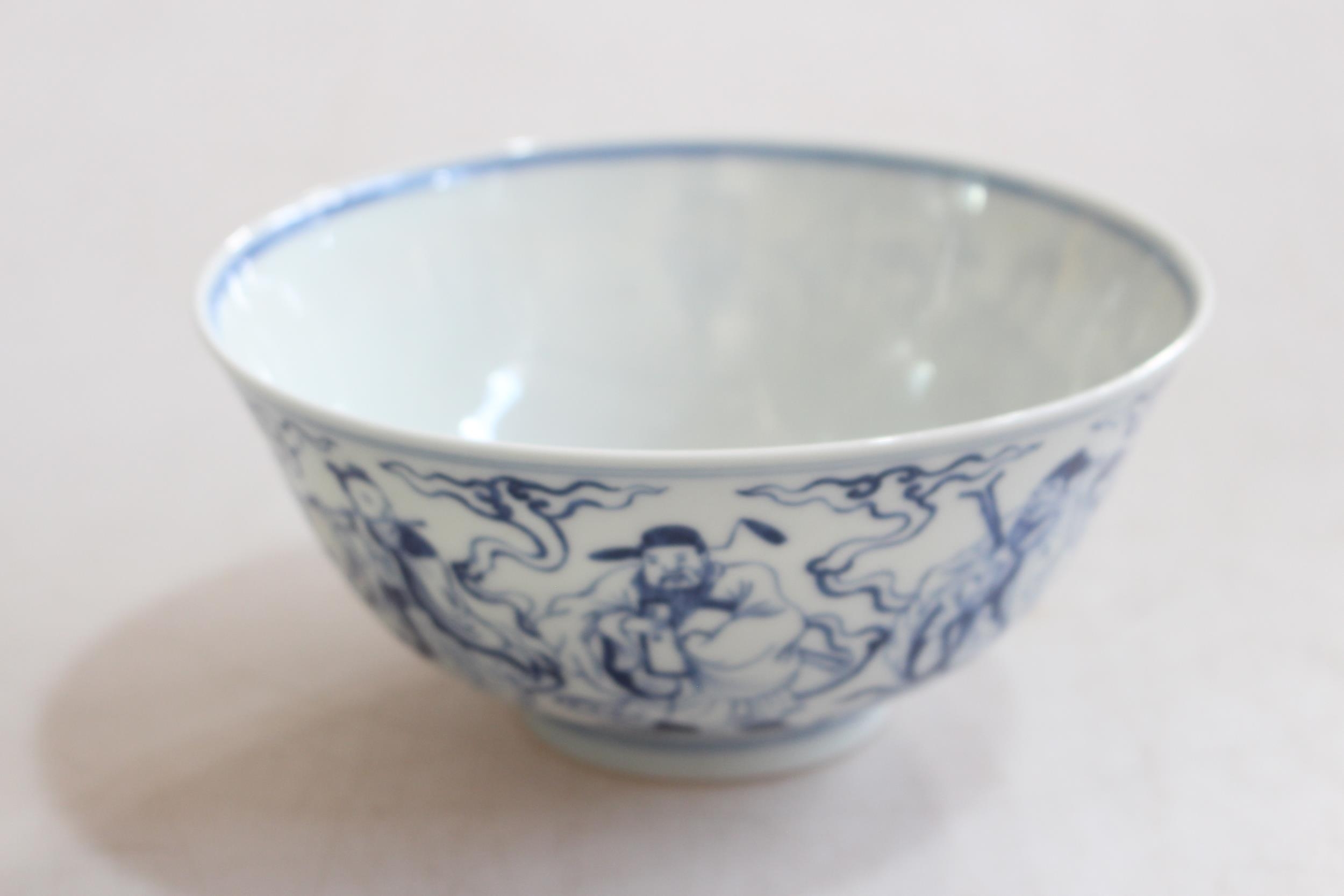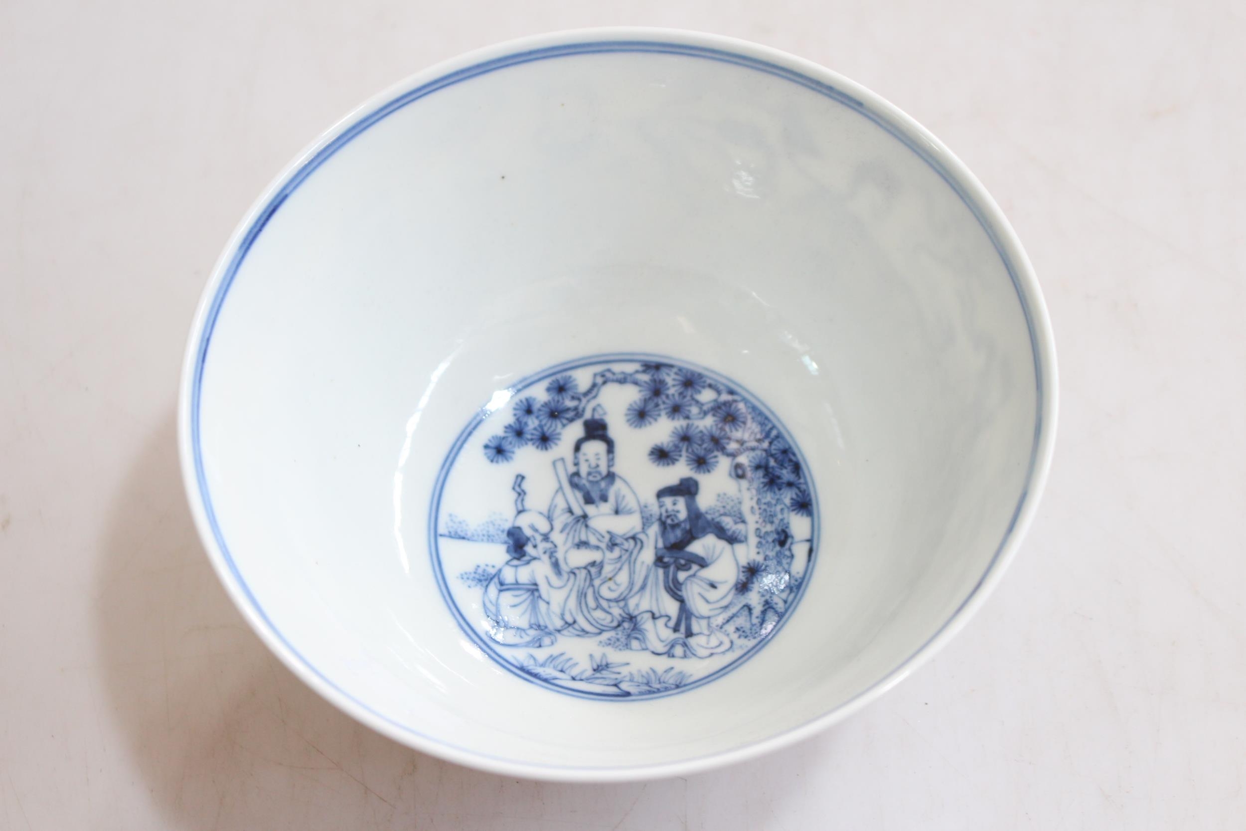 Chinese blue and white bowl with elders decoration, six character mark, 16cm diameter.