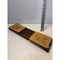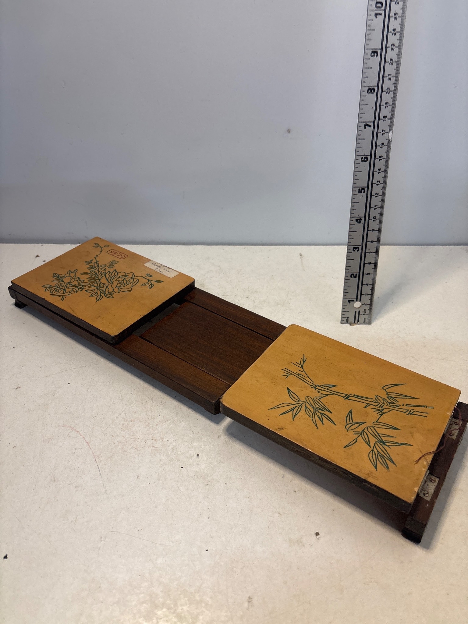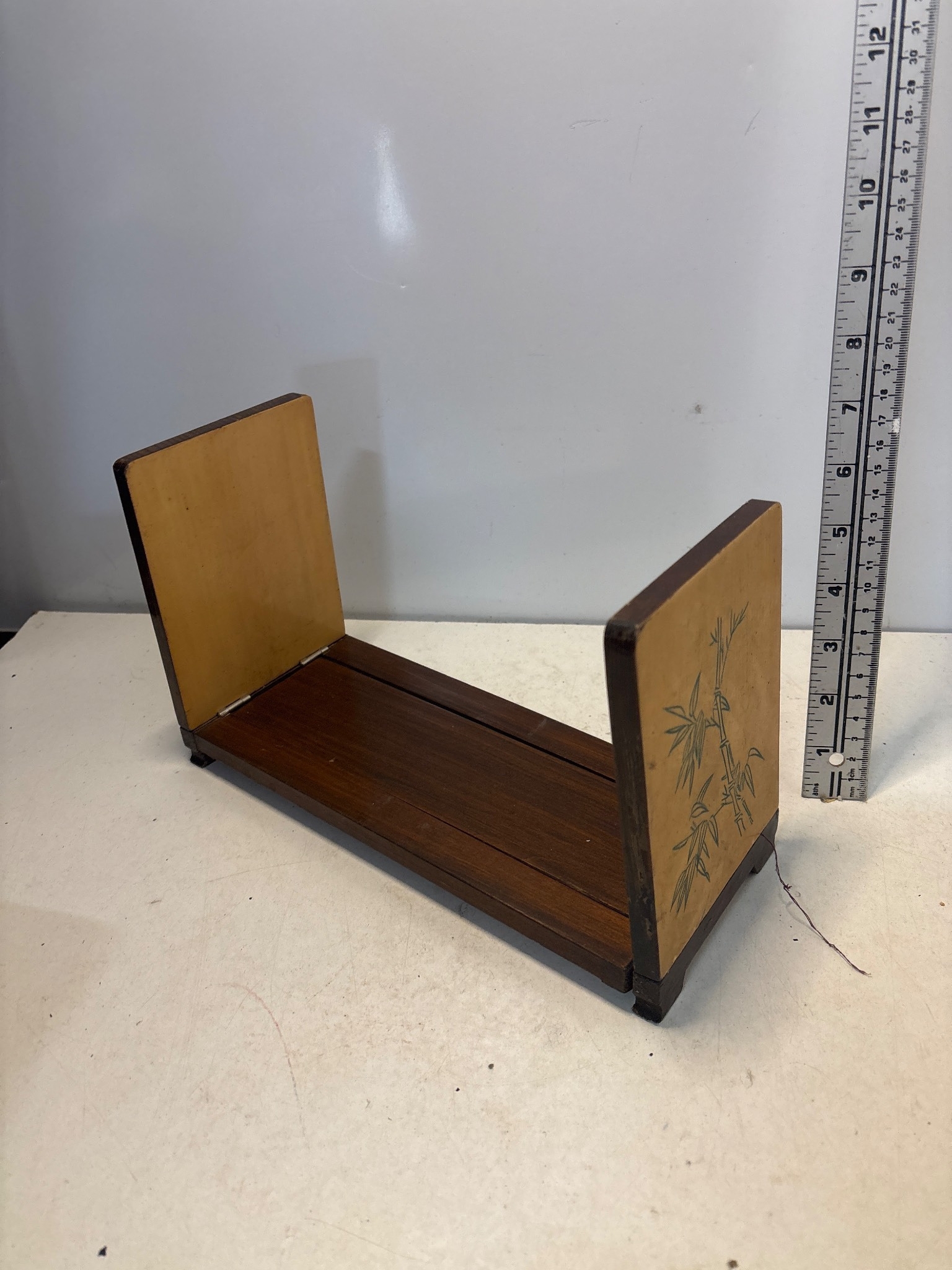 Expandable wooden book holder with engraved floral designs.
