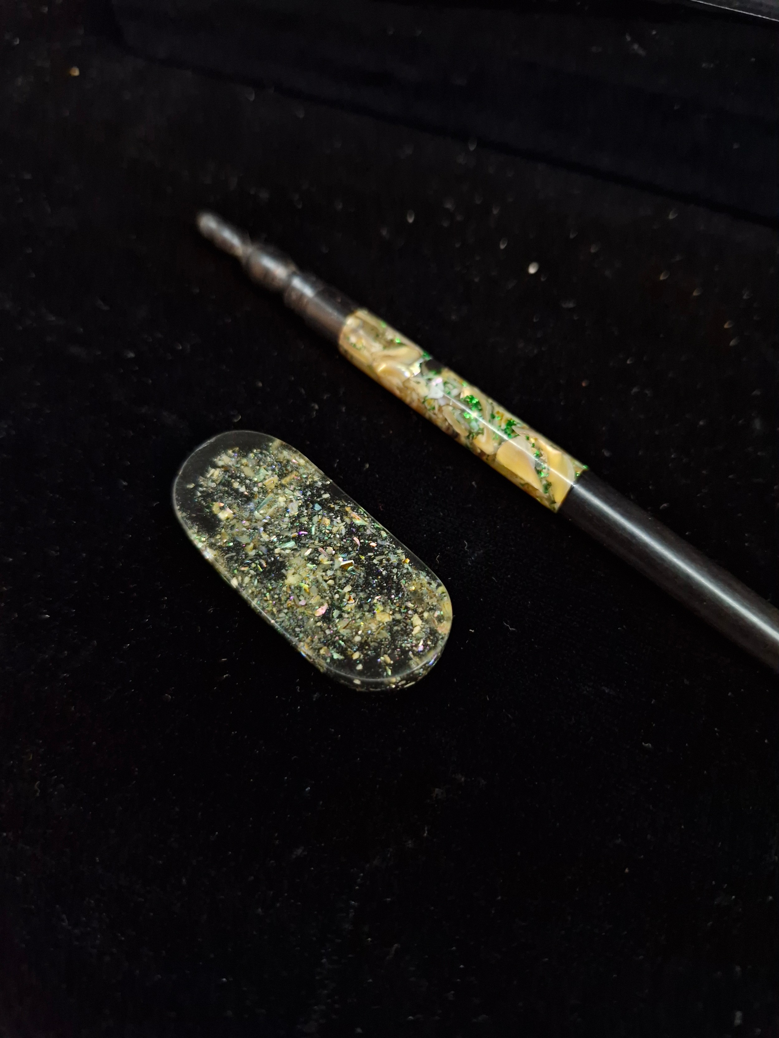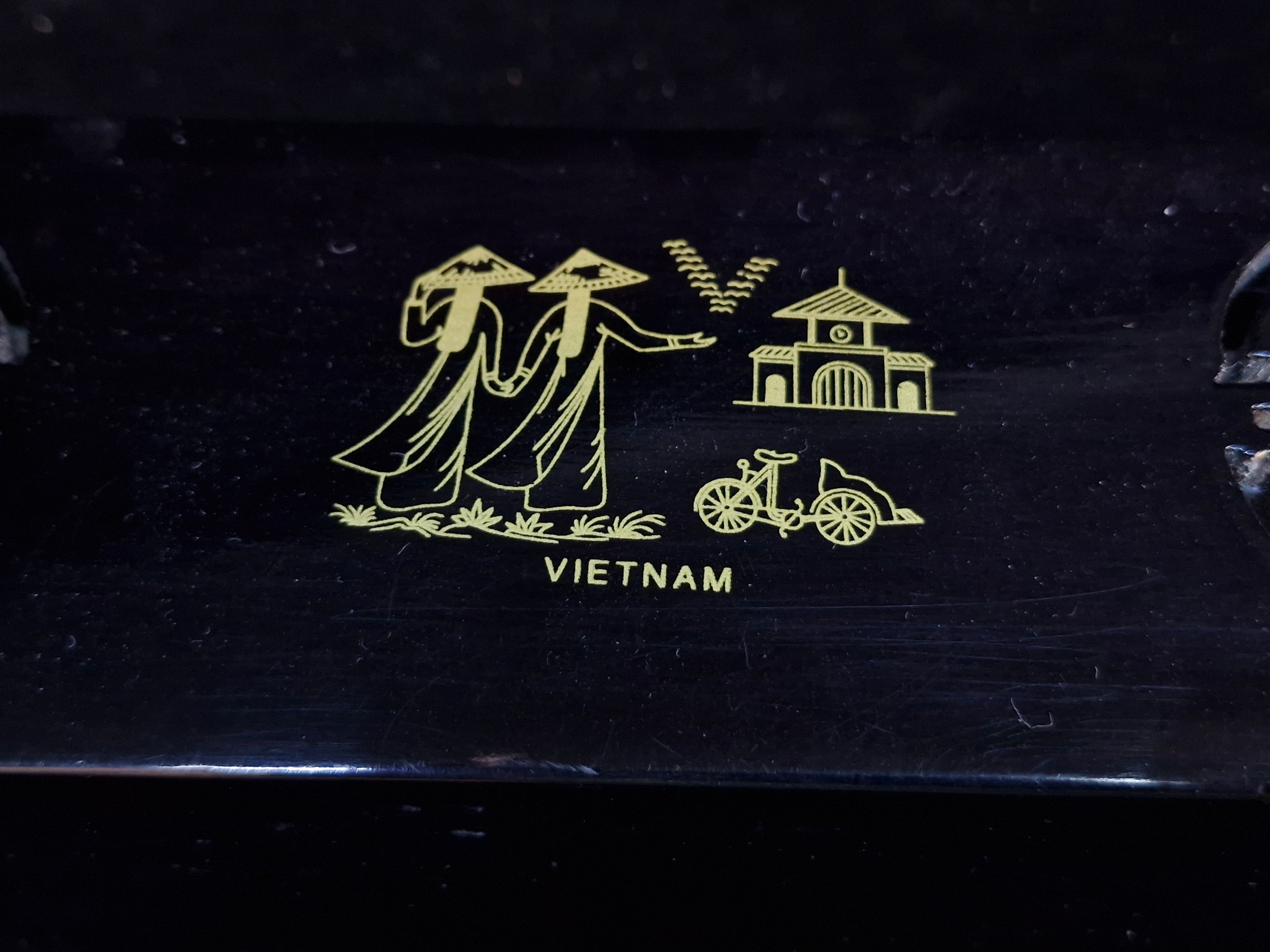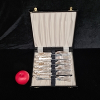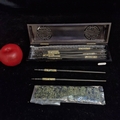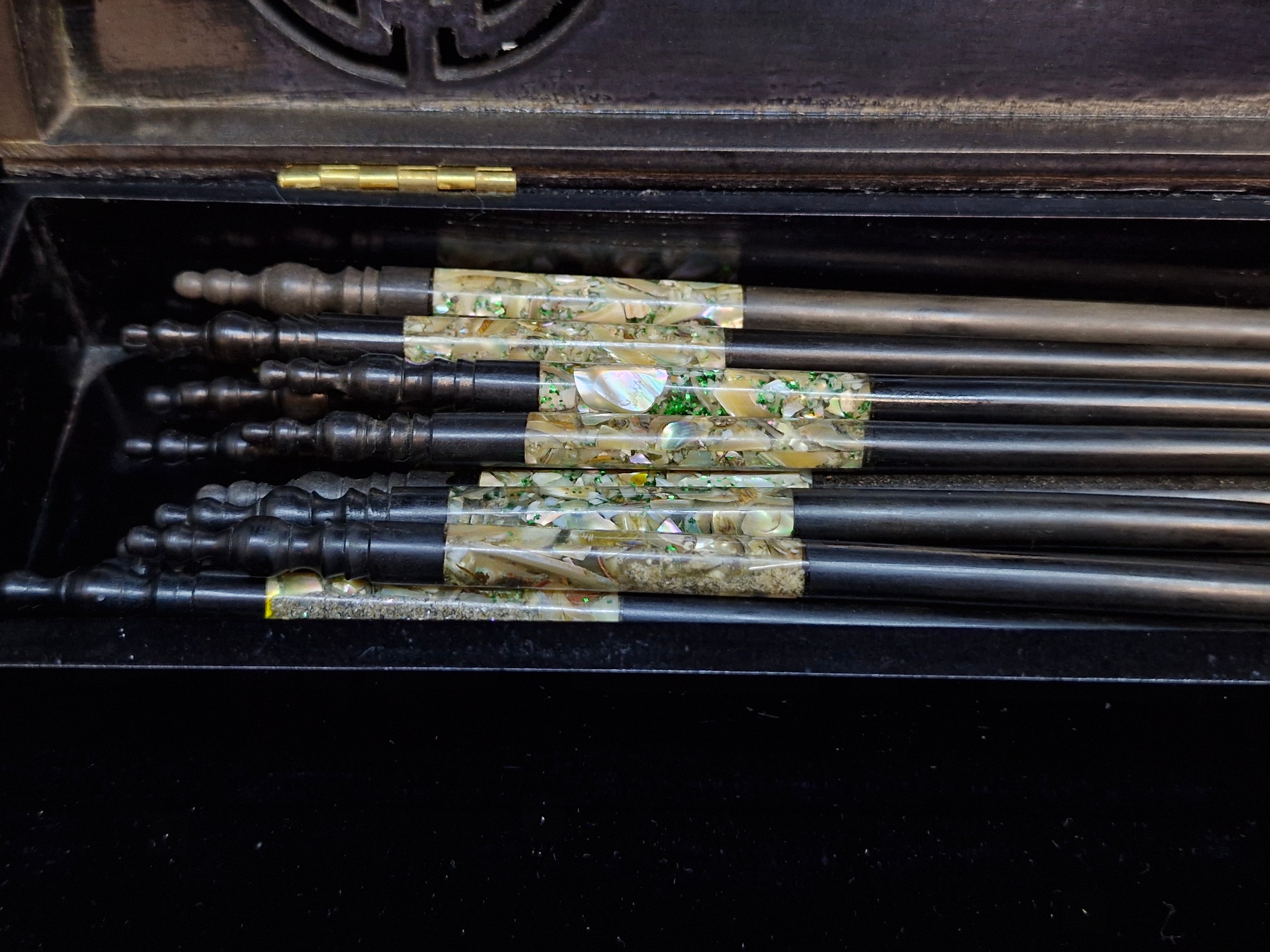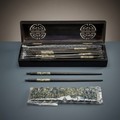 A nice lot of Vietnamese chopsticks and chopstick rests featuring Mother of Pearl accents. Housed in original case attractive ebonised box..