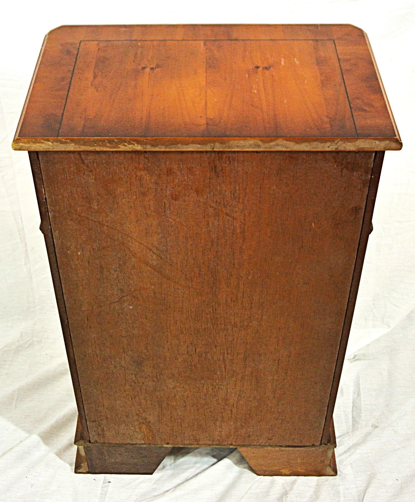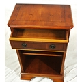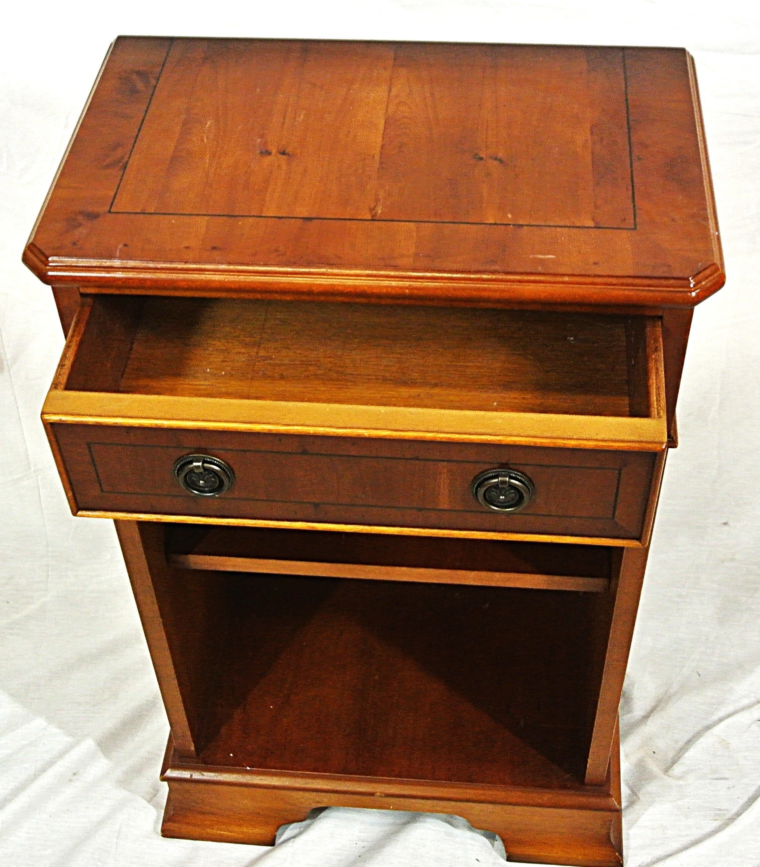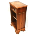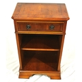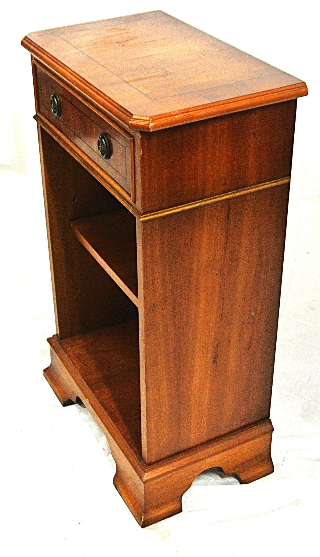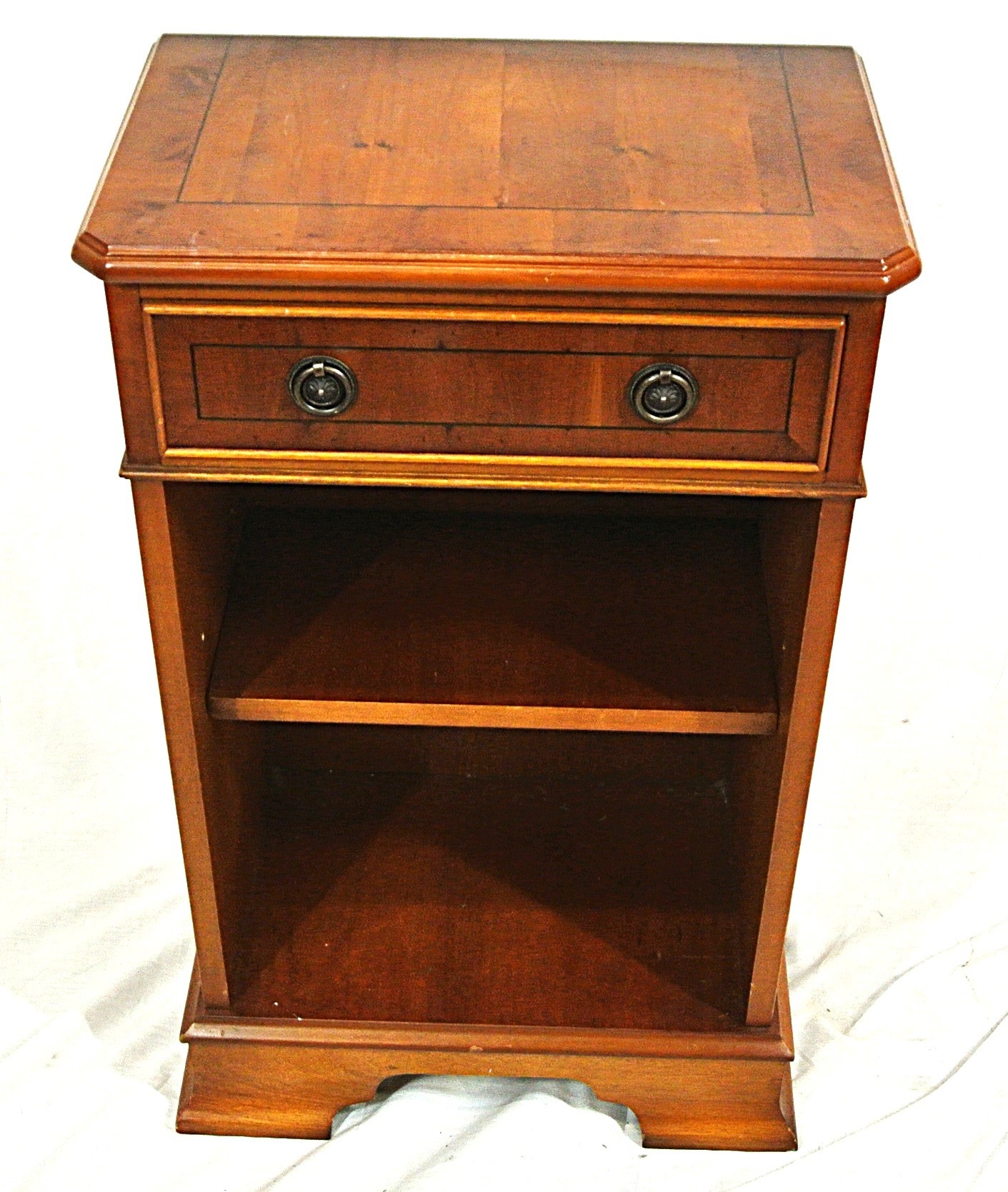 Edwardian design inlaid yew open press with frieze drawer, drop handles, adjustable shelf, on bracket feet