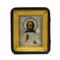 19th century hand painted Russian religious icon with relief silver plated mounts, housed in a glazed rosewood case, 35cm high x 30cm wide