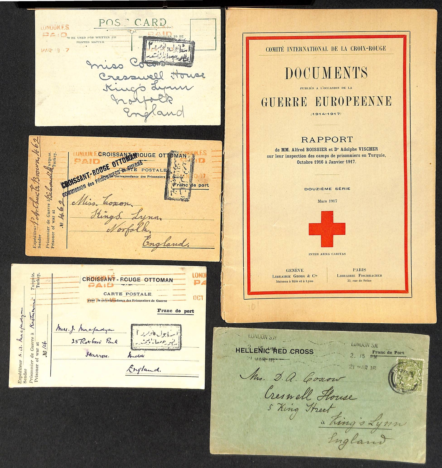 Turkey/Egypt. c.1916-18 Stampless postcards (4) and a cover from British P.O.Ws in Jozgad, Kastamuni (2) or Bilemedik (2), 1916 Hellenic Red Cross postcard posted in London advising a letter from a P.O.W in Turkey has been forwarded and information regarding officers moved from Angora has been requested, and a 1917 card from Switzerland to the wife of Brig. General Smith in India sent by a Red Cross delegate who has met Gen. Smith at Brusa. Also 1916-20 lettersheets (2) and postcard from P.O.Ws in Egypt, one 1920 lettersheet written in Arabic from Sidi Bishr with F.P.O GM skeleton datestamps, and 1917 Red Cross report in French on the P.O.W camps in Turkey. (11).