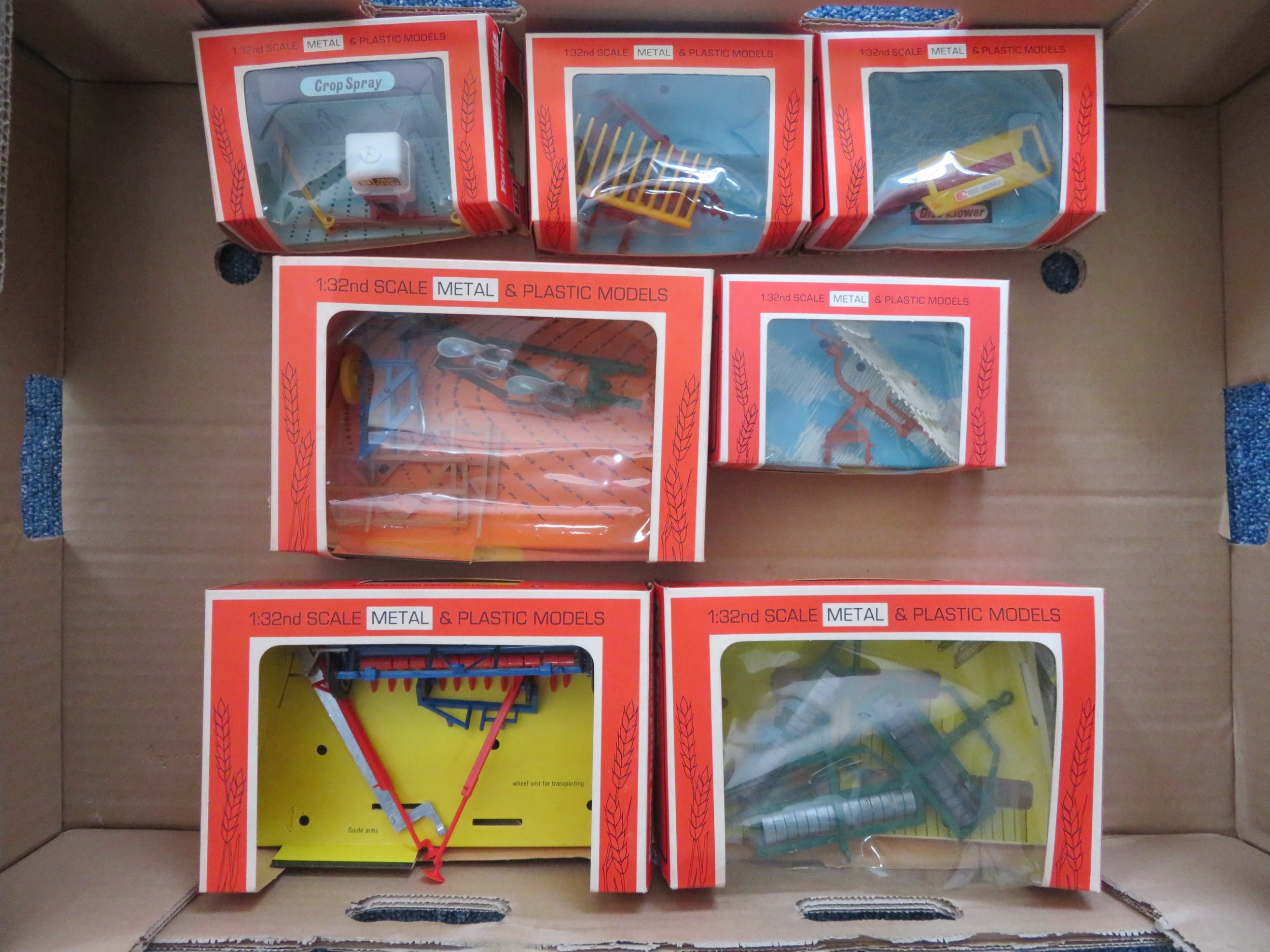Britains Farm range of Implements, with Nos. 9539, 9554, 9546, 9537, 9544, 9543 and 9548, generally excellent in good plus to good window boxes (some with unattached Cellophane). Contents appear complete but unchecked. Viewing recommended. Qty 7