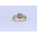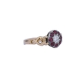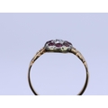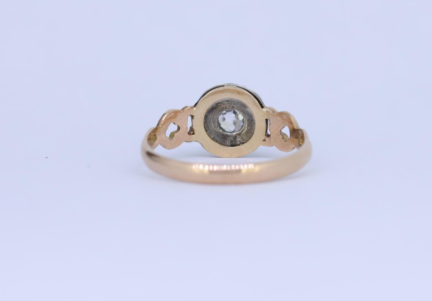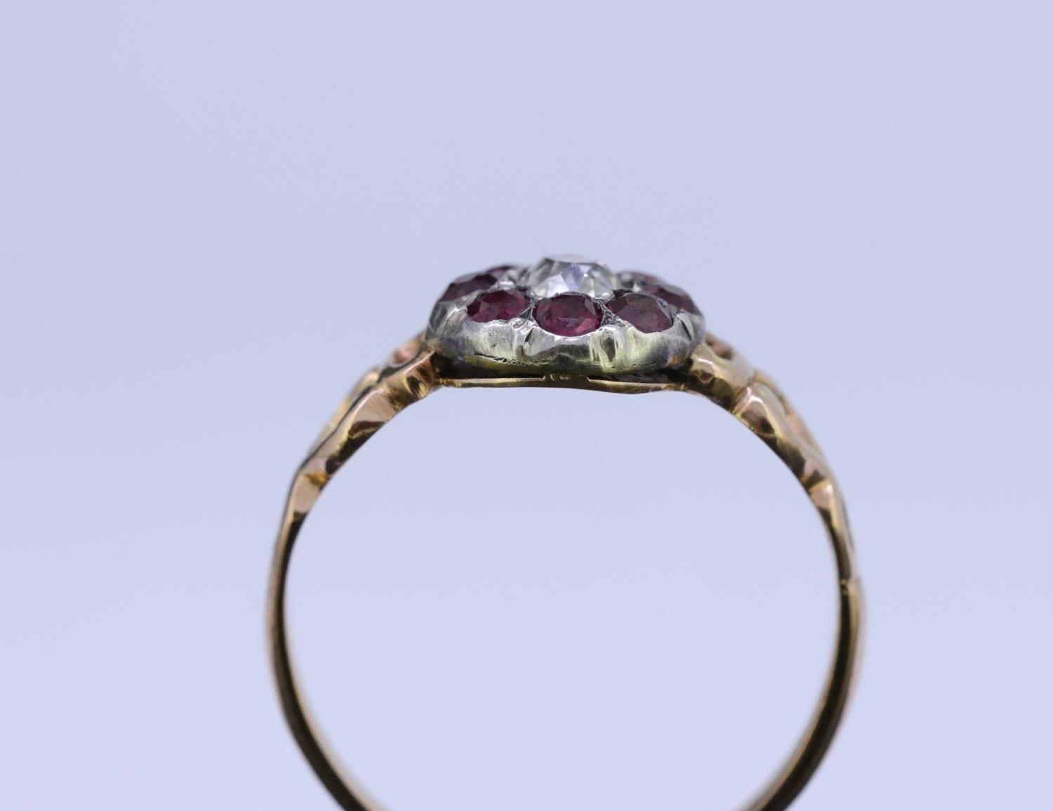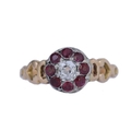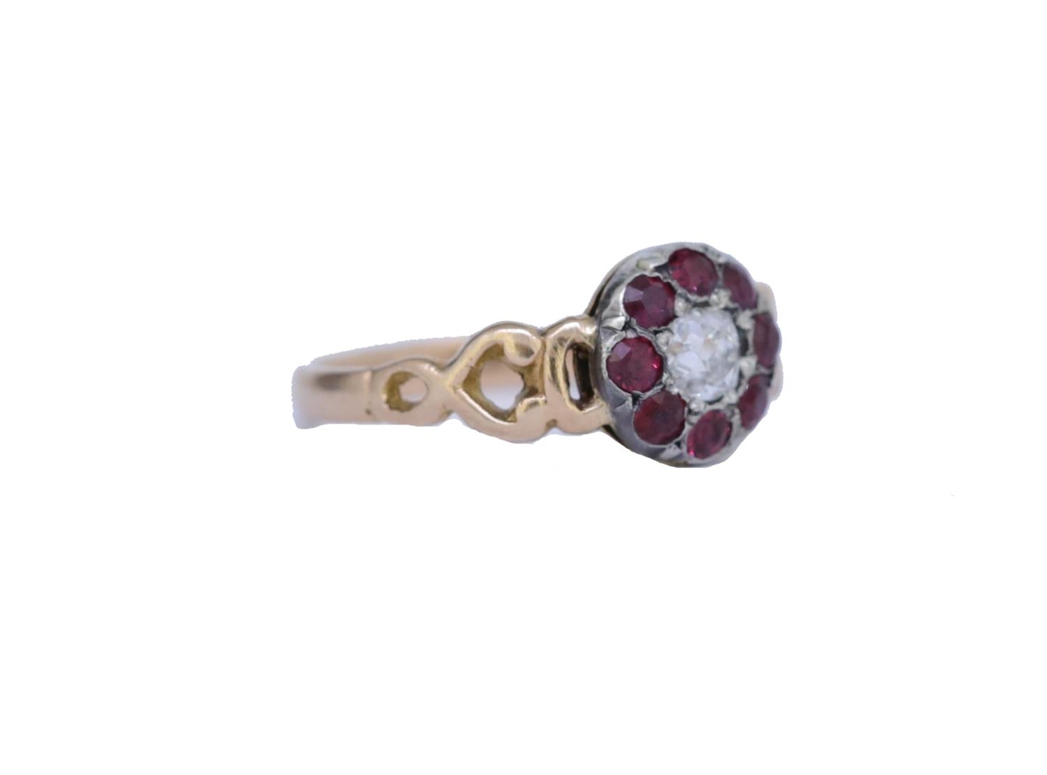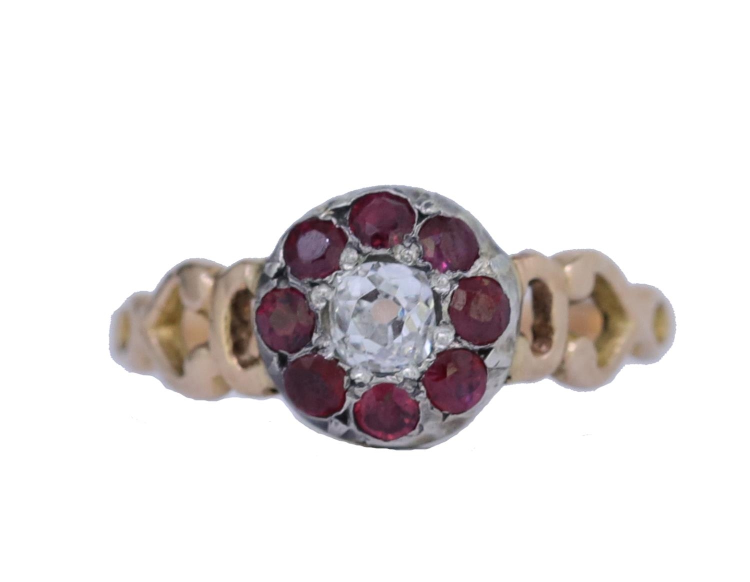 ANTIQUE RUBY AND DIAMOND CLUSTER RING, set with a central diamond of approx. 0.20 ct. surrounded by 8 rubies, with openwork scrolling shoulders. Size J. 1.7 grams.
