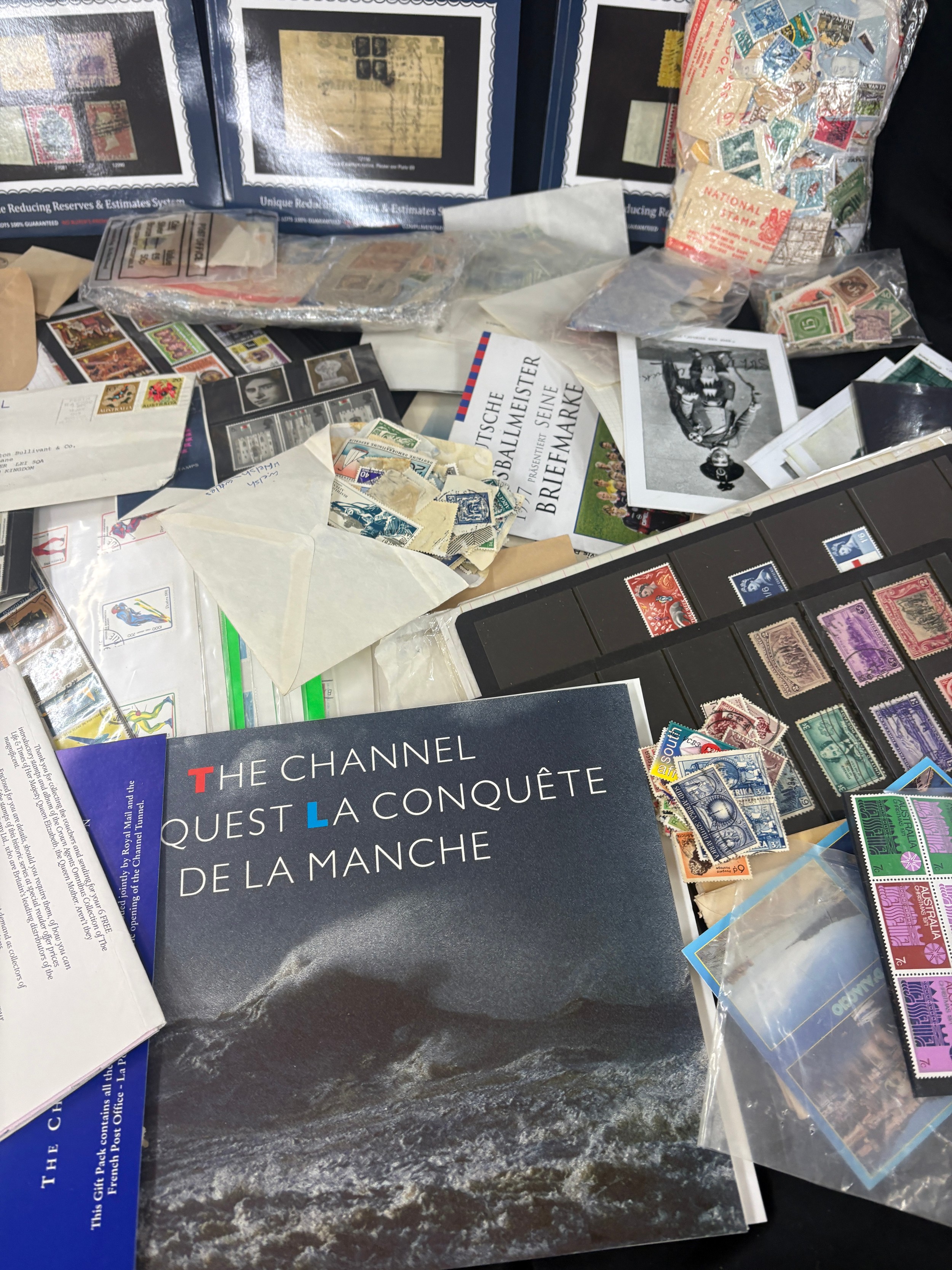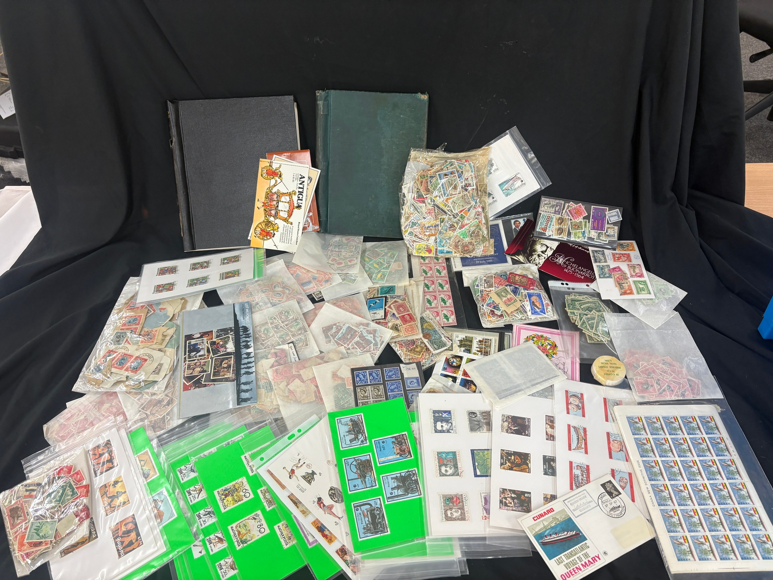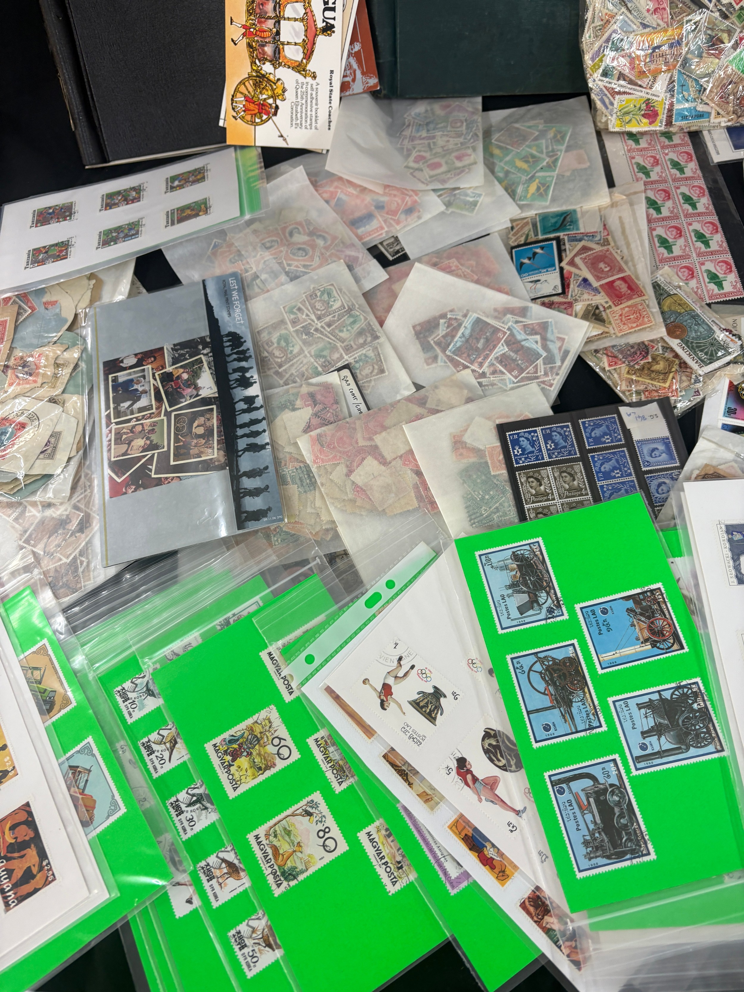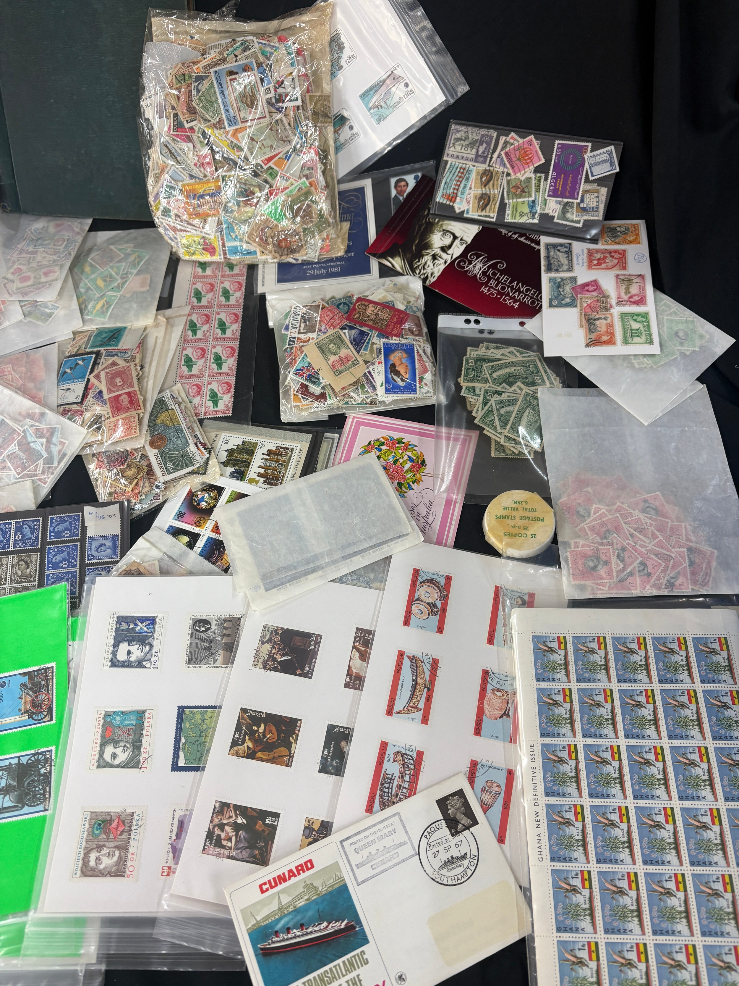 Large stamp collection, many high values, mostly British commonwealth, includes worldwide. Display cards. pages, packets etc, mint drums of stamps, special editions etc