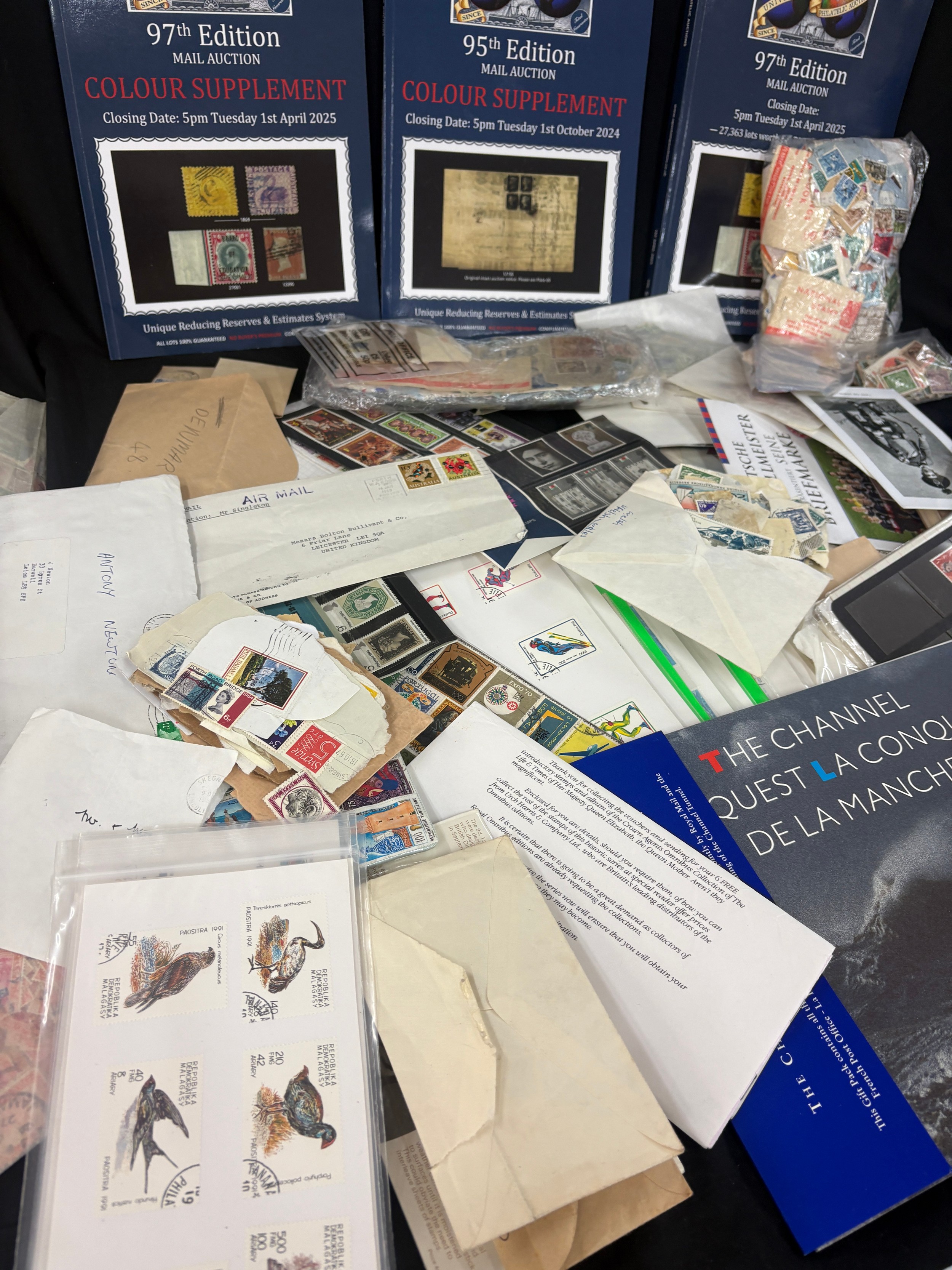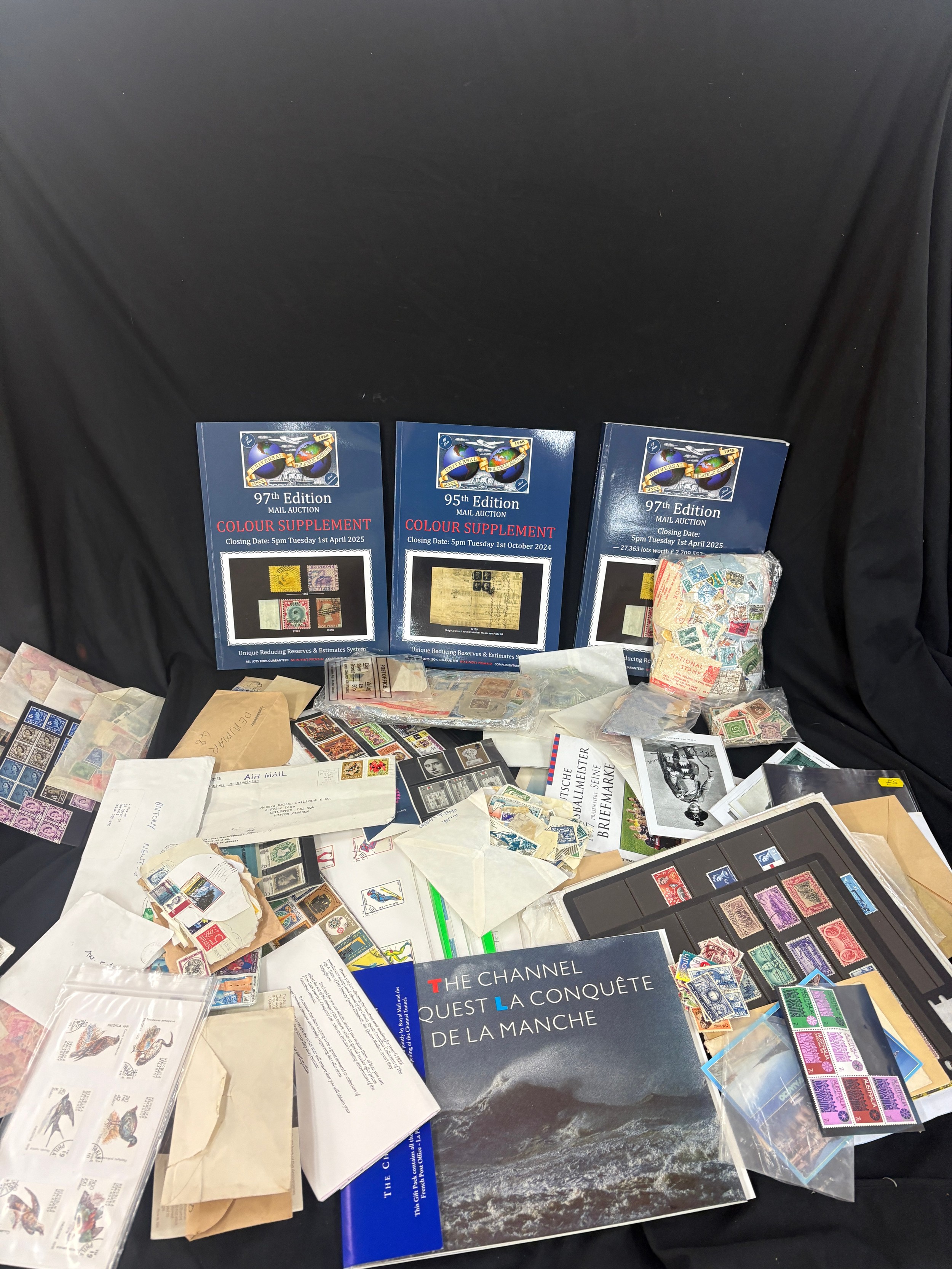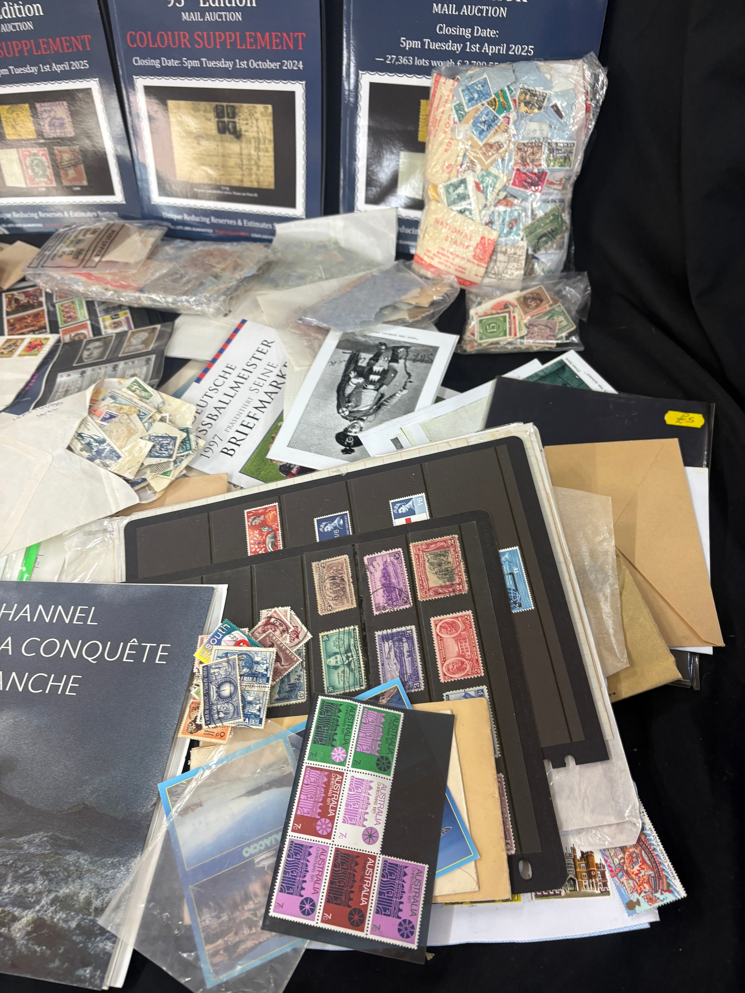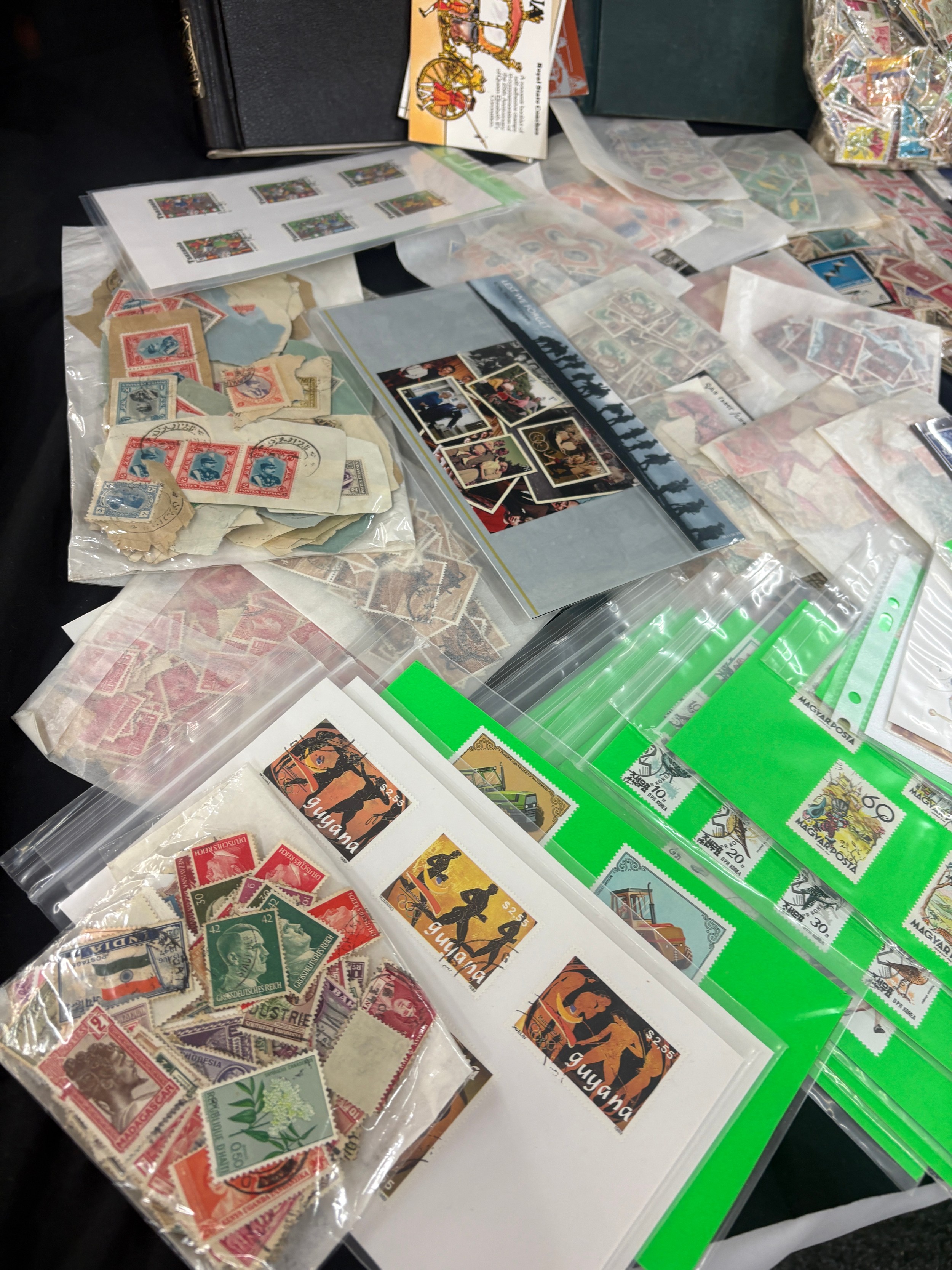 Large stamp collection, many high values, mostly British commonwealth, includes worldwide. Display cards. pages, packets etc, mint drums of stamps, special editions etc
