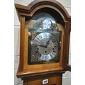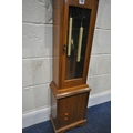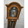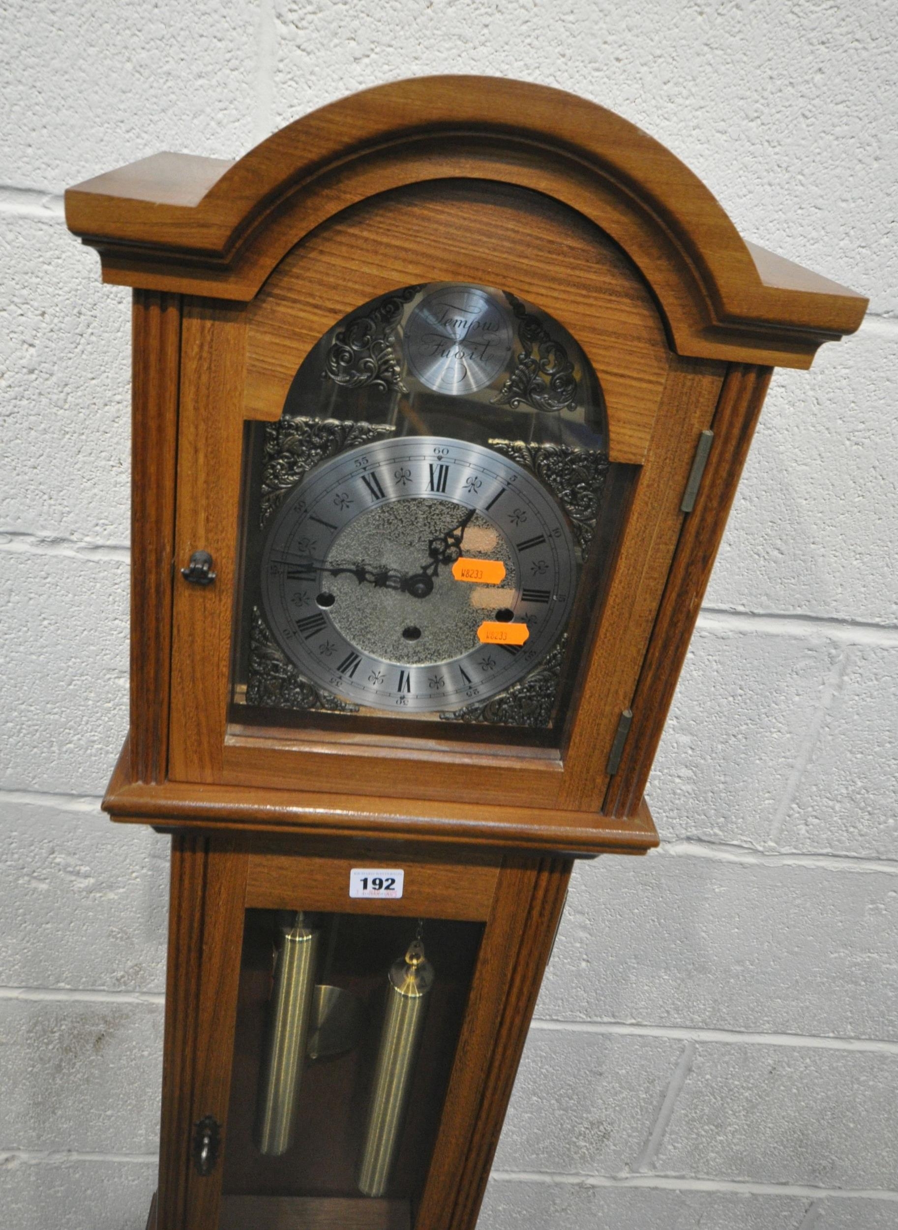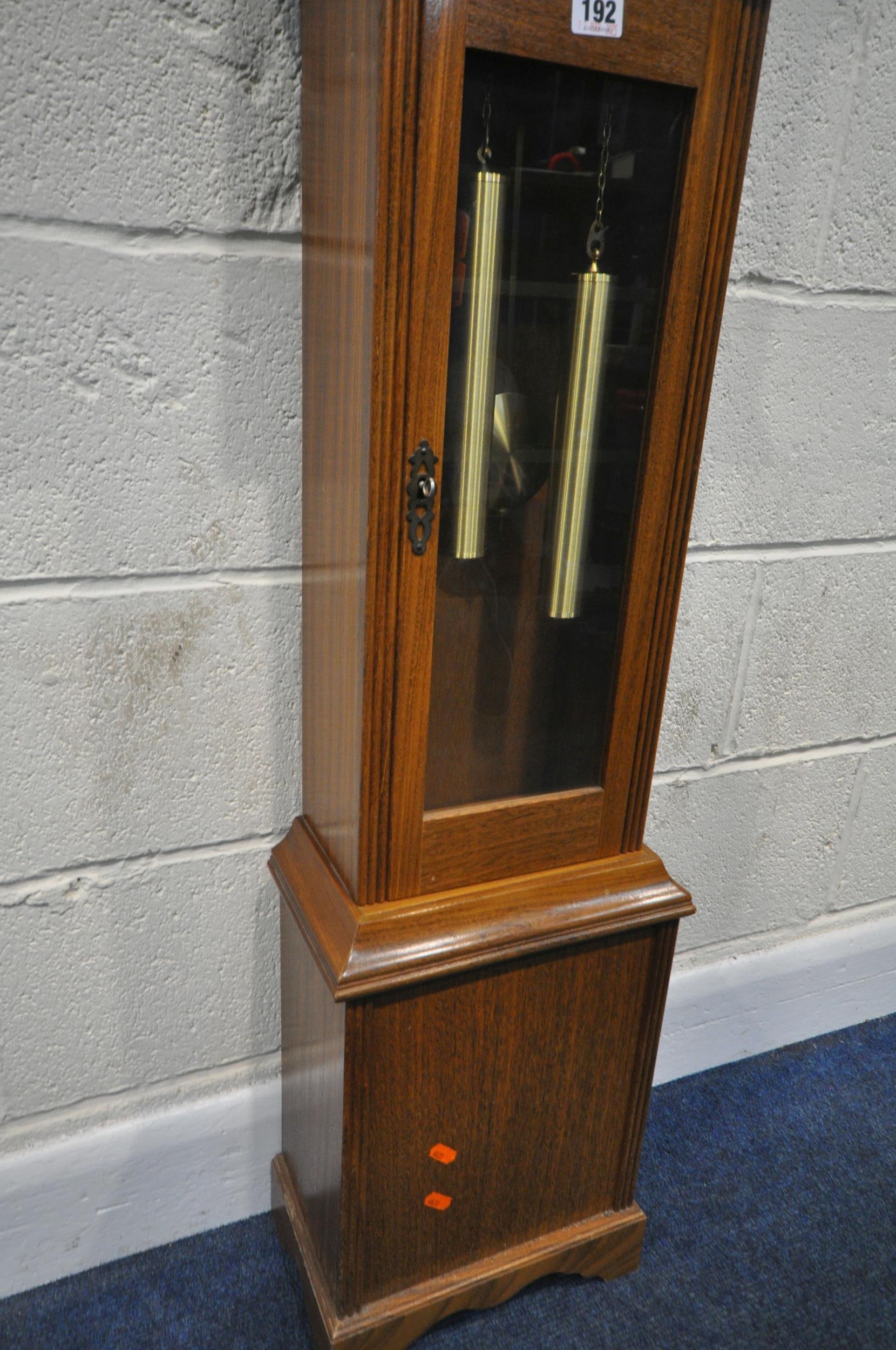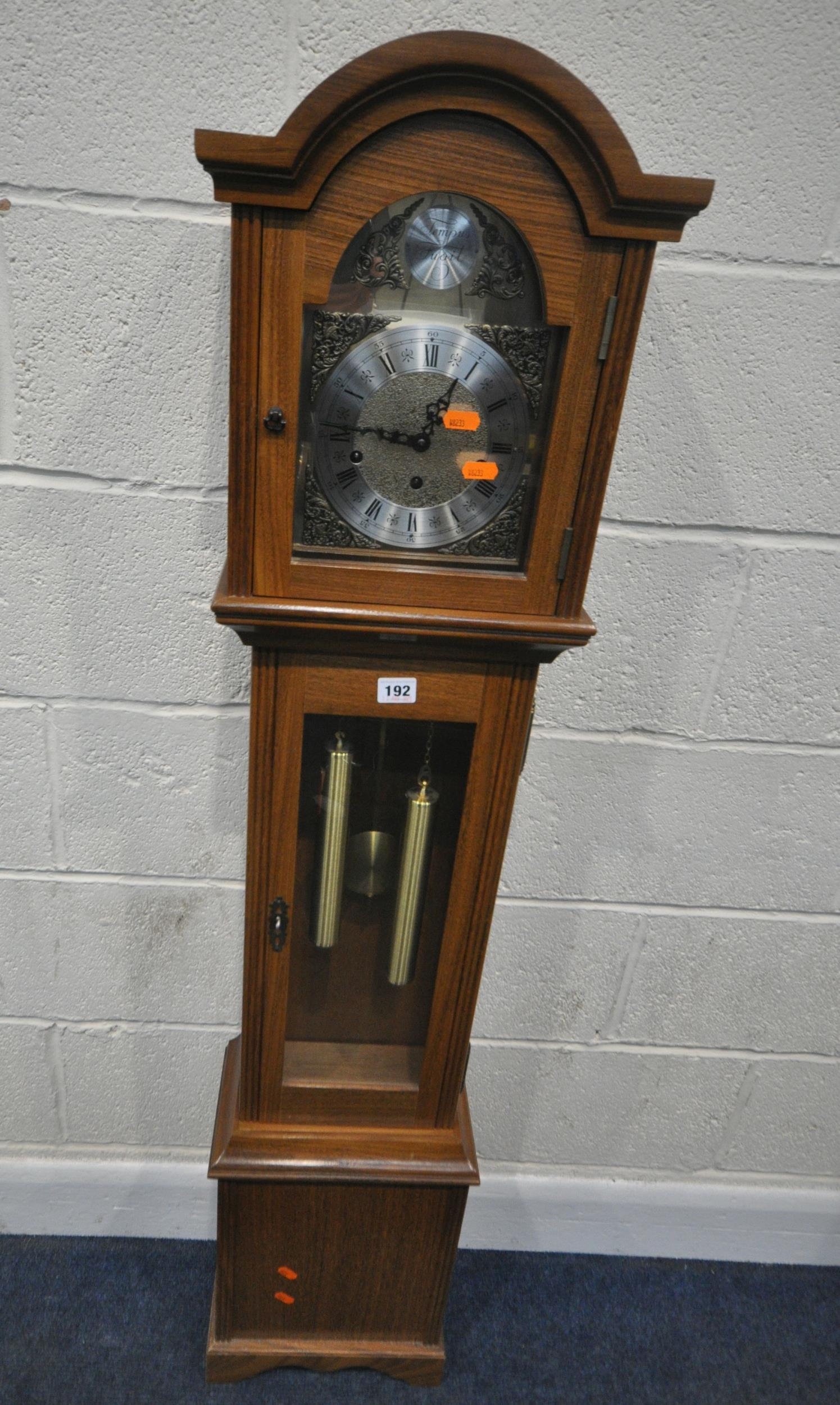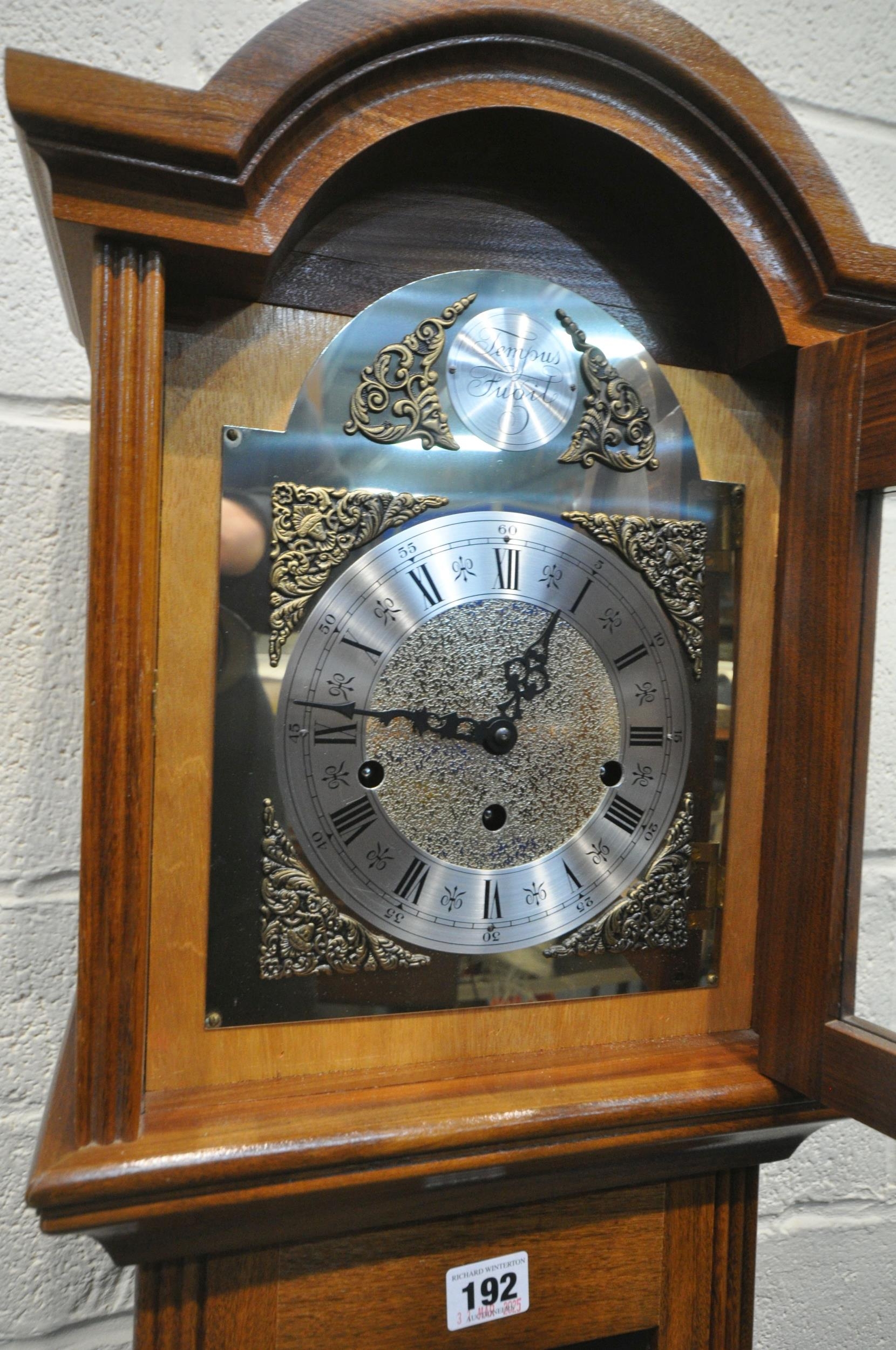 A LATE 20TH CENTURY GRANDDAUGHTER CLOCK, the arched glass door enclosing a 6.5 brass and silvered dial, depicting Roman numerals, signed Tempus Fugit, over a glass door, on a box plinth, height 139cm, condition report: untested, overall good condition, one winding key, one trunk key, one pendulum, two weights