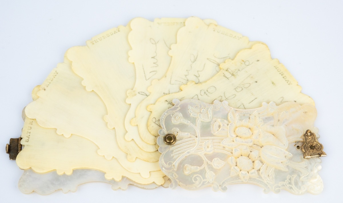 LATE VICTORIAN MOTHER OF PEARL AIDE MEMOIRE of rococo form, the front carved with a bouquet of flowers, the six internal pages printed to the top 'Monday-to-Saturday' (c/r - gilt metal clip requires minor repair)