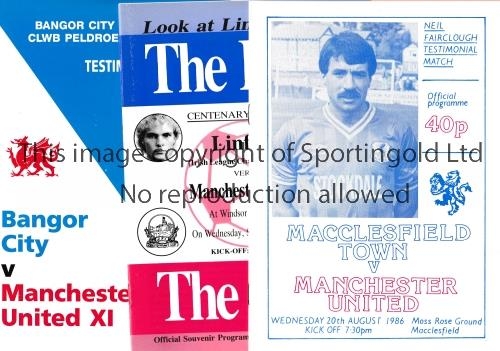 MANCHESTER UNITED Twenty three away programmes for the Friendly matches from the 1980's and 1990's, including, v Macclesfield Town 20/8/1986, Neil Fairclough Testimonial, Linfield 10/9/1986, Centenary, Bangor City 6/8/1988, Phil Lunn Testimonial, Cheadle Town 23/2/1995, to mark the Inauguration of the Floodlights and Blackpool Mechanics 29/7/1995. Generally good