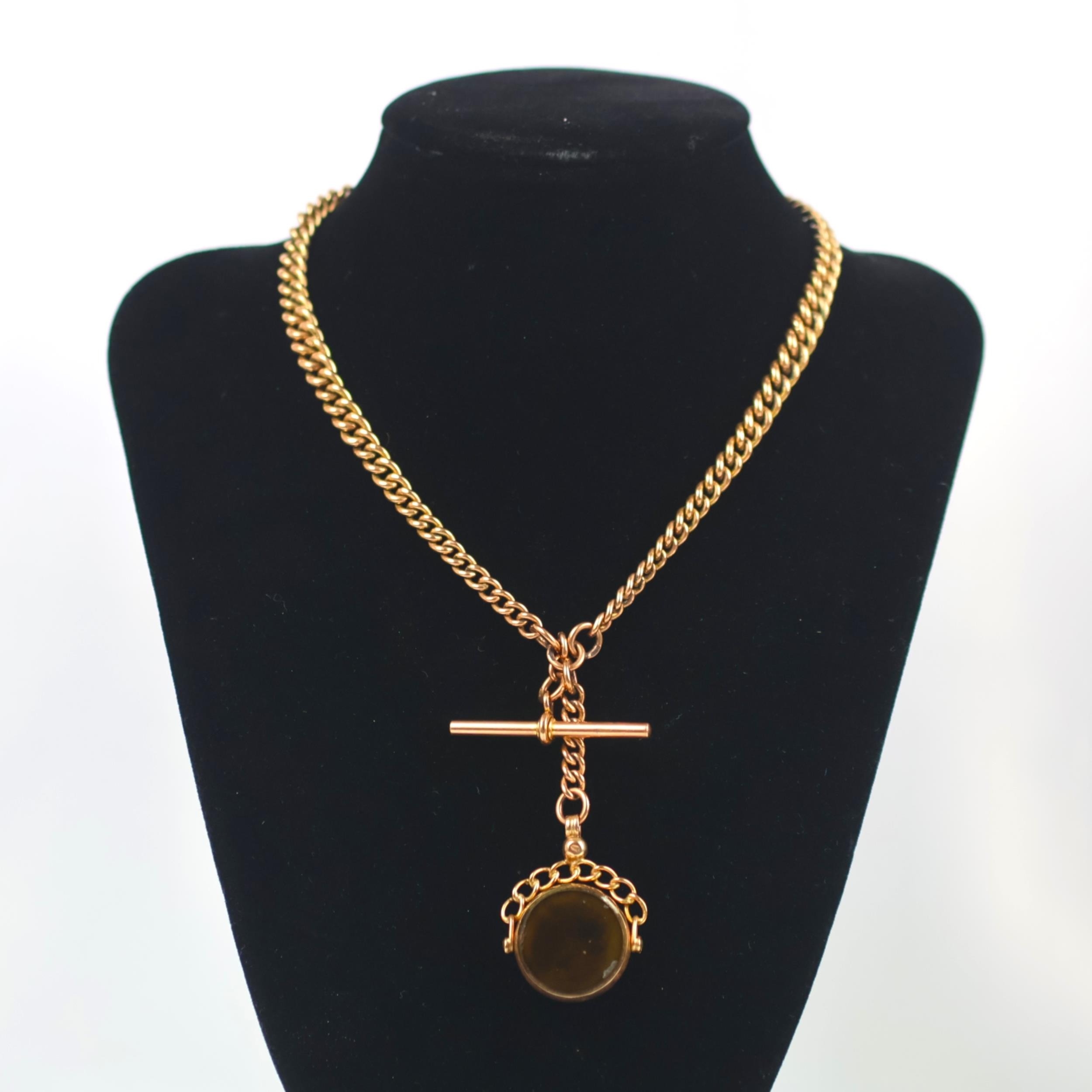 An early 20th century style 9ct watch chain, the graduated curb links stamped '9.375' suspending two lobster swivels, a 'T-bar' and associated 9ct gold mounted bloodstone set swivel fob, 37cm long, gross weight 43.5gms