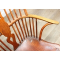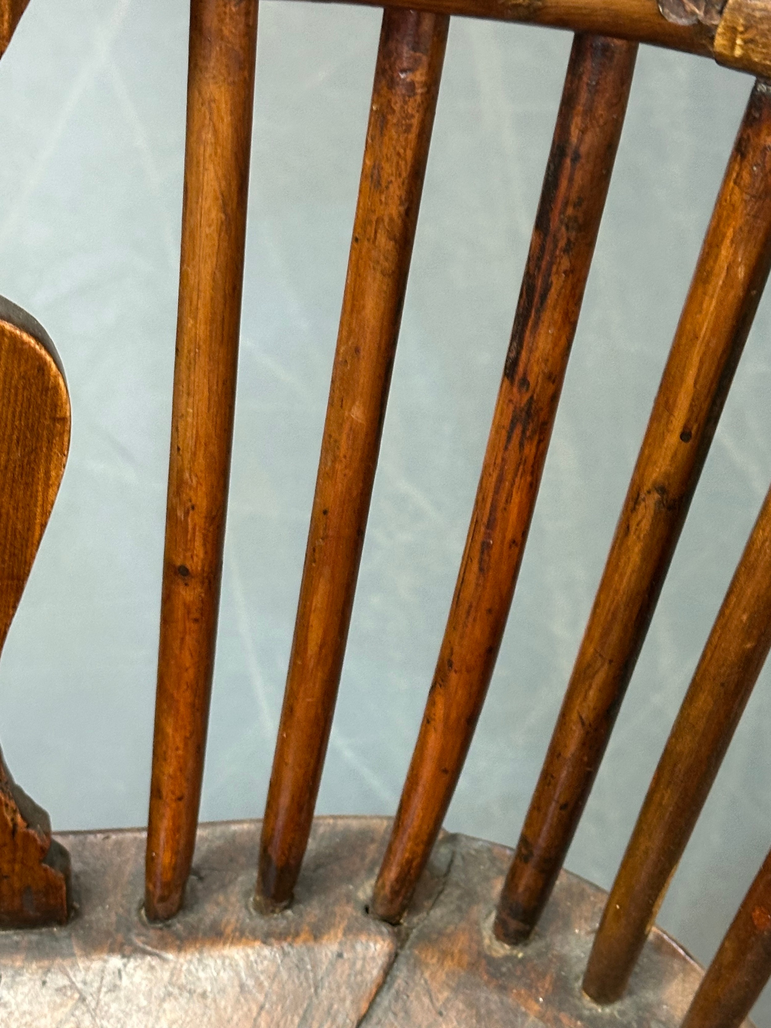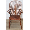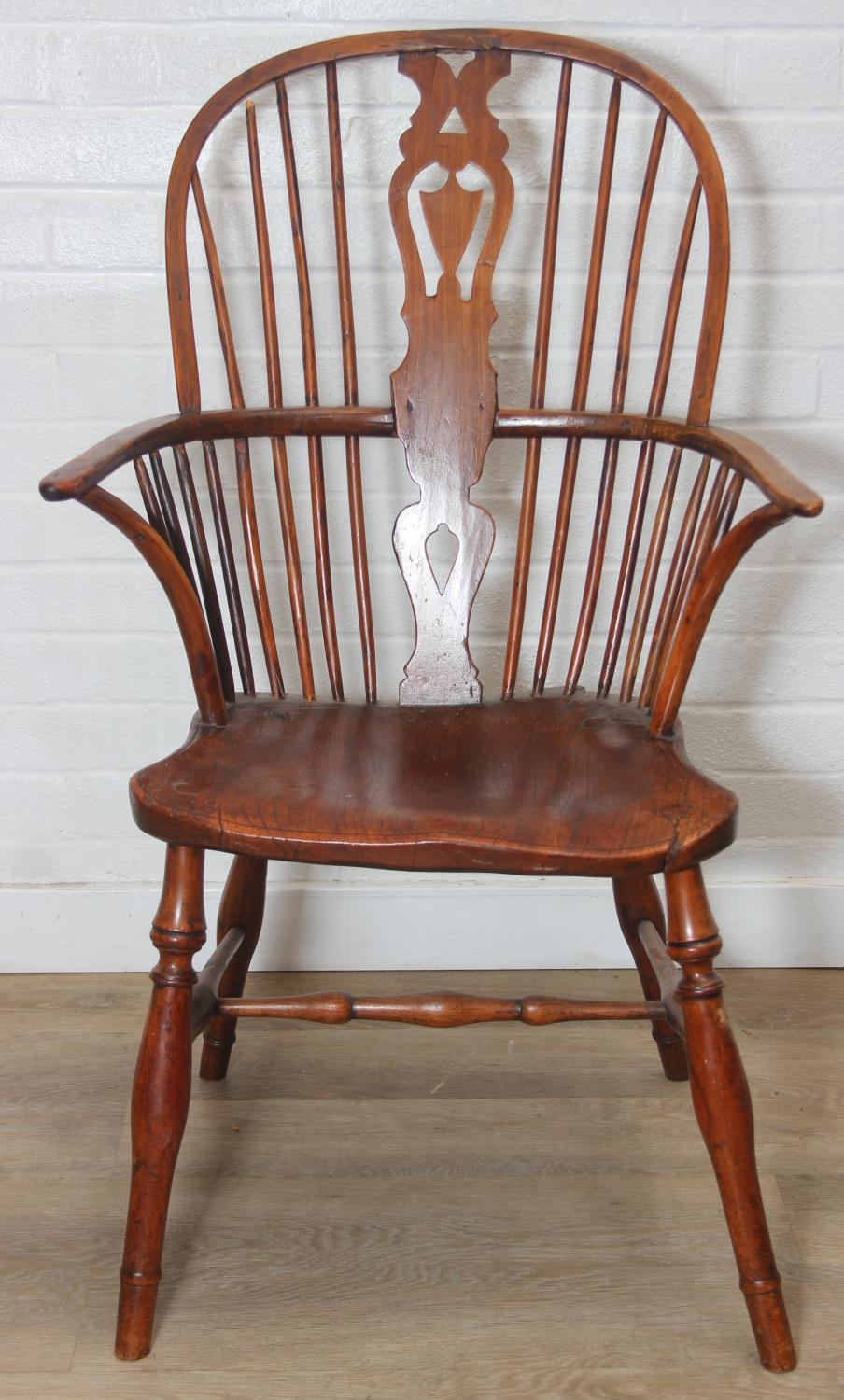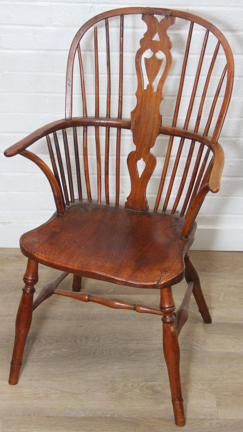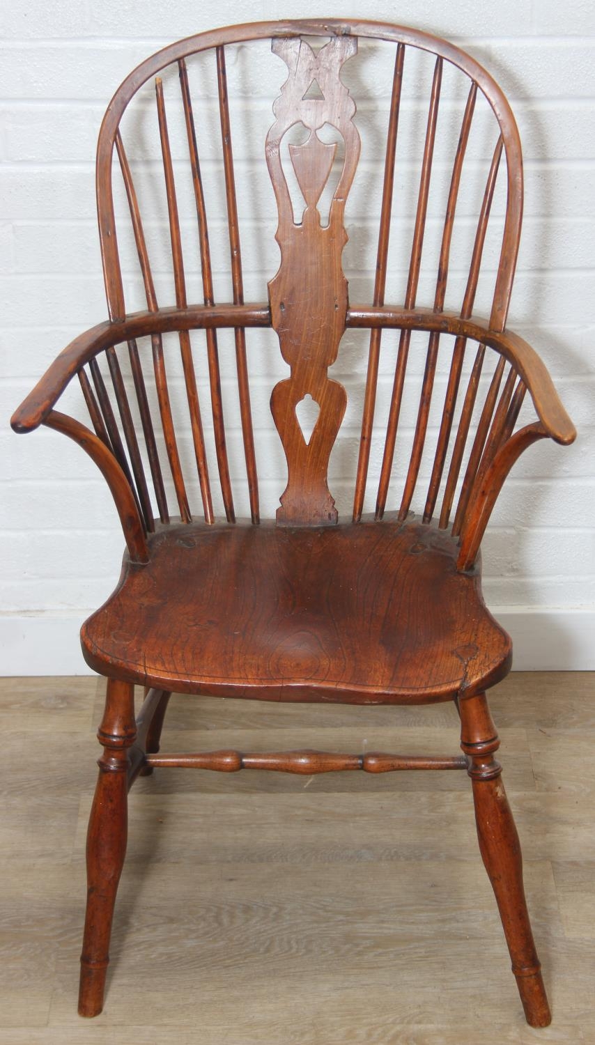 An antique elm seated Thames Valley or Windsor farmhouse armchair with stick back and decorative splat, 59cm wide x 97cm tall