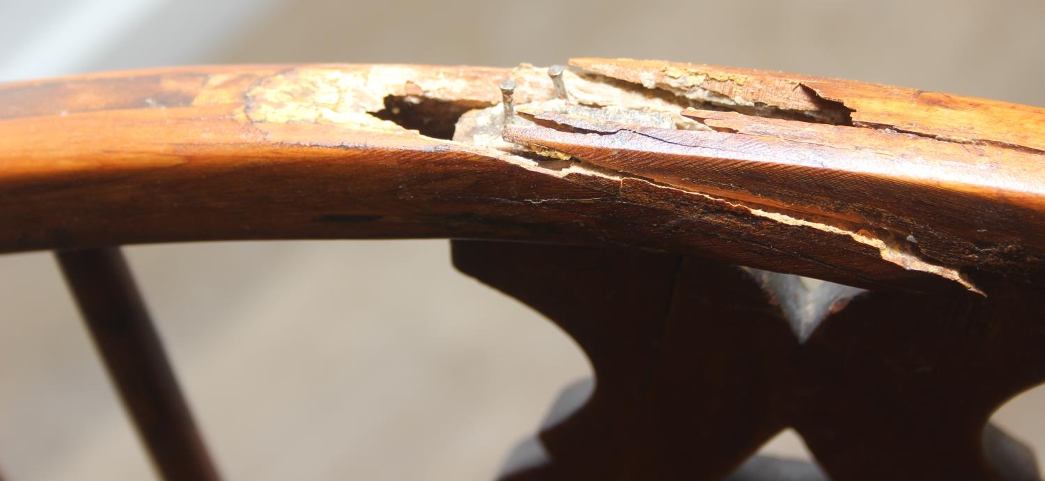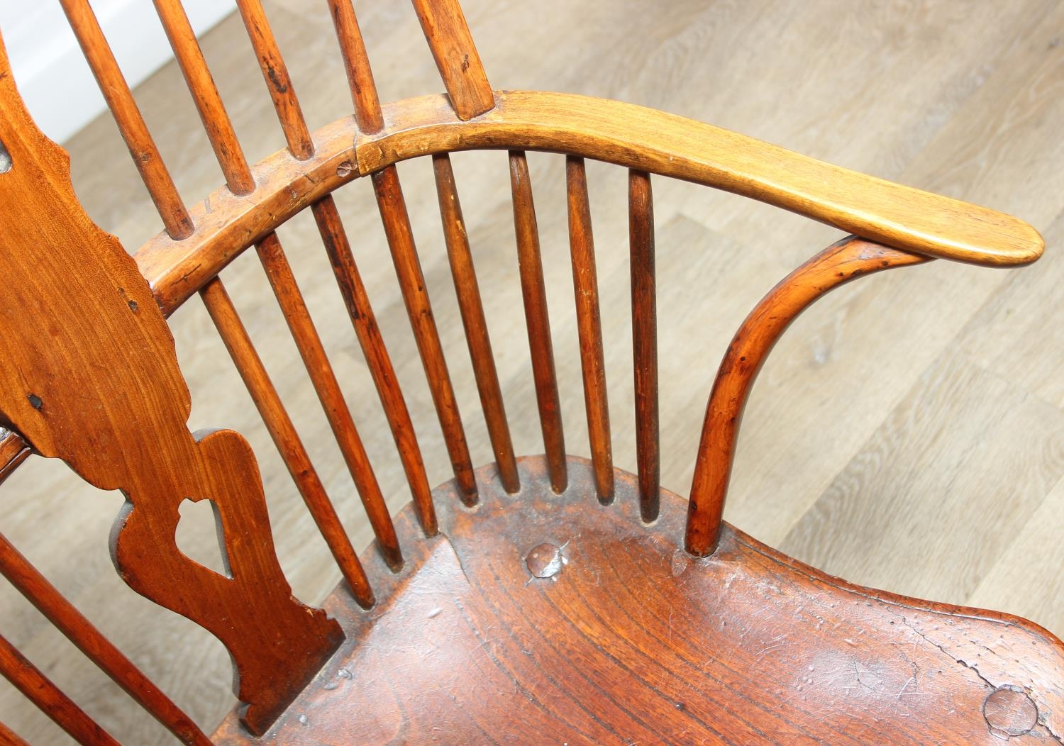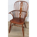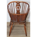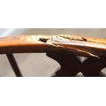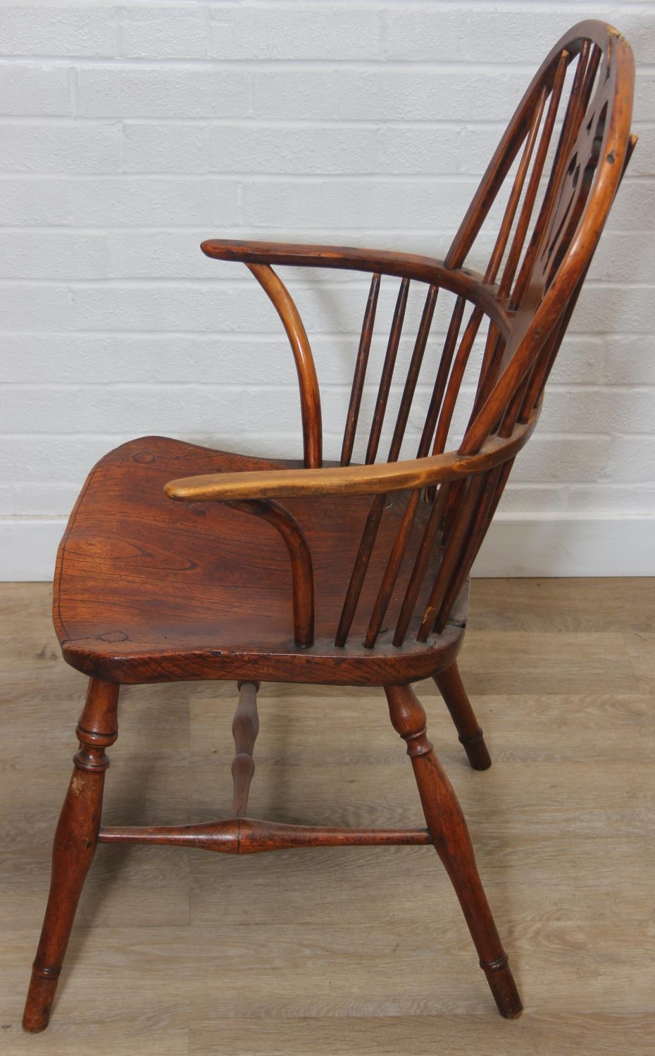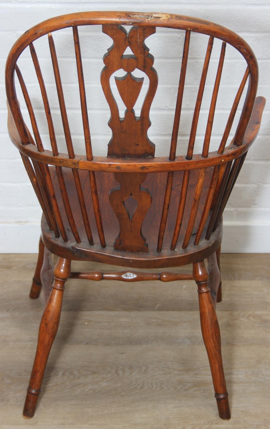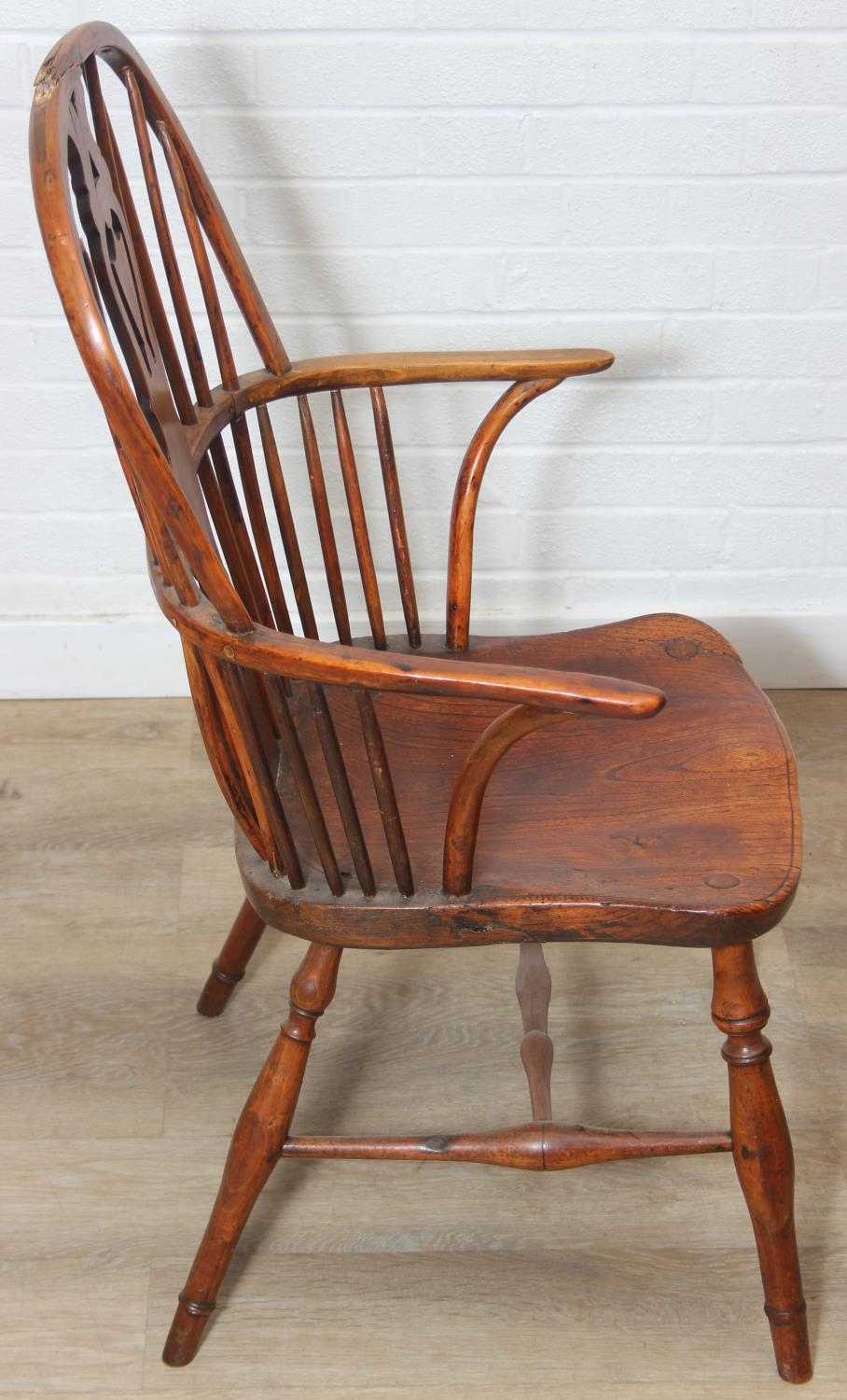 An antique elm seated Thames Valley or Windsor farmhouse armchair with stick back and decorative splat, 59cm wide x 97cm tall