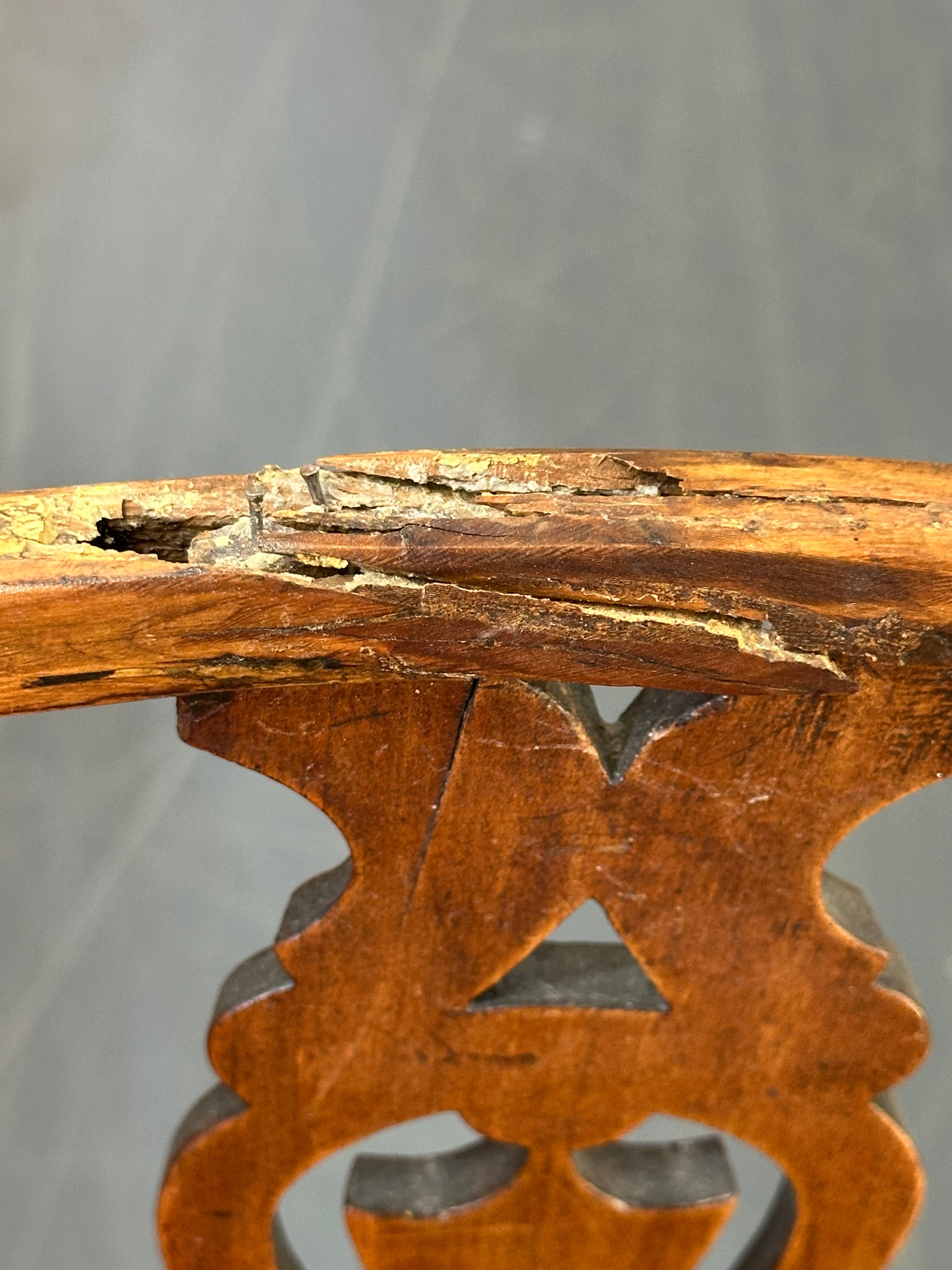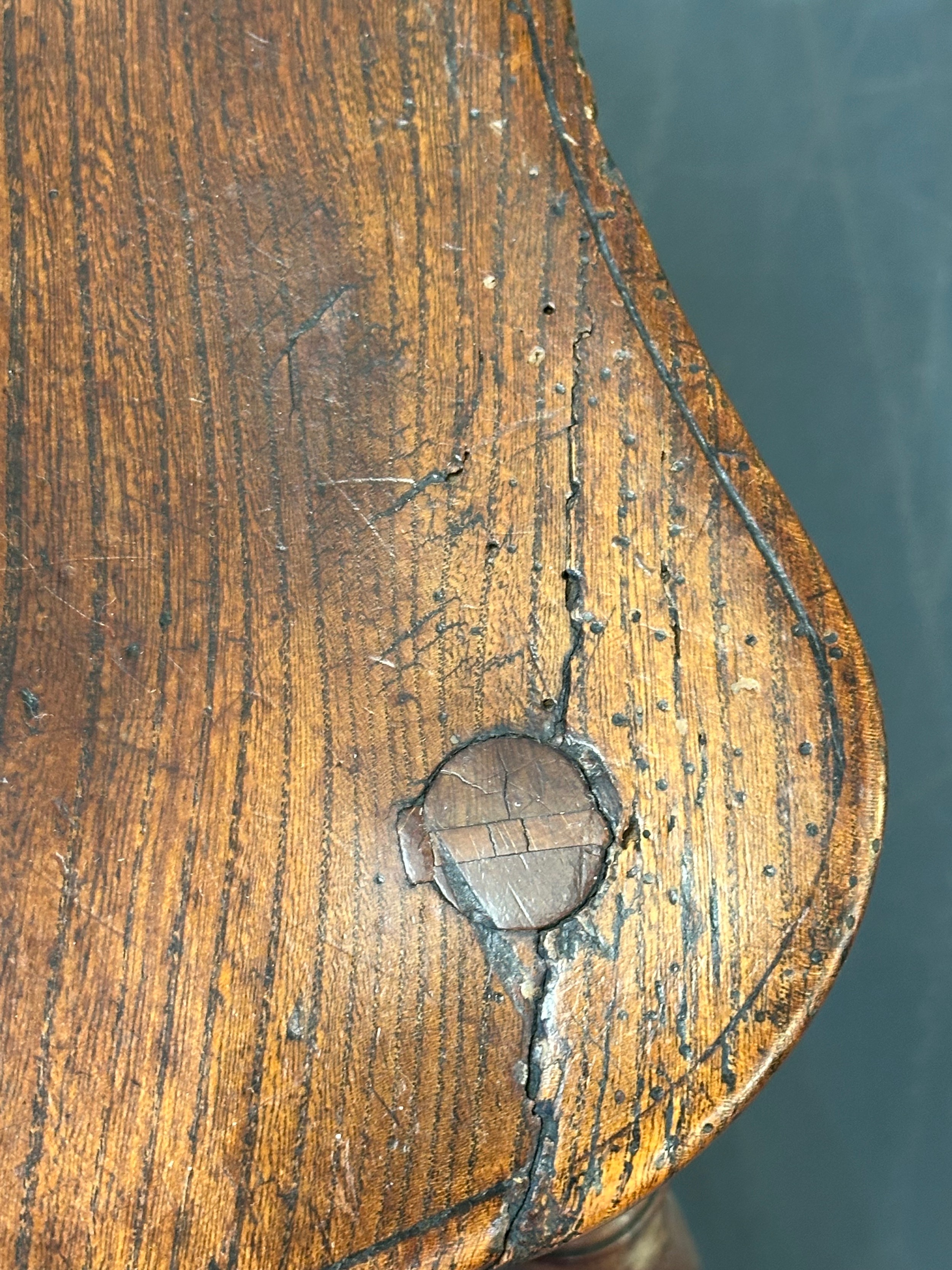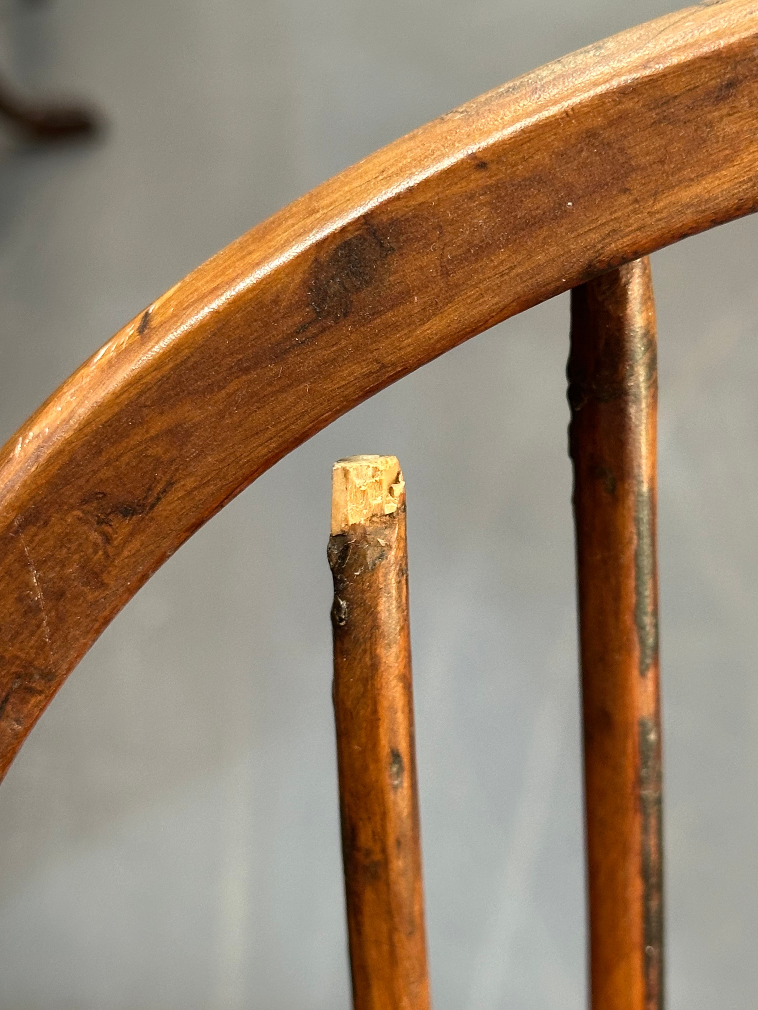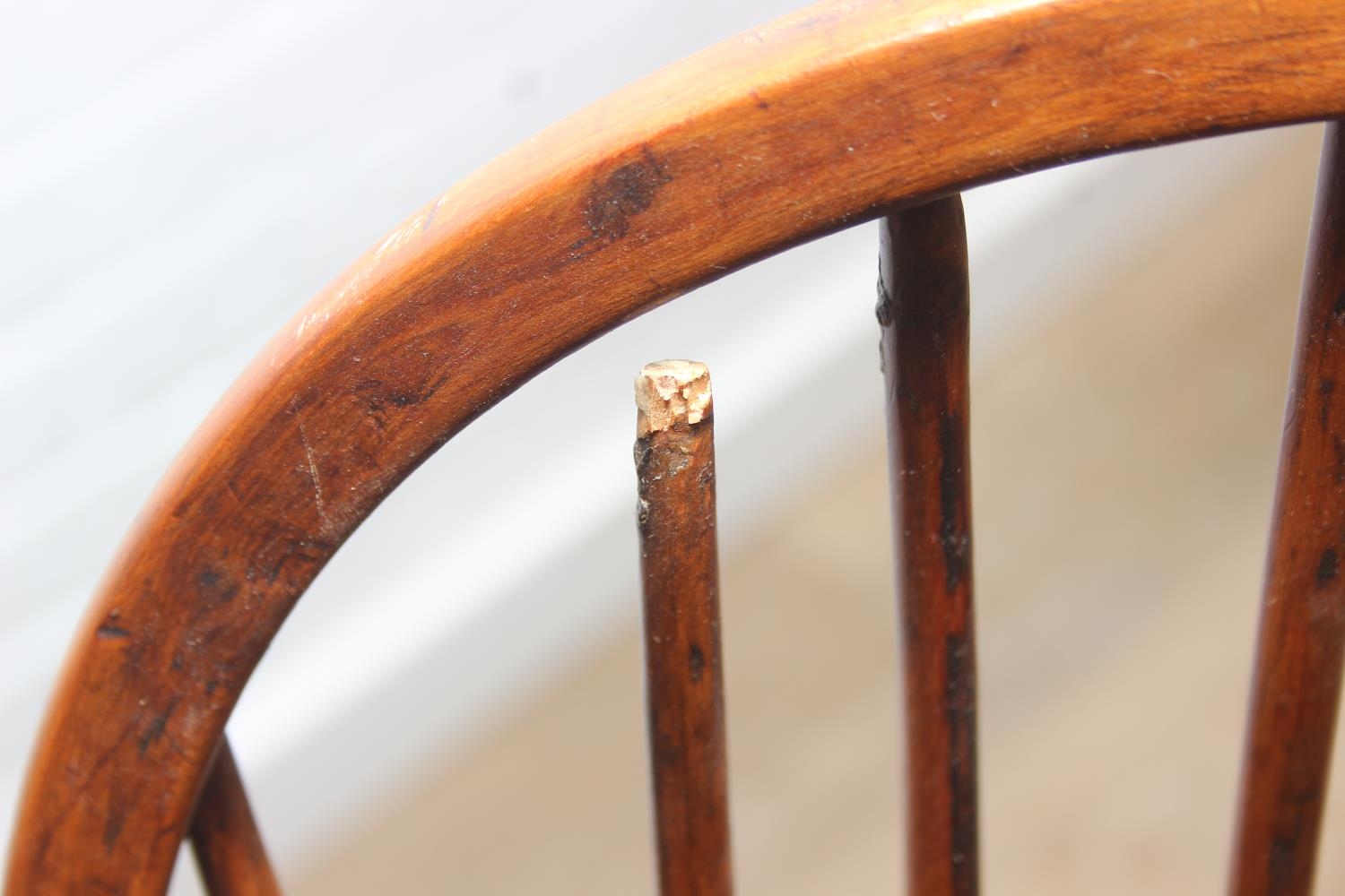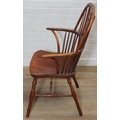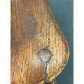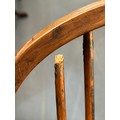 An antique elm seated Thames Valley or Windsor farmhouse armchair with stick back and decorative splat, 59cm wide x 97cm tall