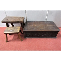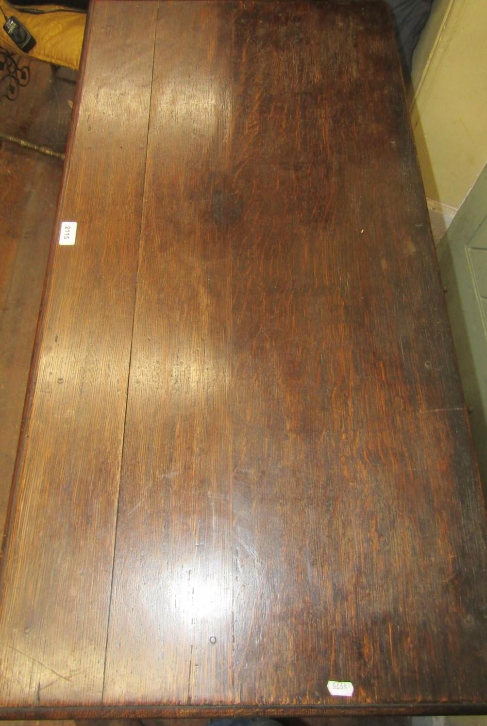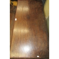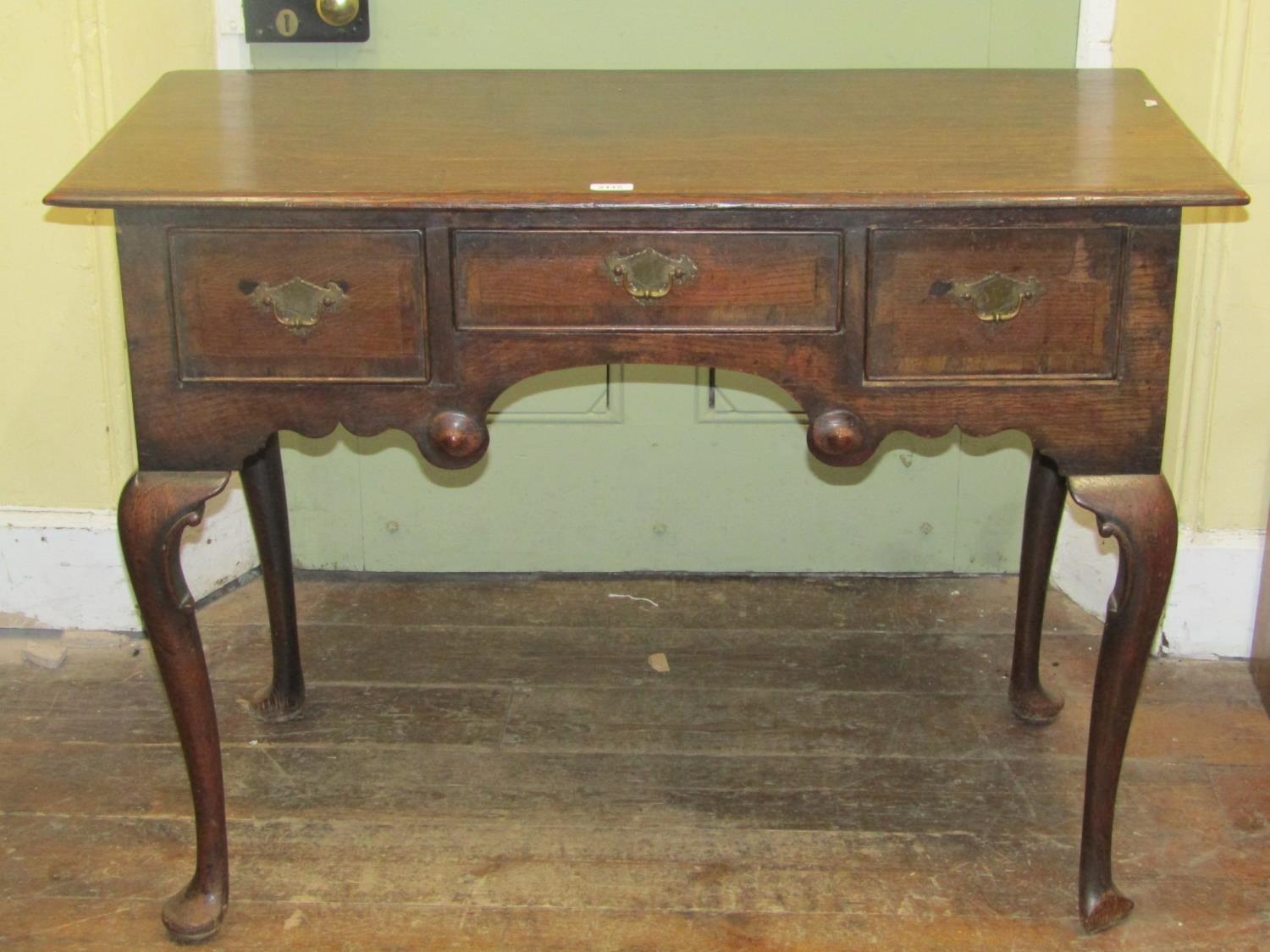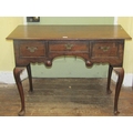 A 19th century oak side table or low boy, fitted with three drawers, crossbanded in walnut, with shaped apron, raised on four pad feet, with C scroll and other detail, 108cm wide