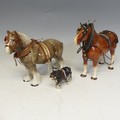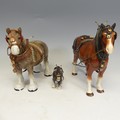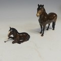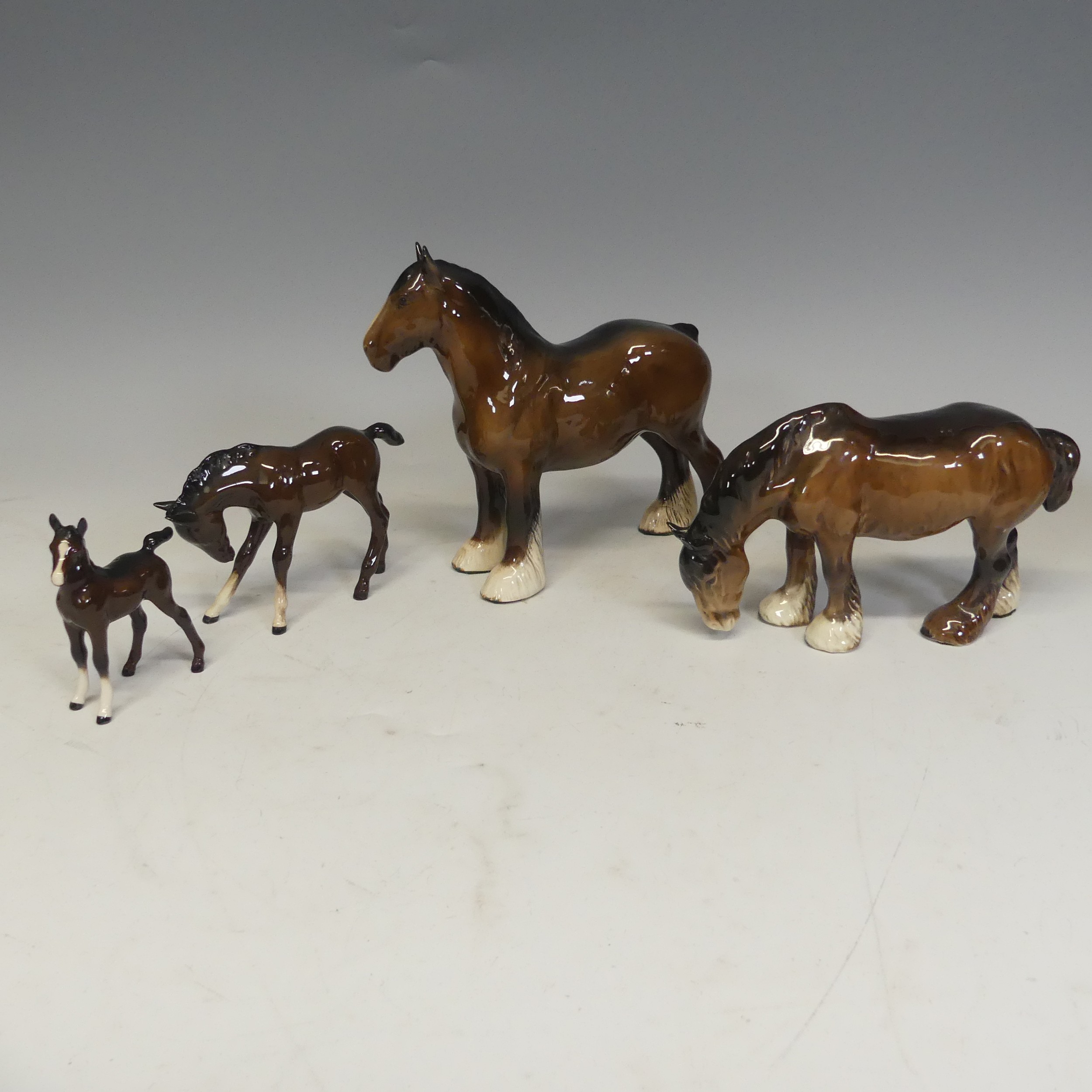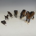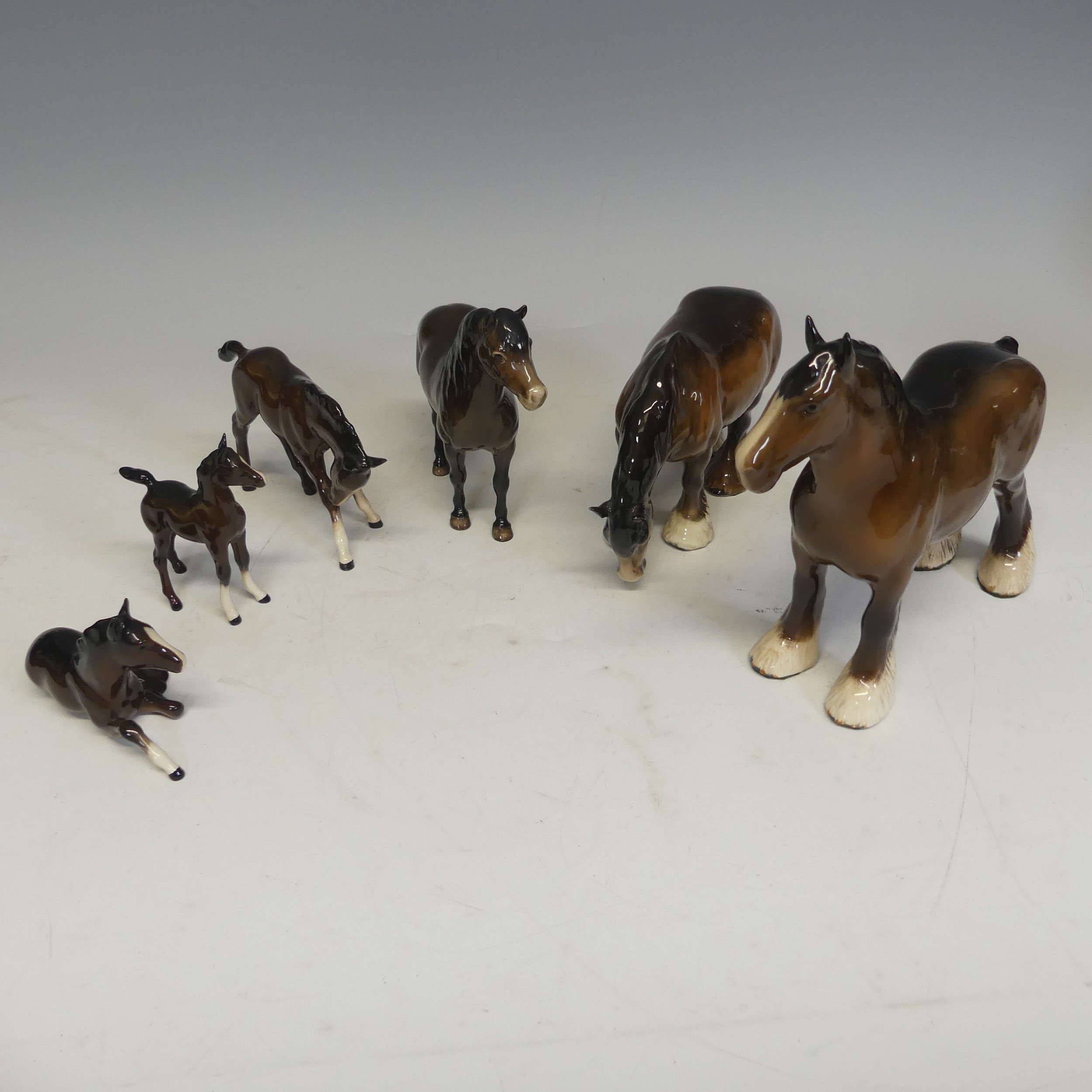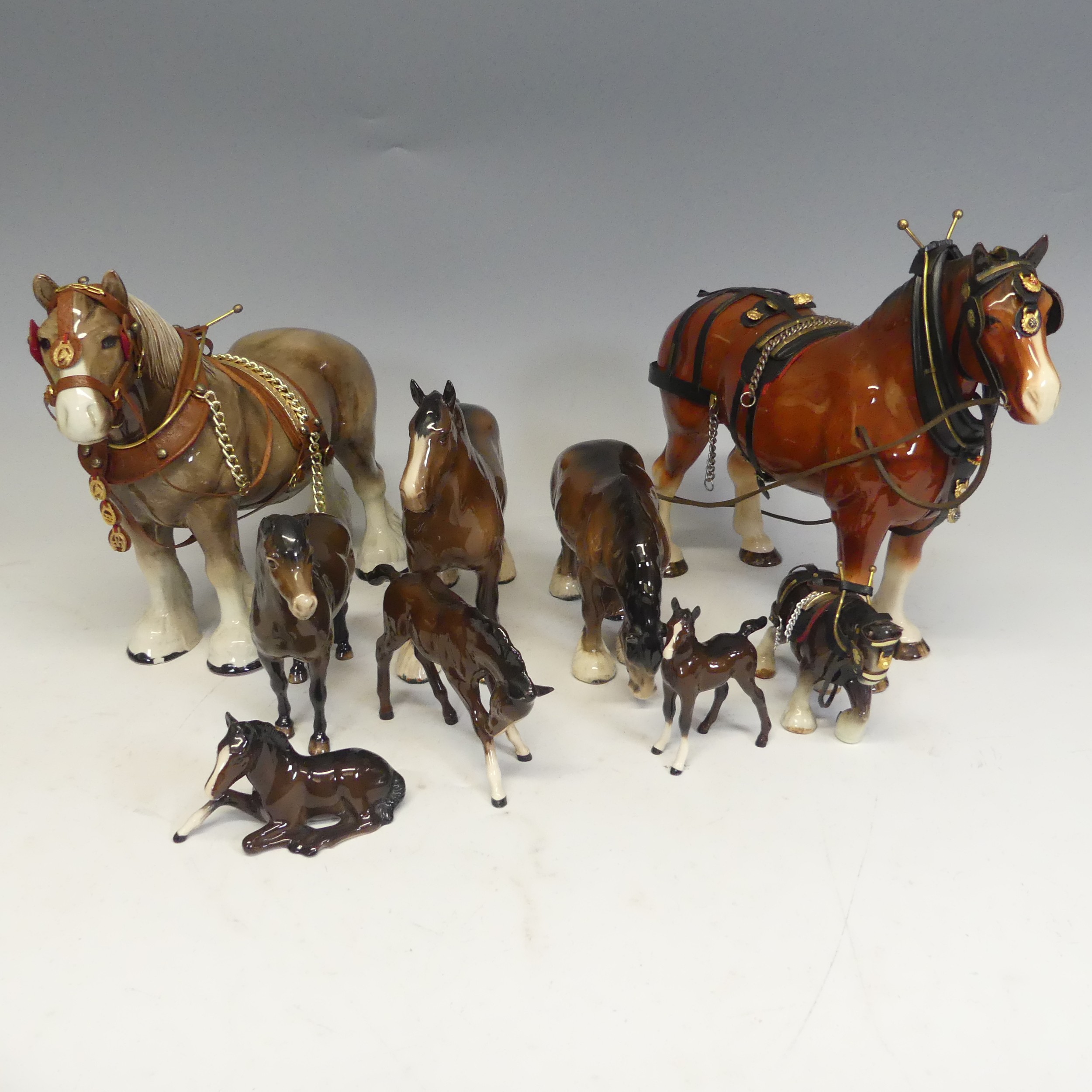 A group of six Beswick Horses, one laying foal marked '915' another 'Exmoor', and four more, together with two large shire horses and another smaller, unmarked, (largest) W 35 cm x H 30 cm x D 14 cm. (9)