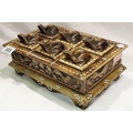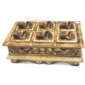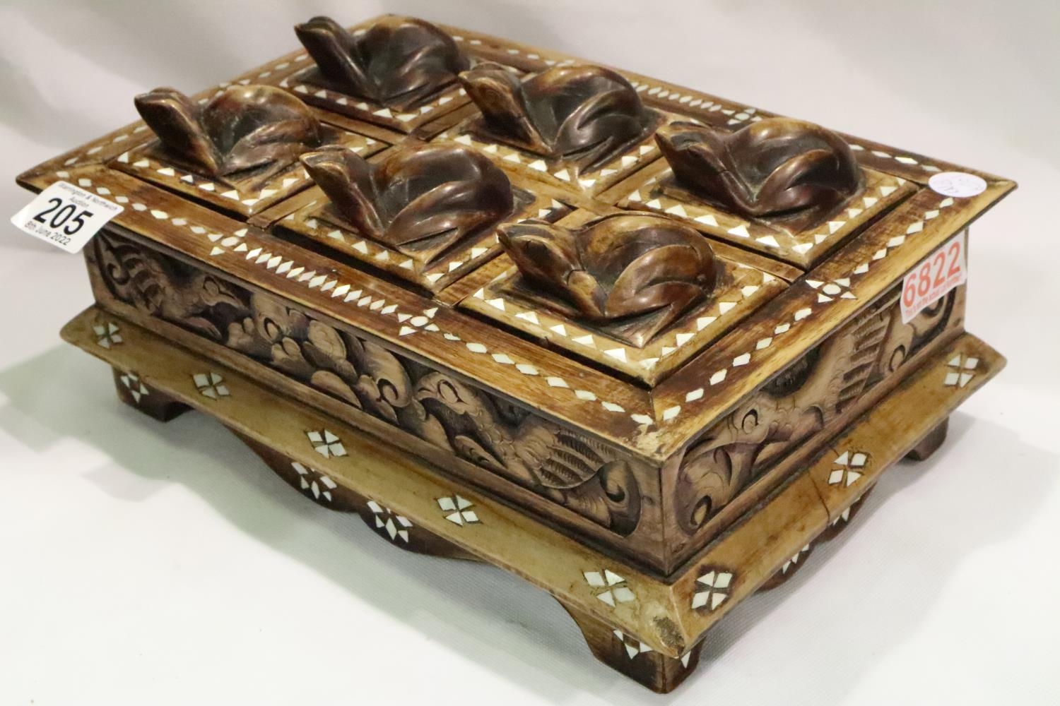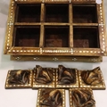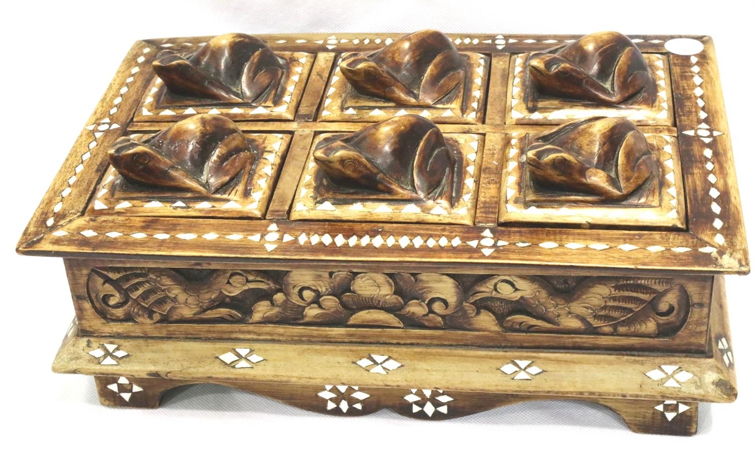 Inlaid box with eight small frog lids, 20 x 3 cm. P&P Group 2 (£18+VAT for the first lot and £3+VAT for subsequent lots)