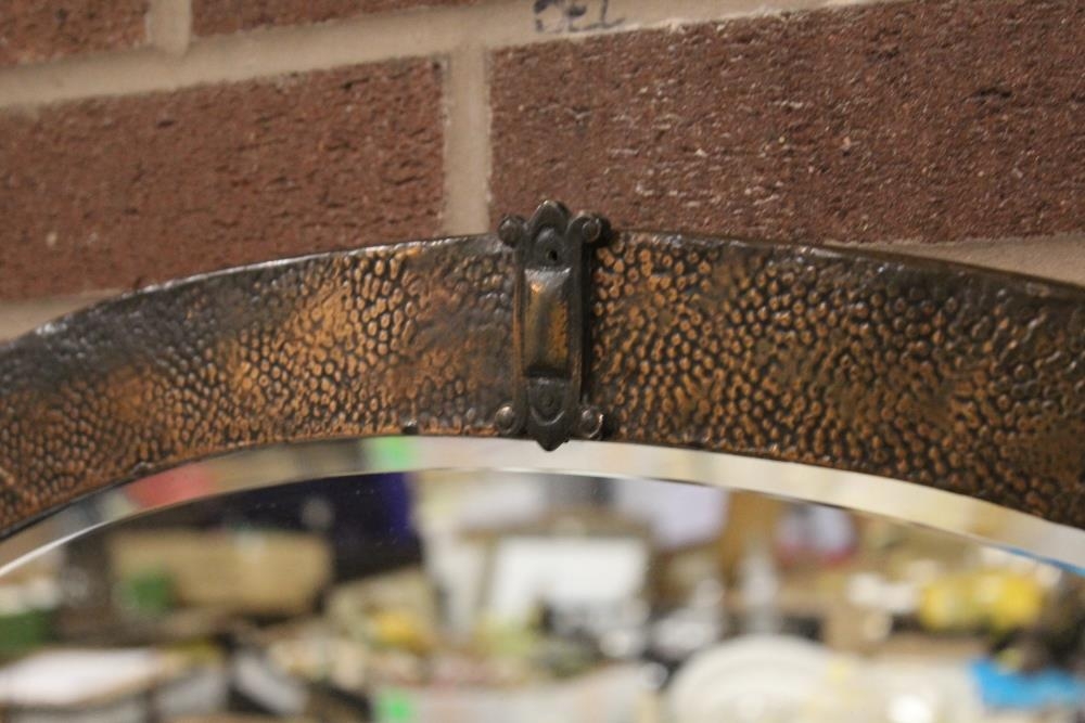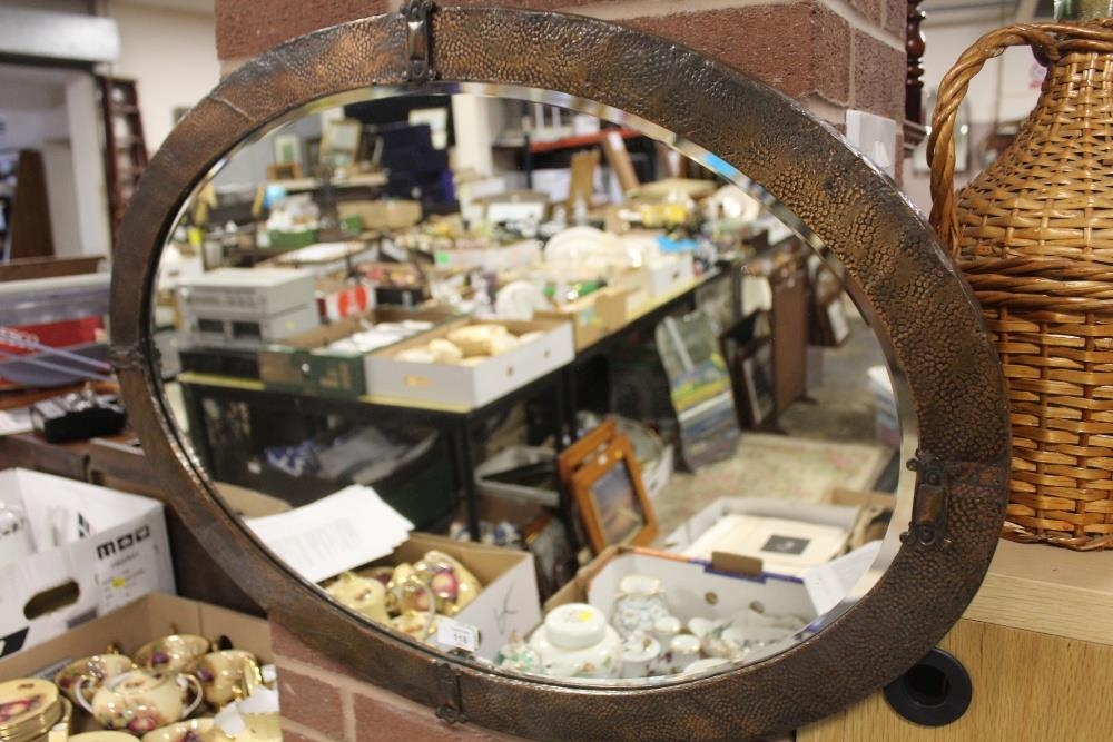A COPPER FRAMED ARTS AND CRAFTS STYLE OVAL WALL MIRROR - OVERALL 60CM X 86CM